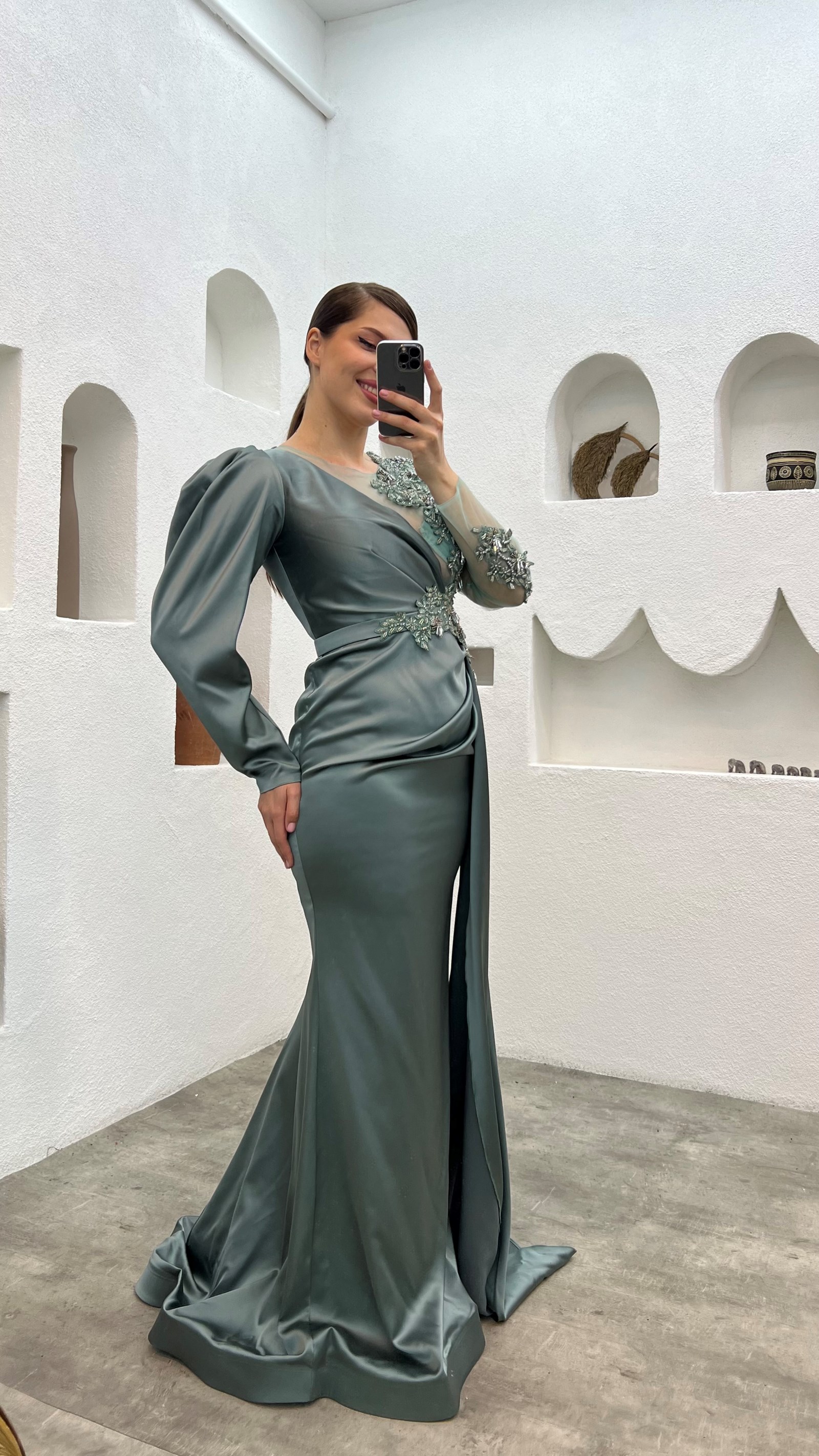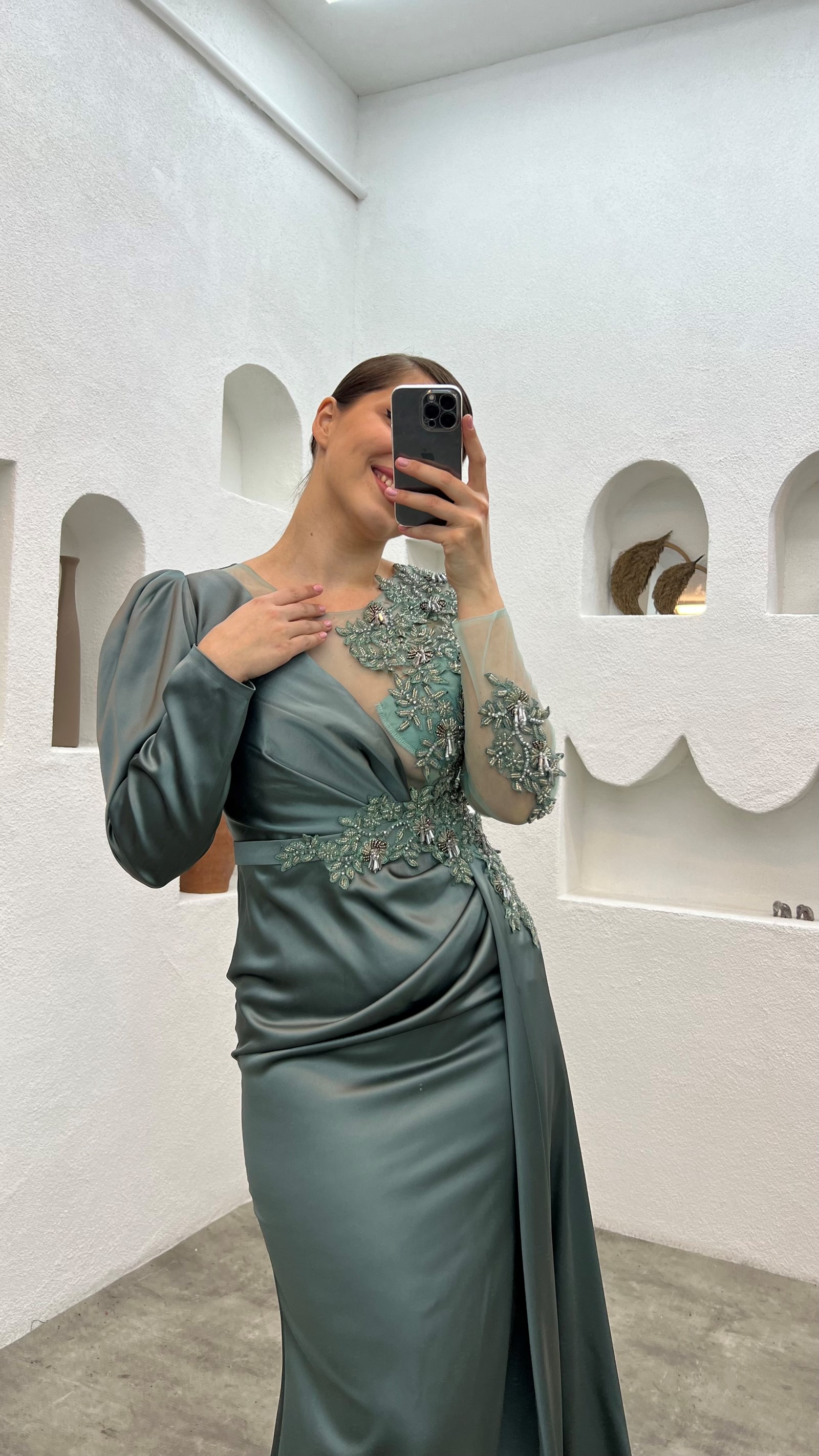Mint Yeşili Tek Kolu Tül Detay İşlemeli Büyük Beden Abiye Elbise