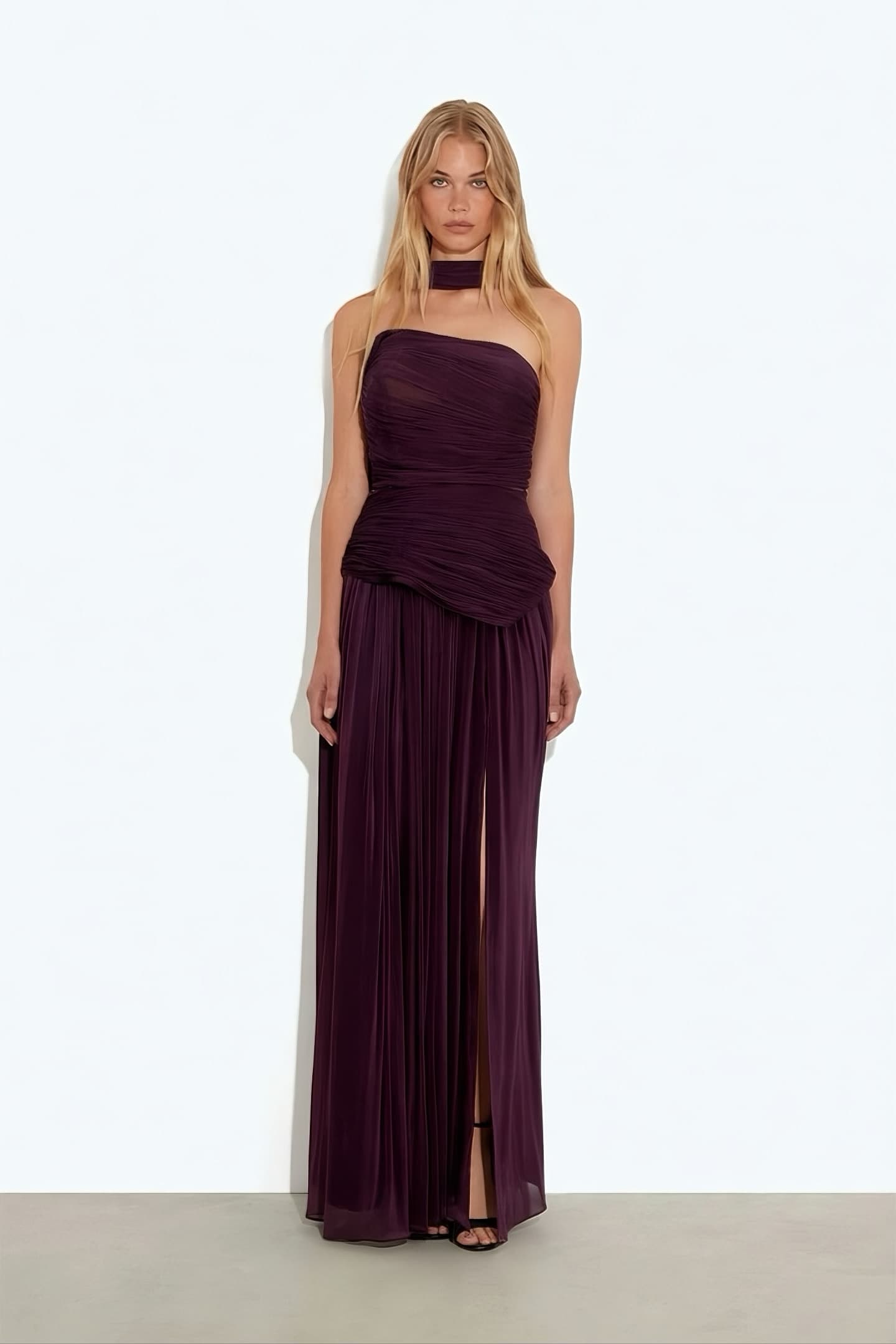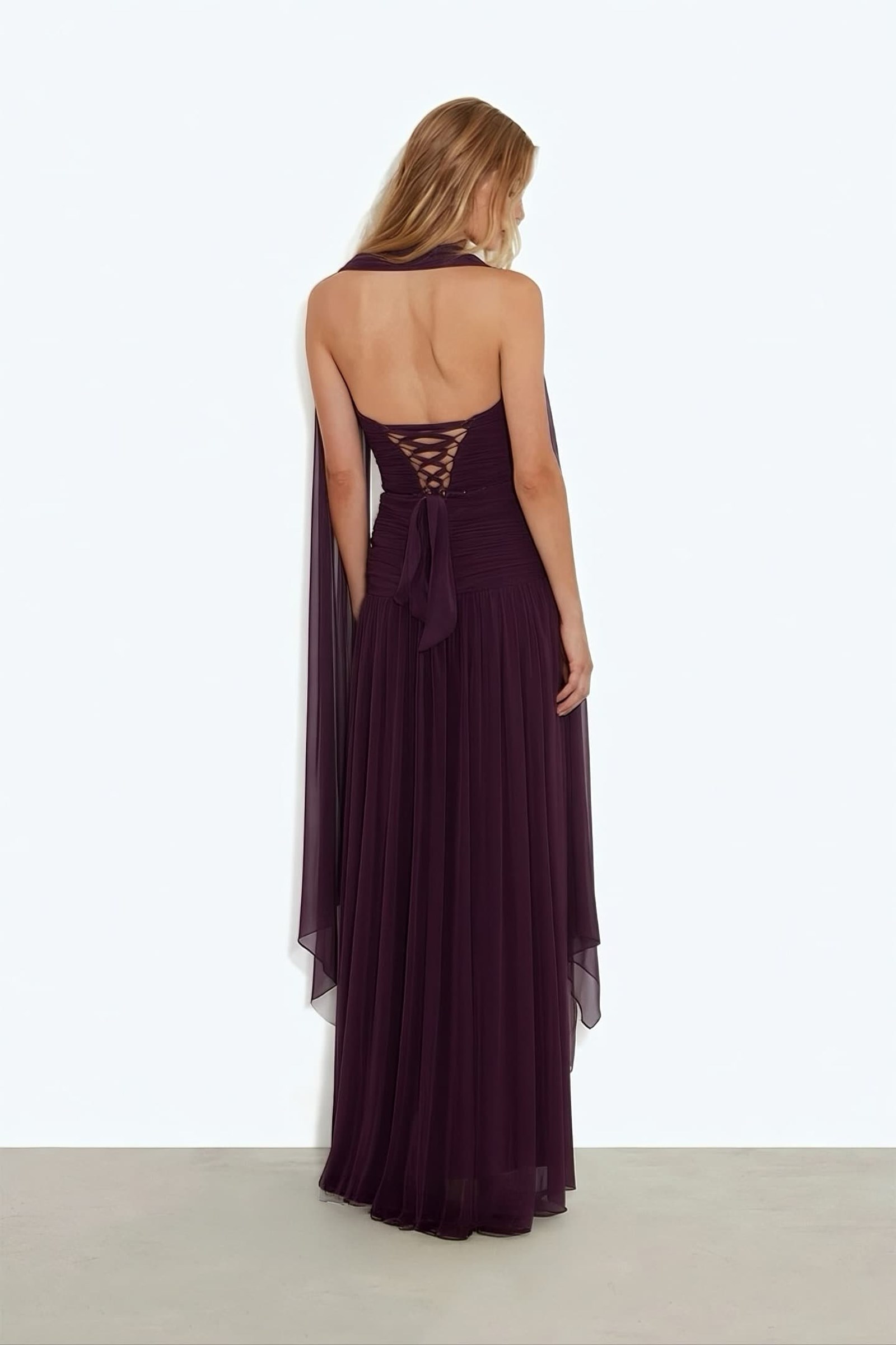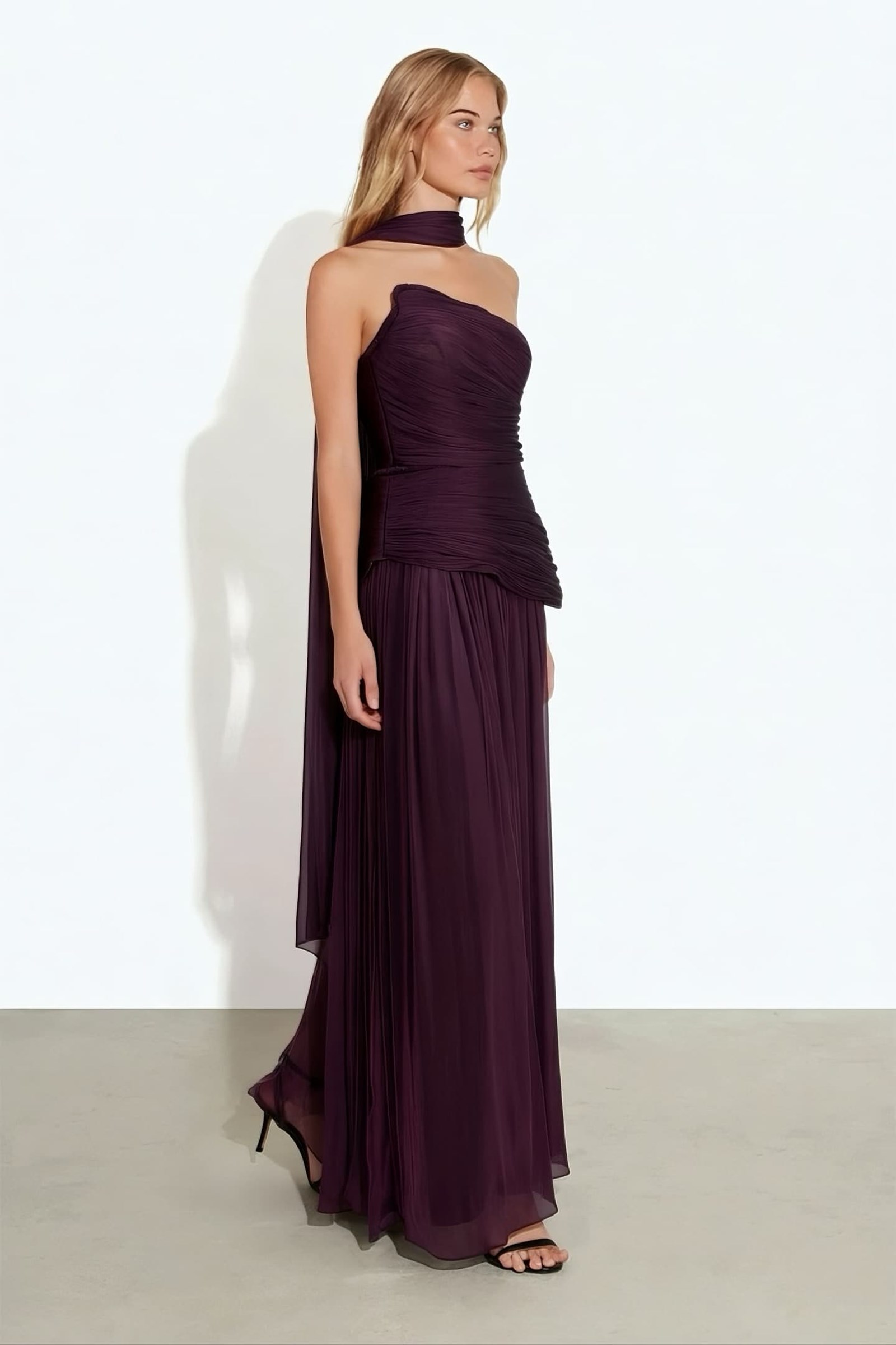 • Mor Asimetrik Kesim Pileli Abiye Elbise