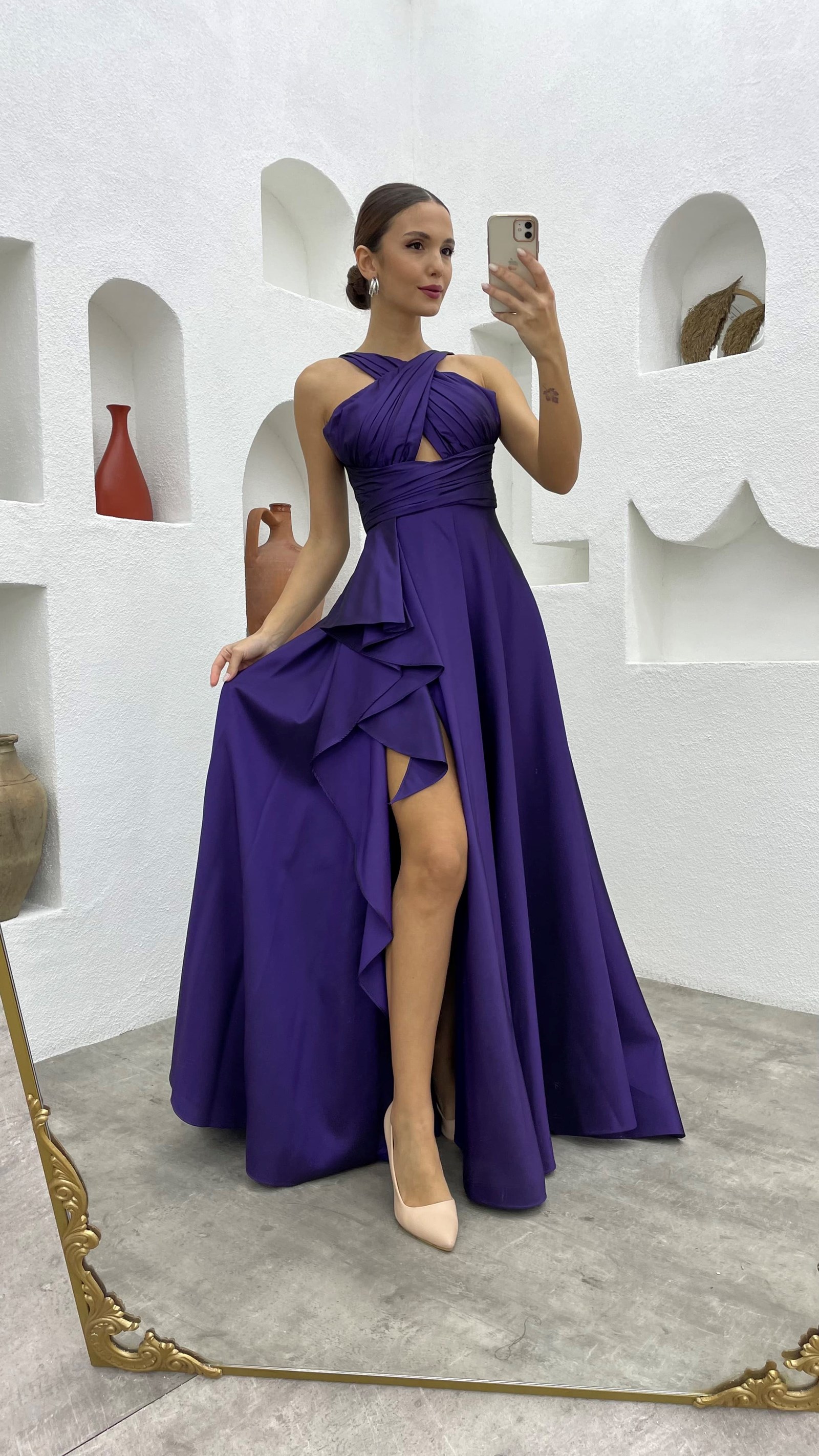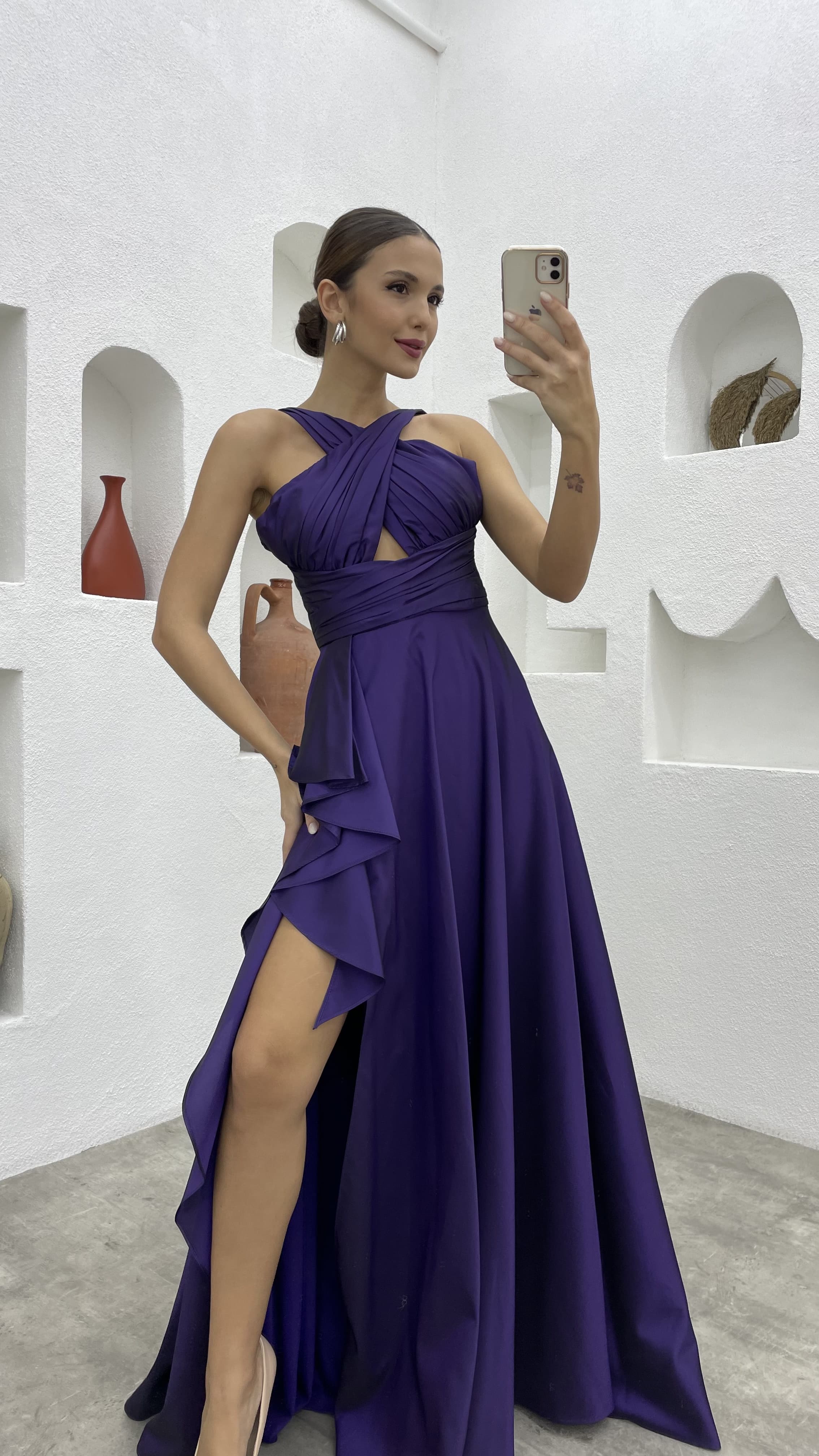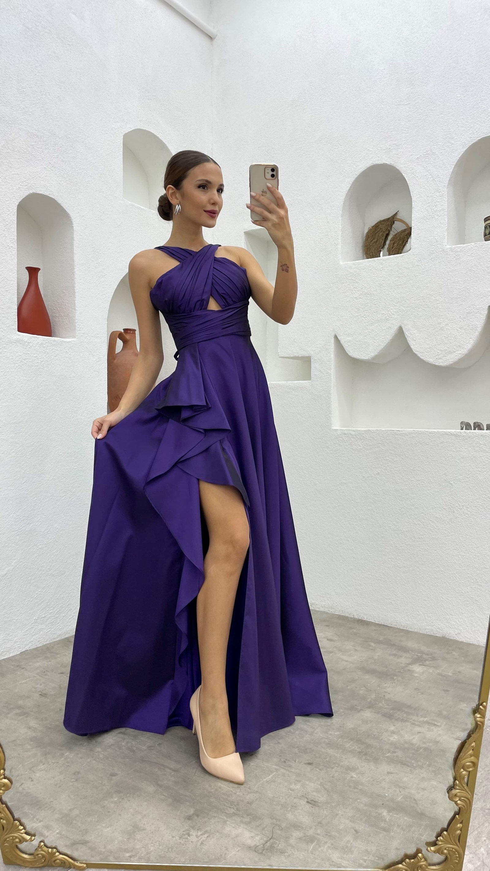 Mor Drapeli Volanlı Tafta Abiye Elbise