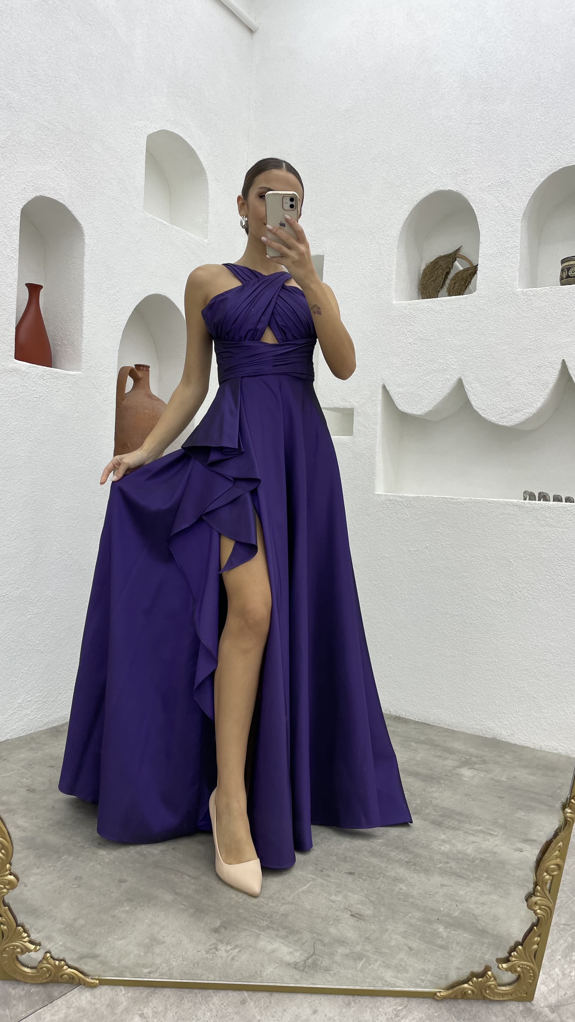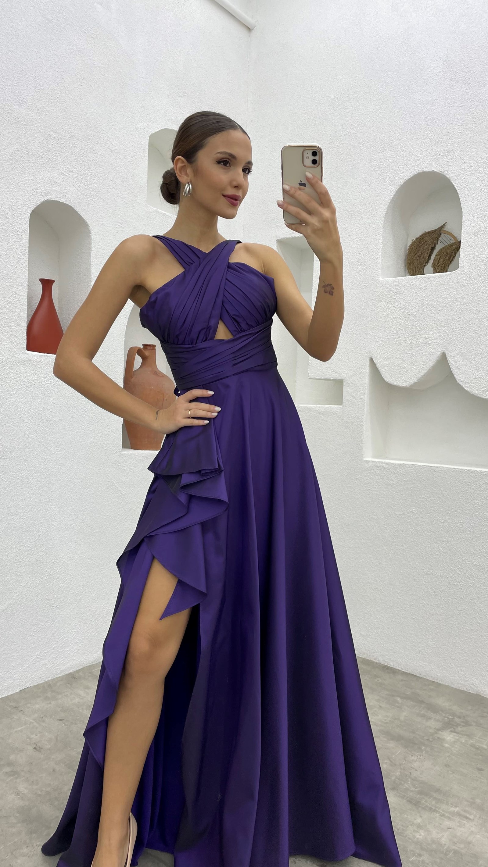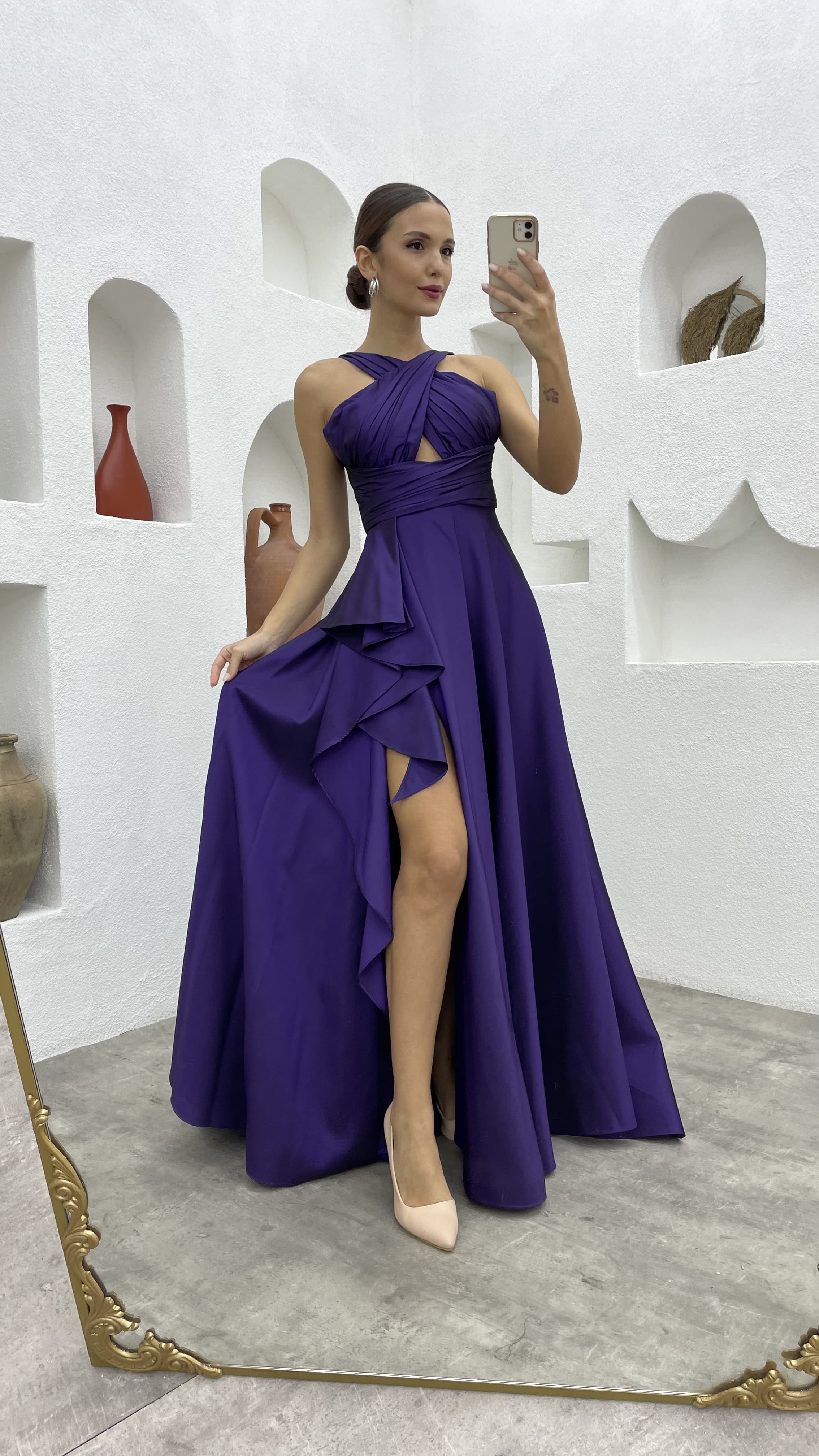 Mor Drapeli Volanlı Tafta Abiye Elbise