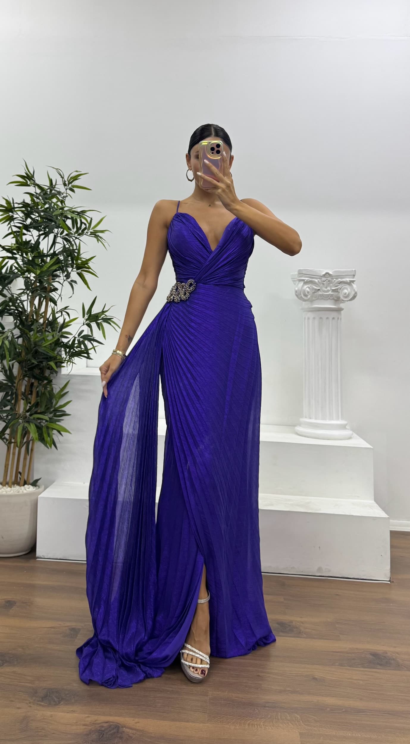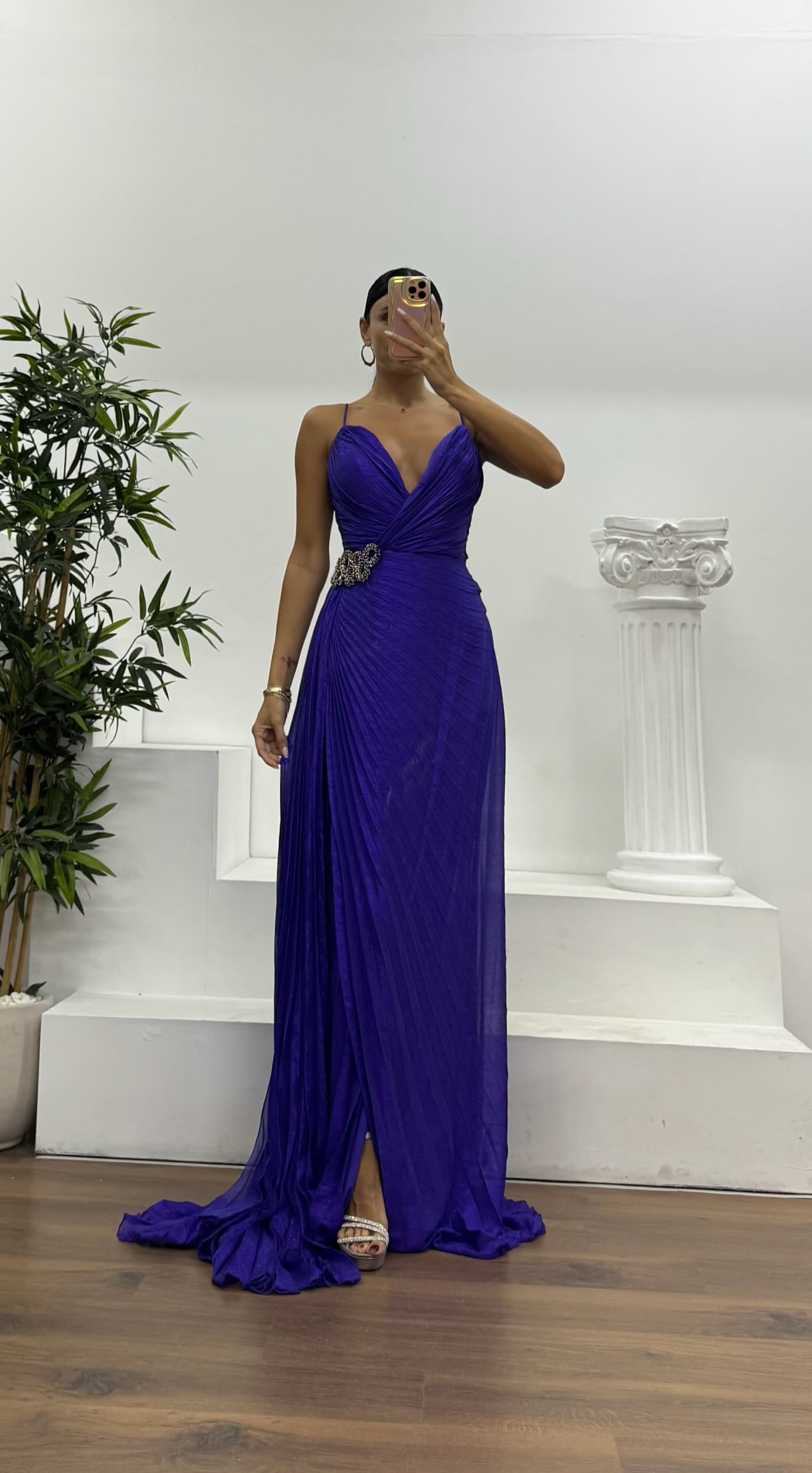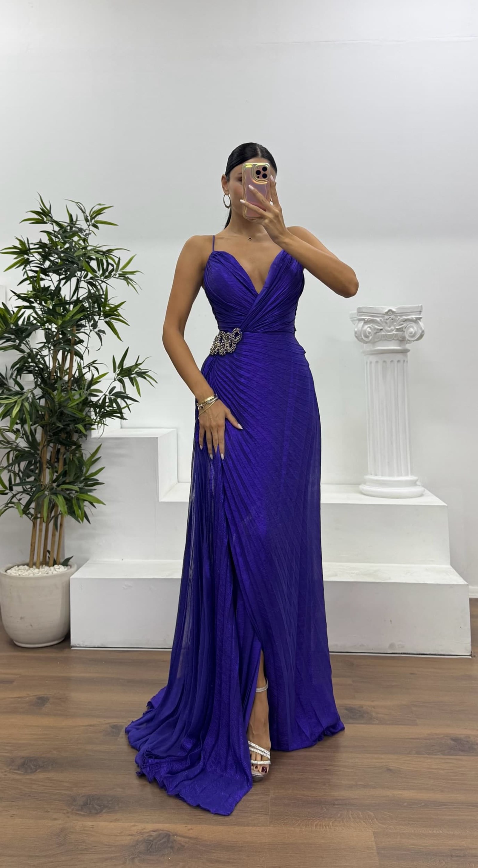 • Mor İp Askılı Bel Detay Abiye Elbise