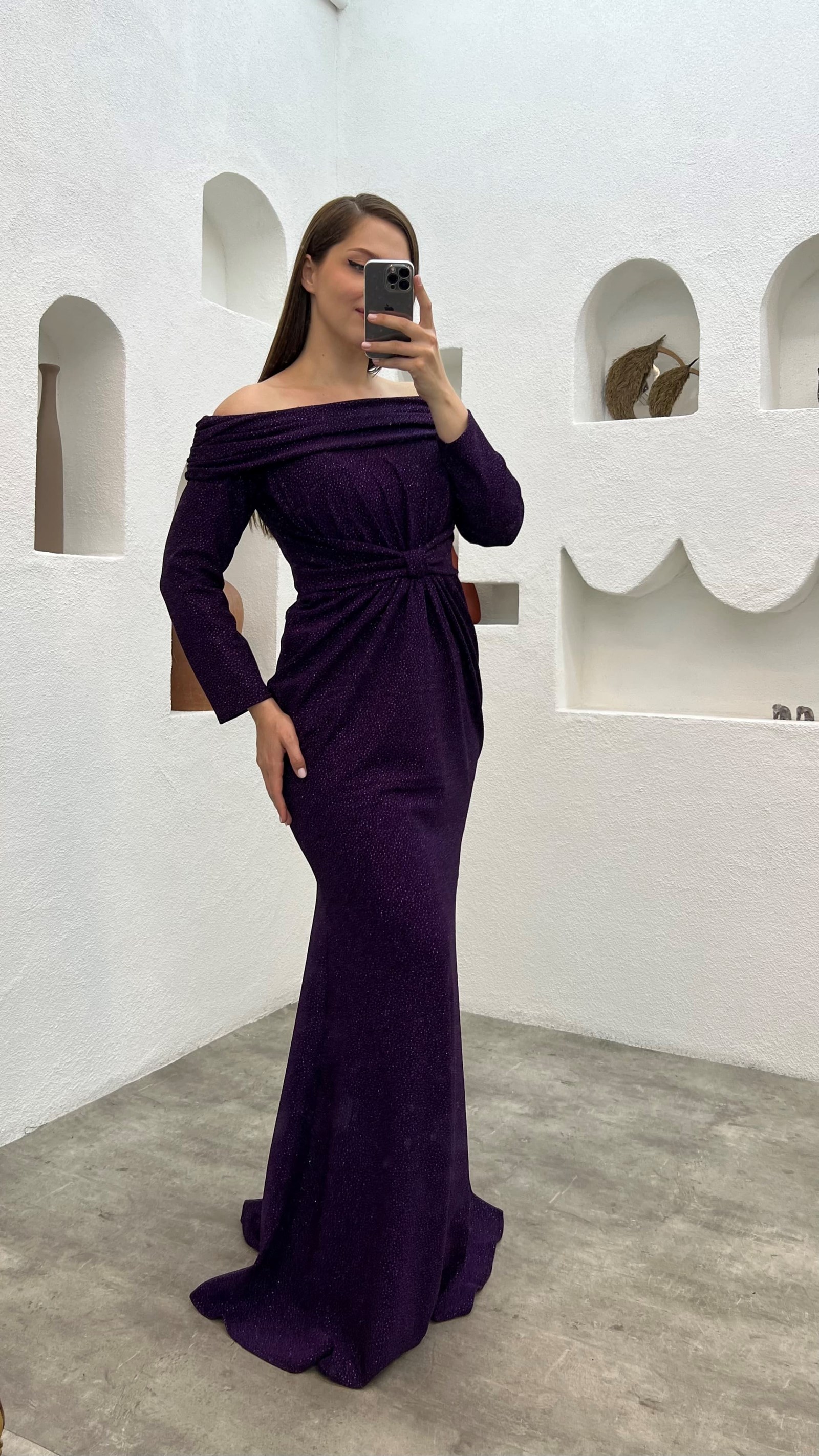 • Mor Kayık Yaka Beli Büzgülü Büyük Beden Abiye Elbise