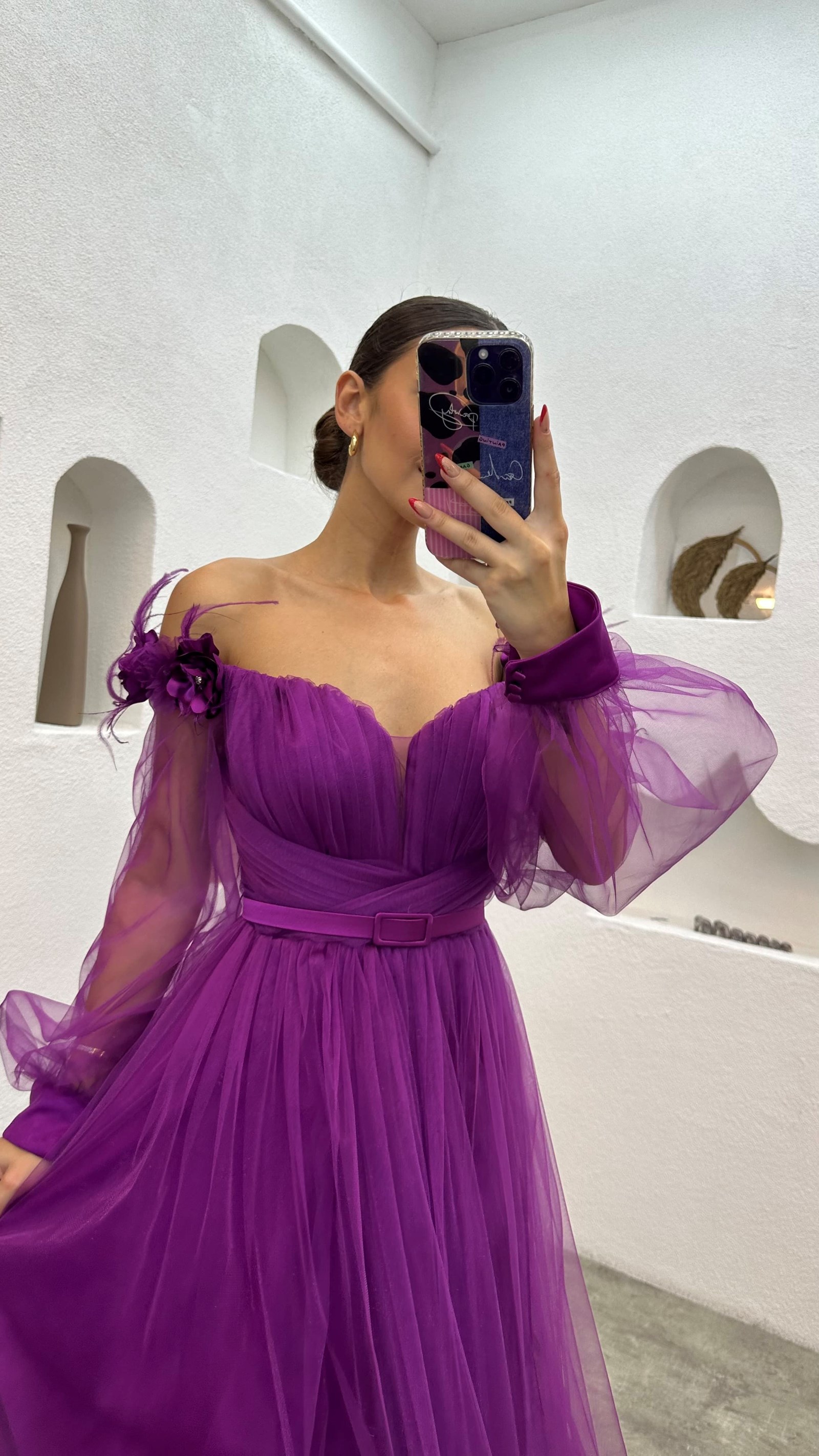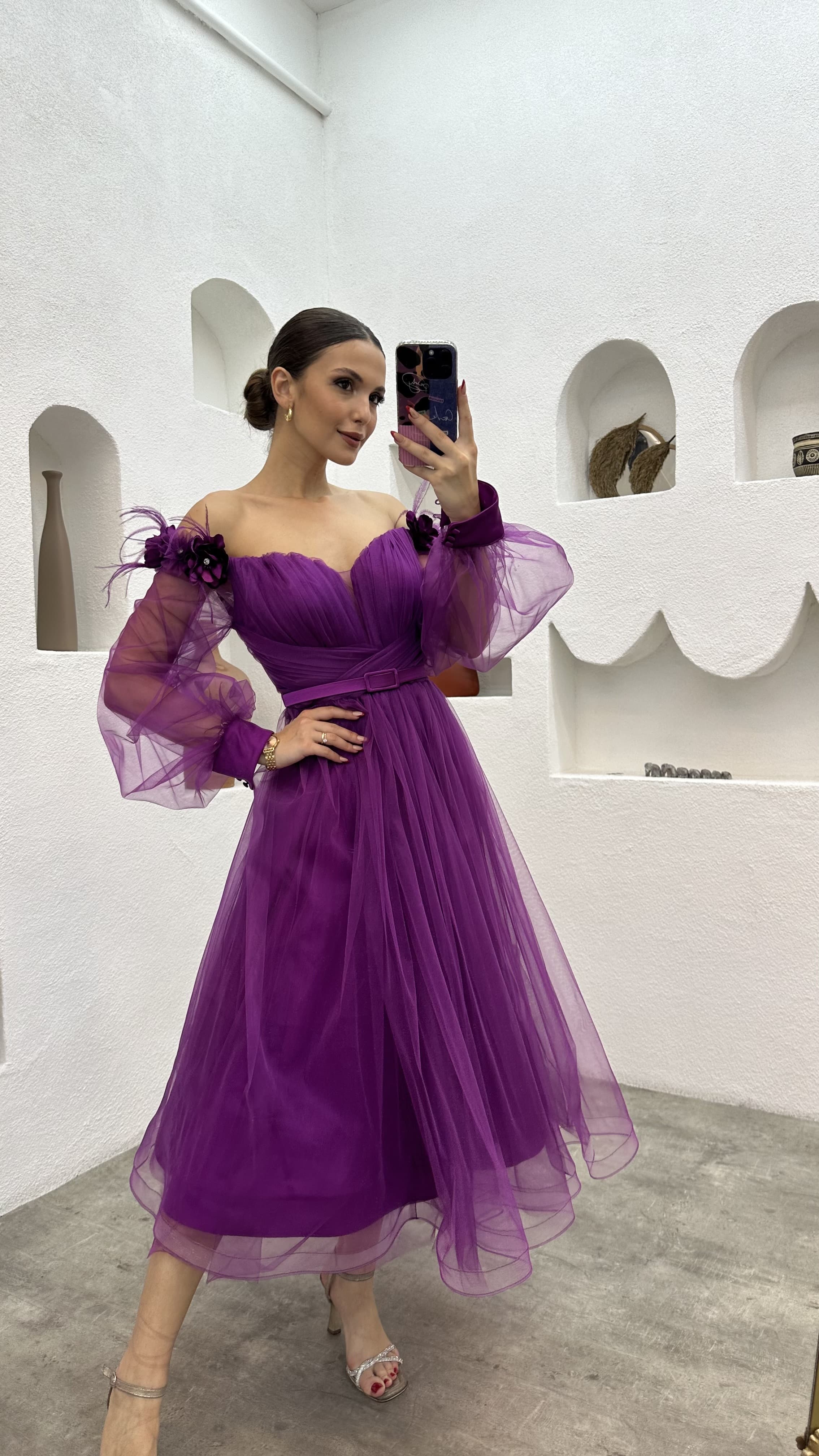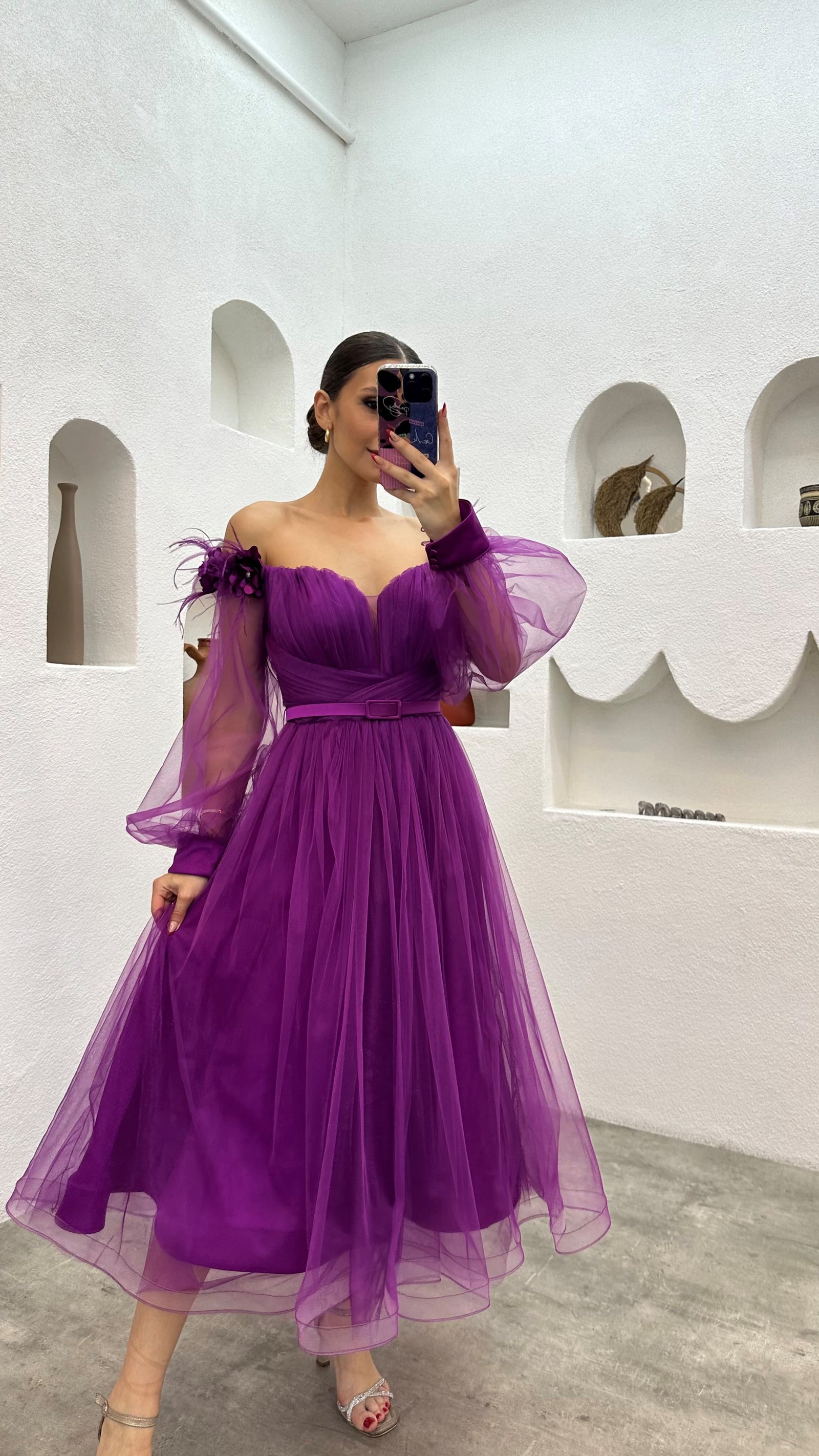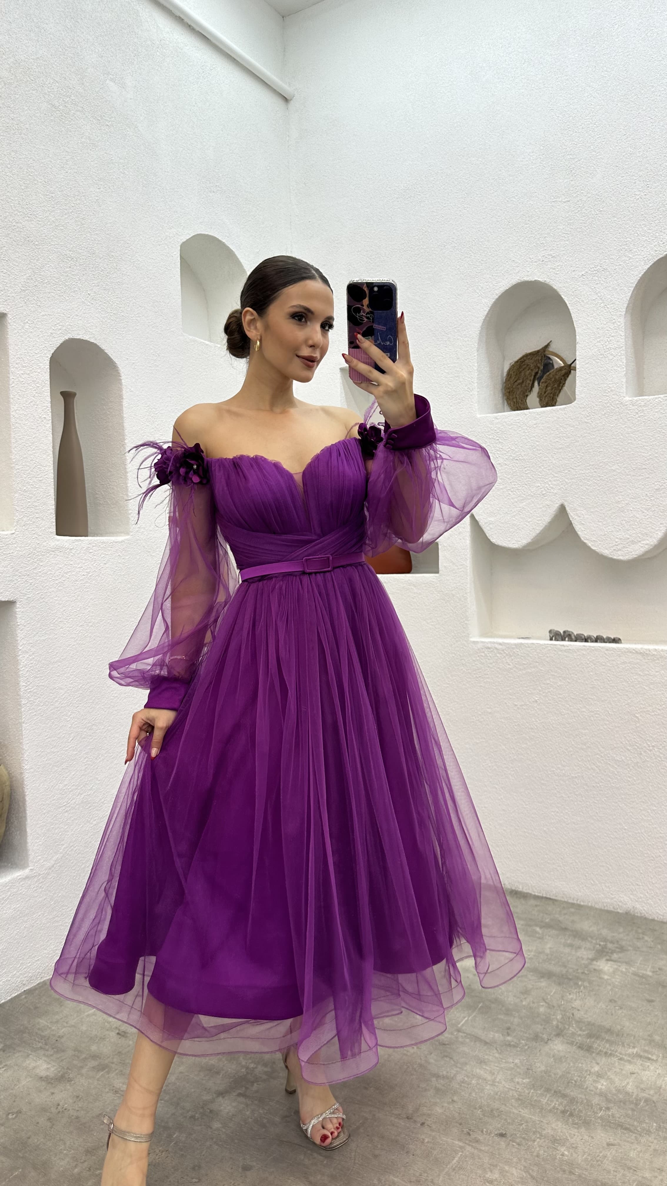 Mor Midi Boy Omuzları Çiçekli Kemerli Tül Abiye Elbise