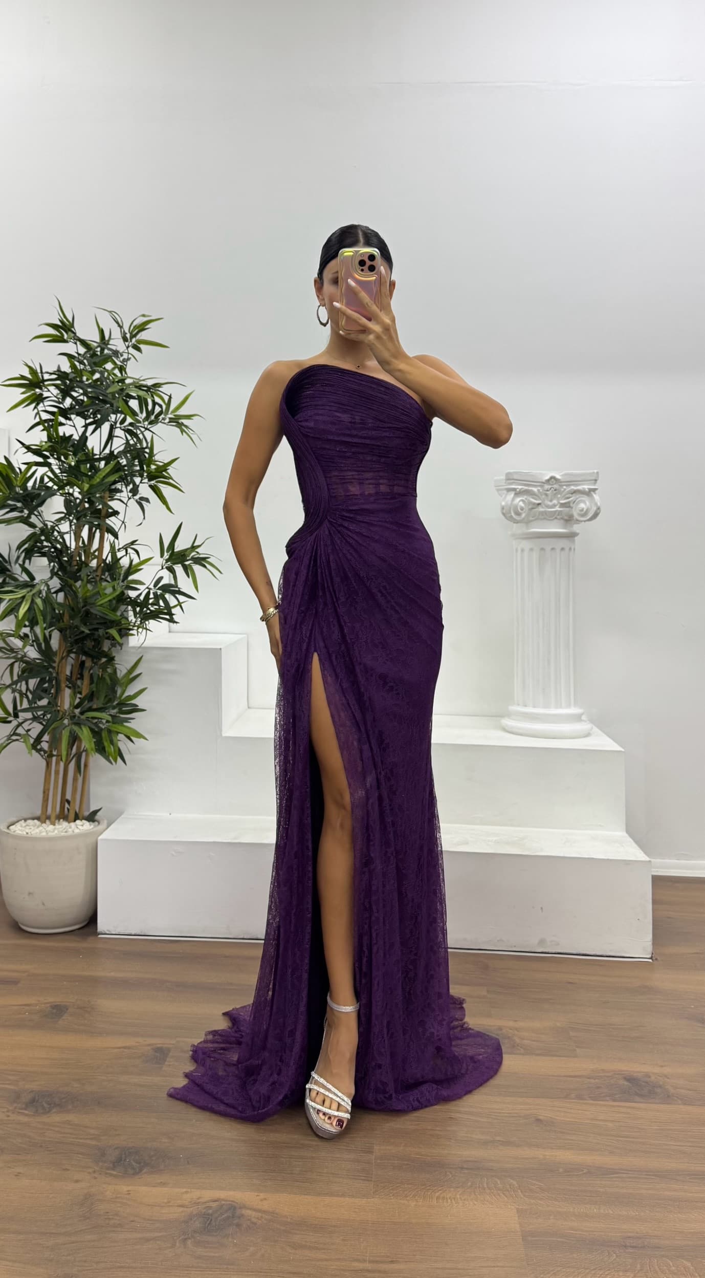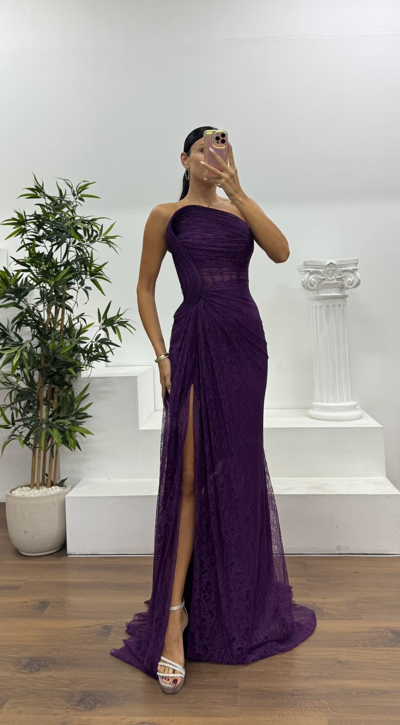 • Koyu Lila Straplez Bel Transparan Dantel Abiye Elbise