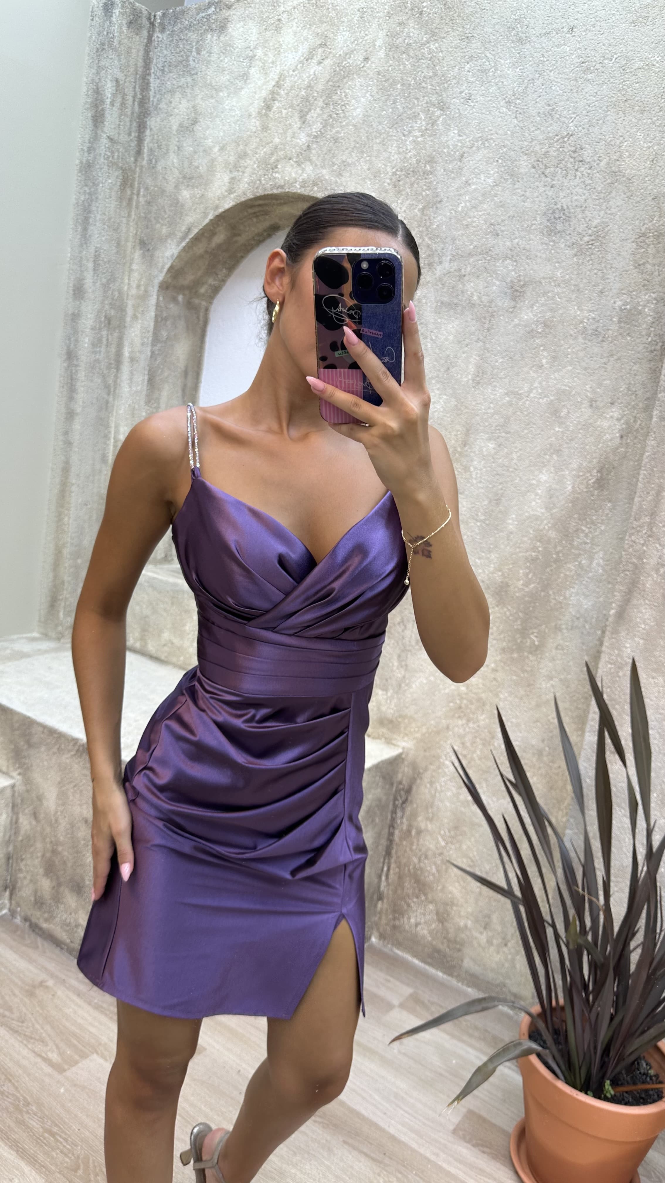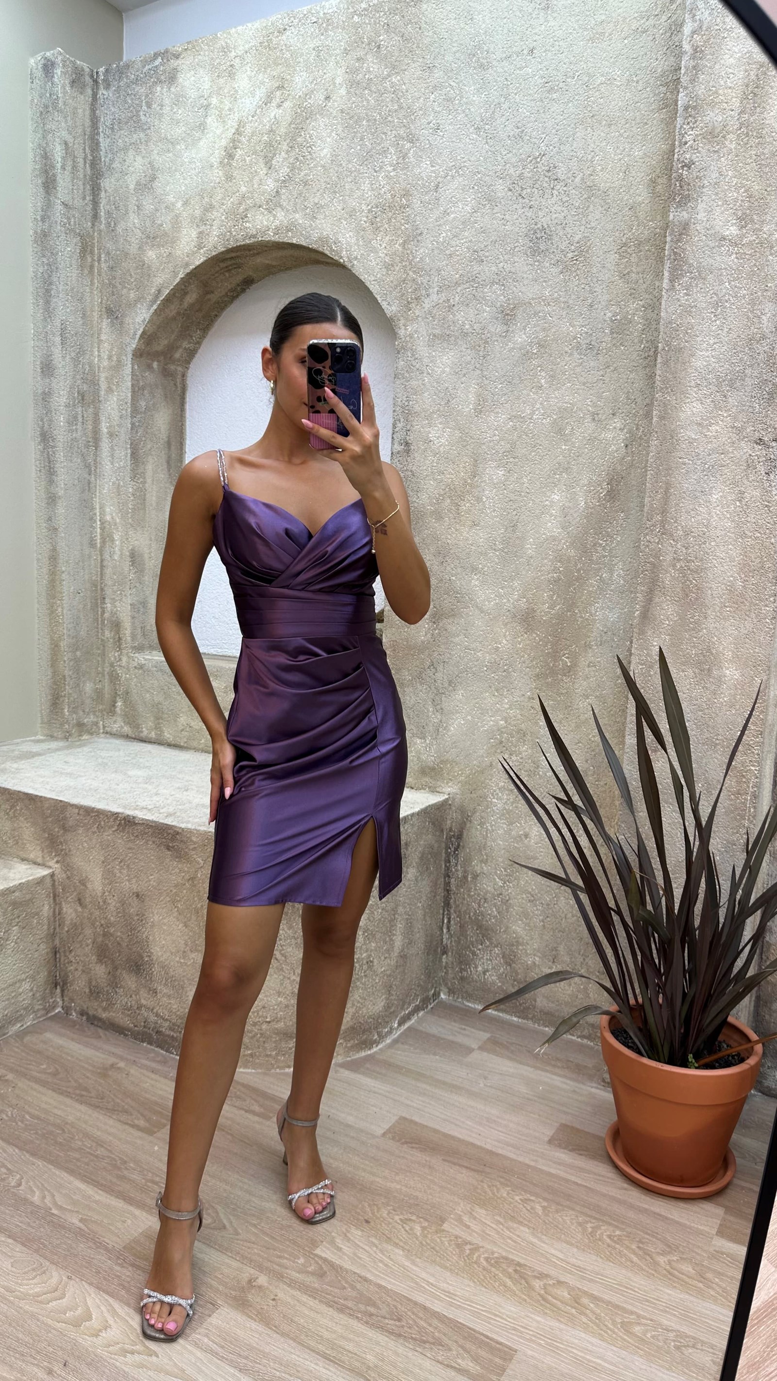 Mürdüm Drapeli Saten Mini Abiye Elbise