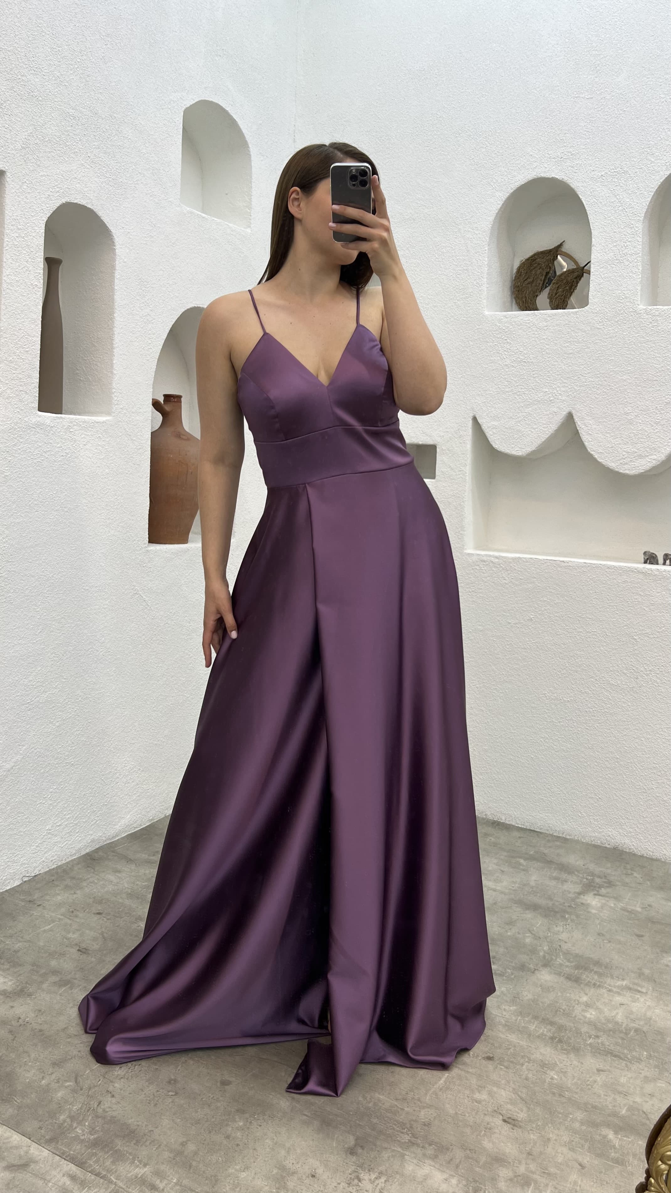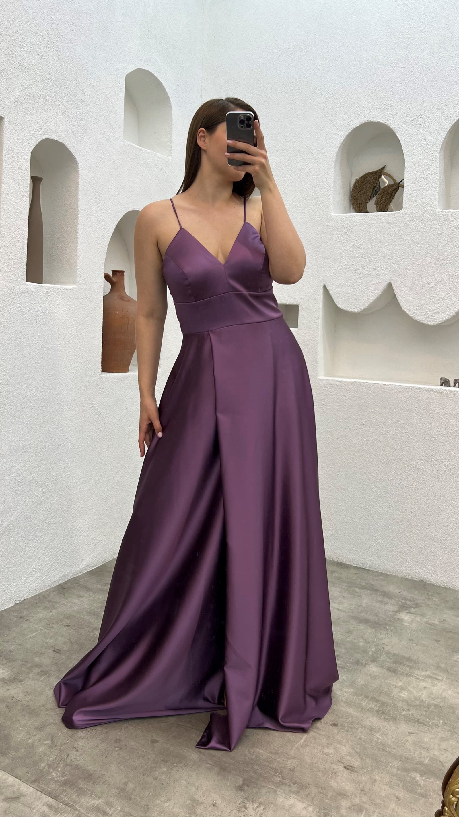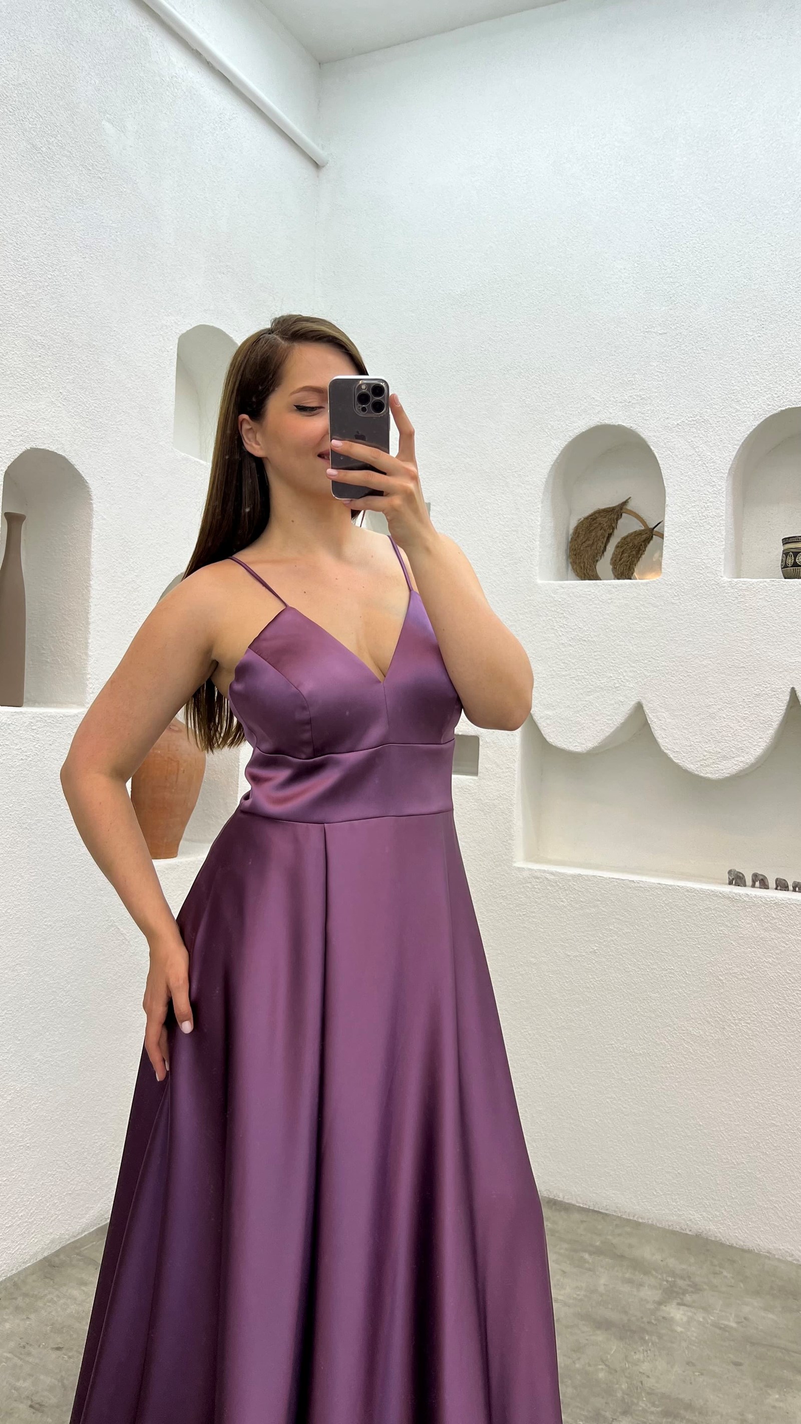 • Mürdüm İp Askılı Saten Büyük Beden Abiye Elbise