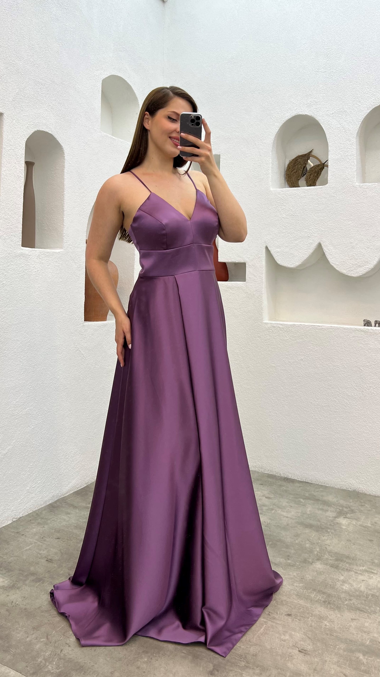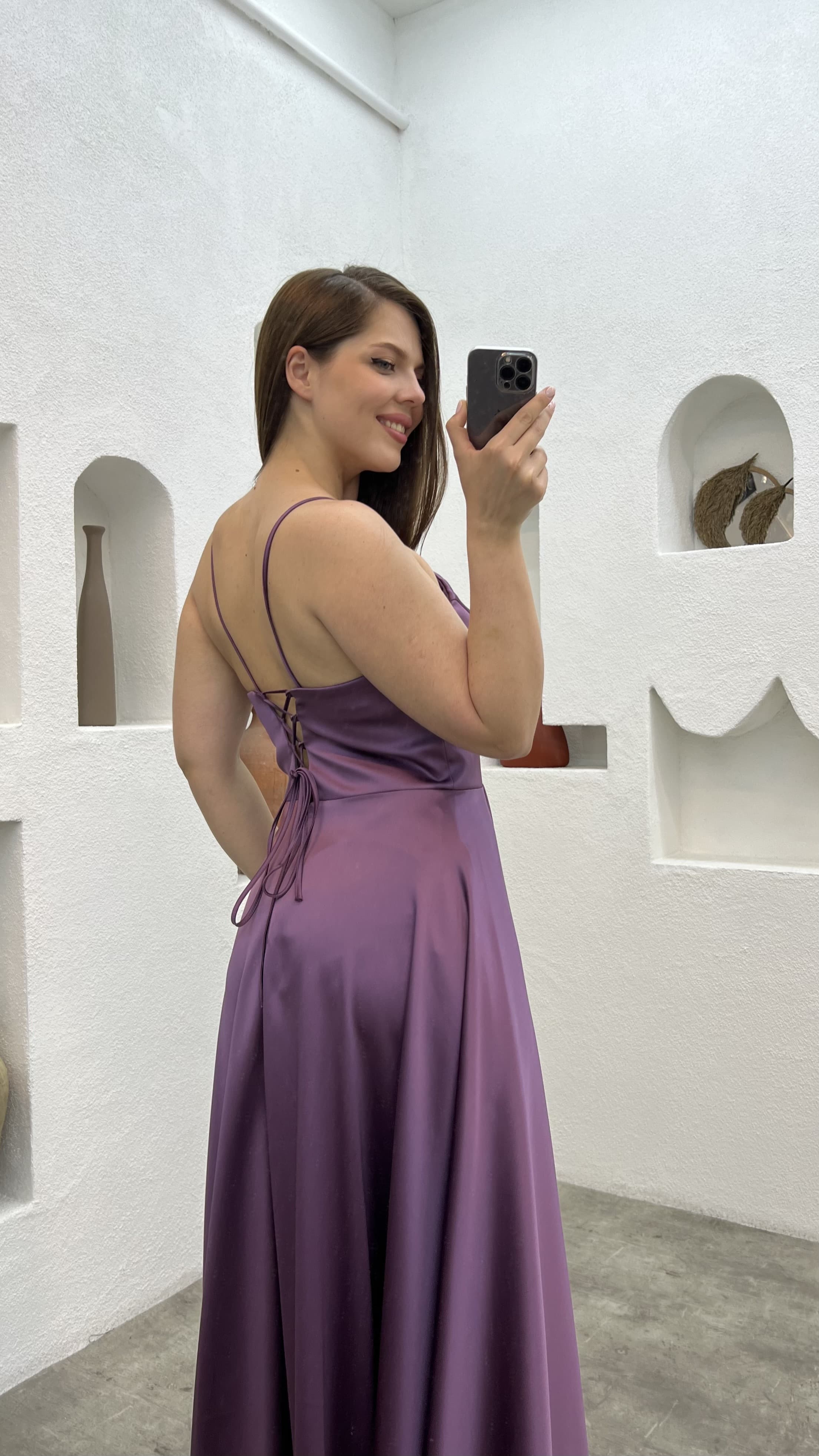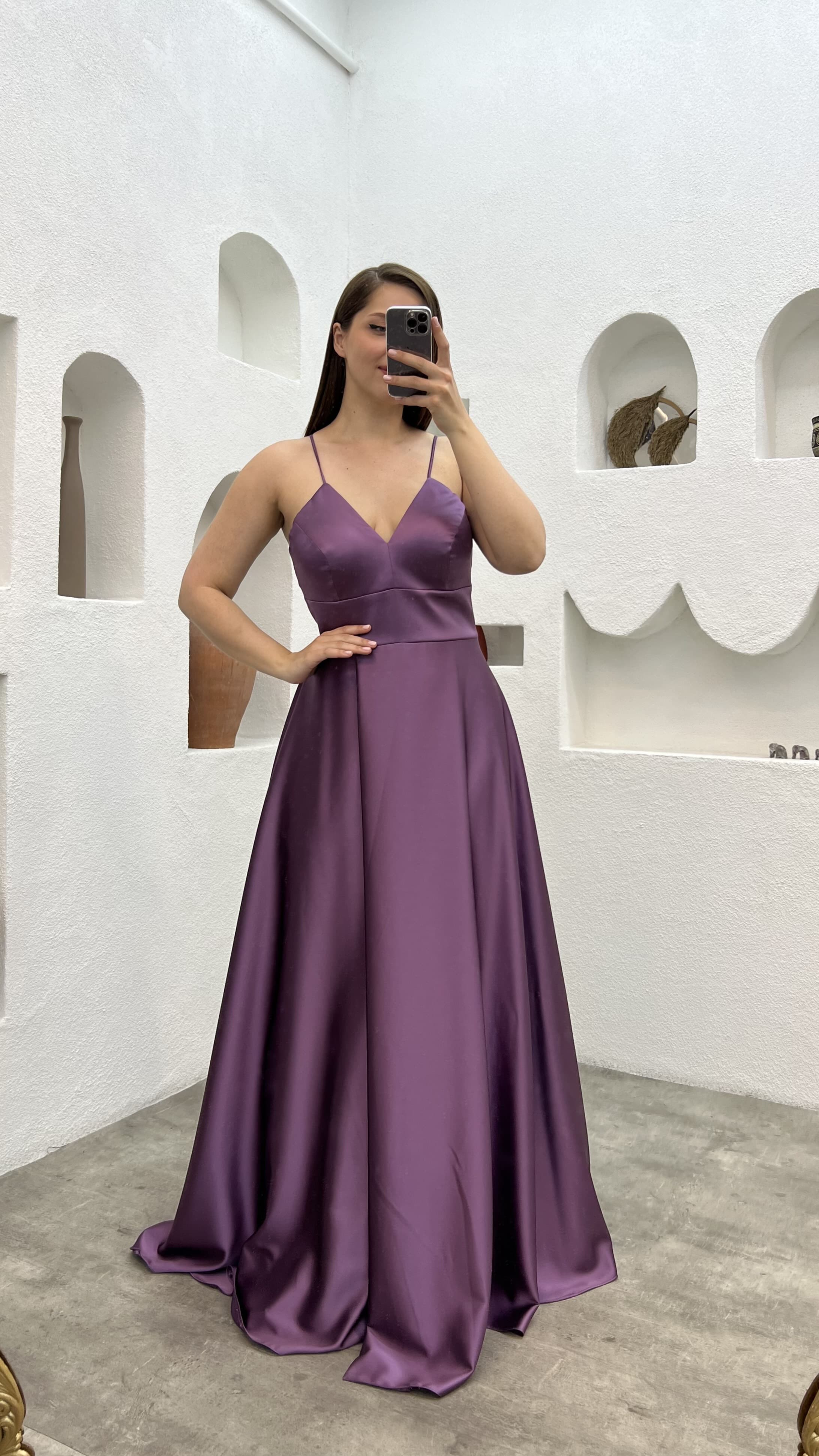 • Mürdüm İp Askılı Saten Büyük Beden Abiye Elbise