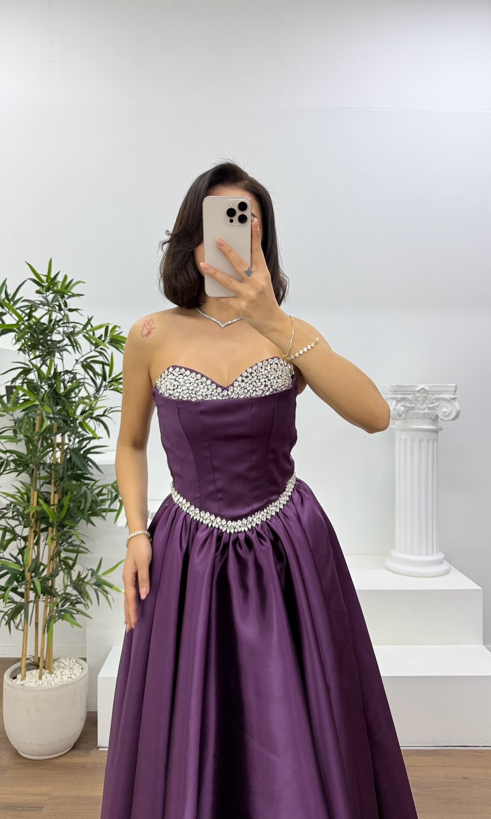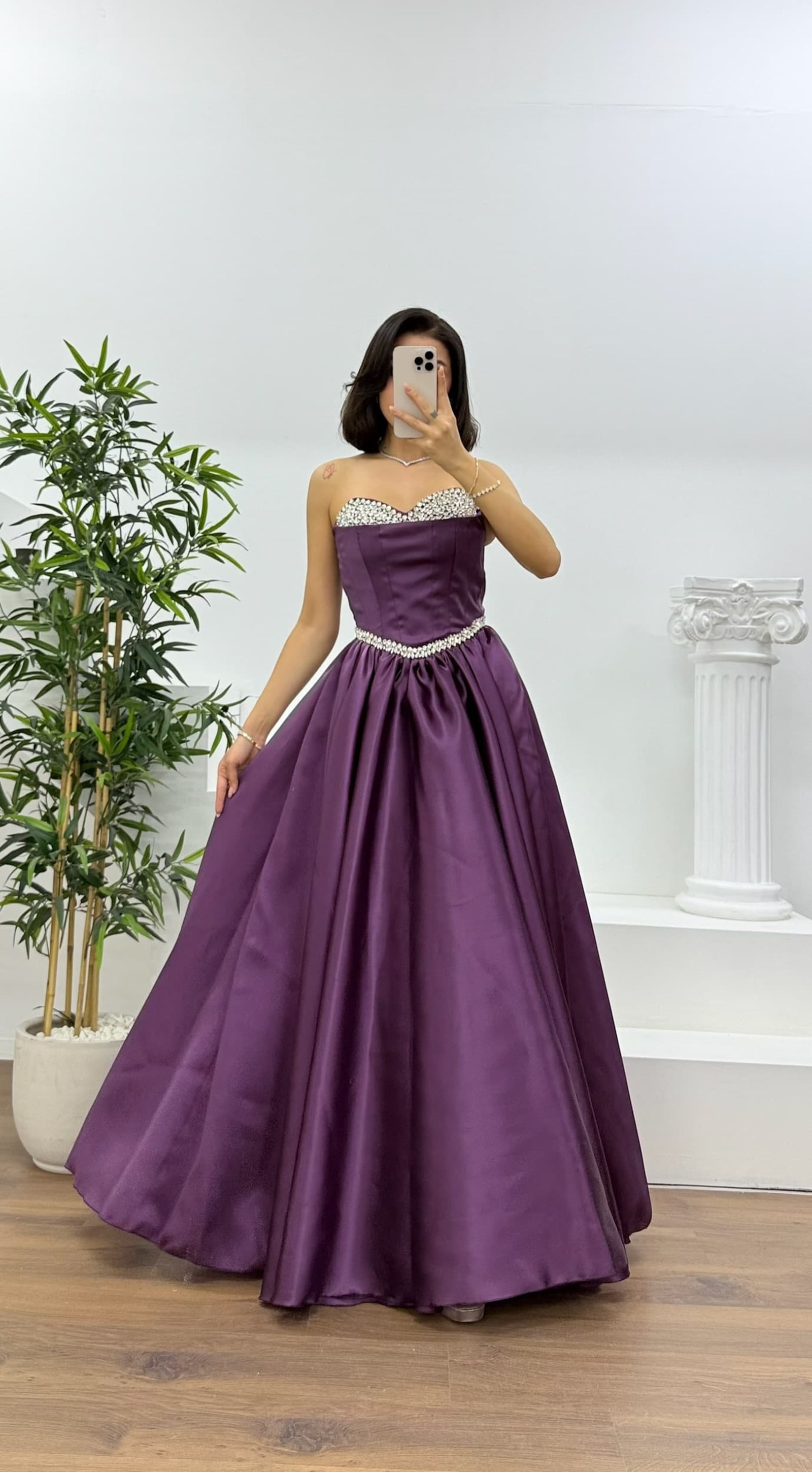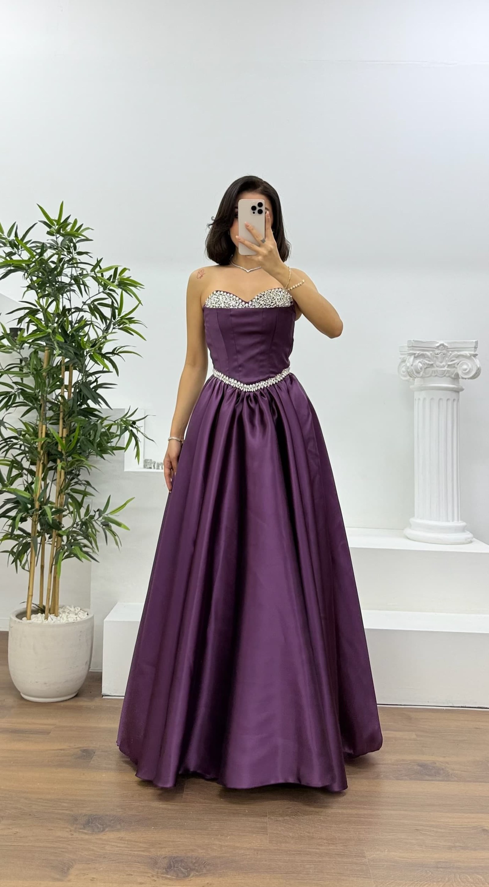 • Mürdüm Prenses Kesim Kabarık Taşlı Straplez Abiye Elbise