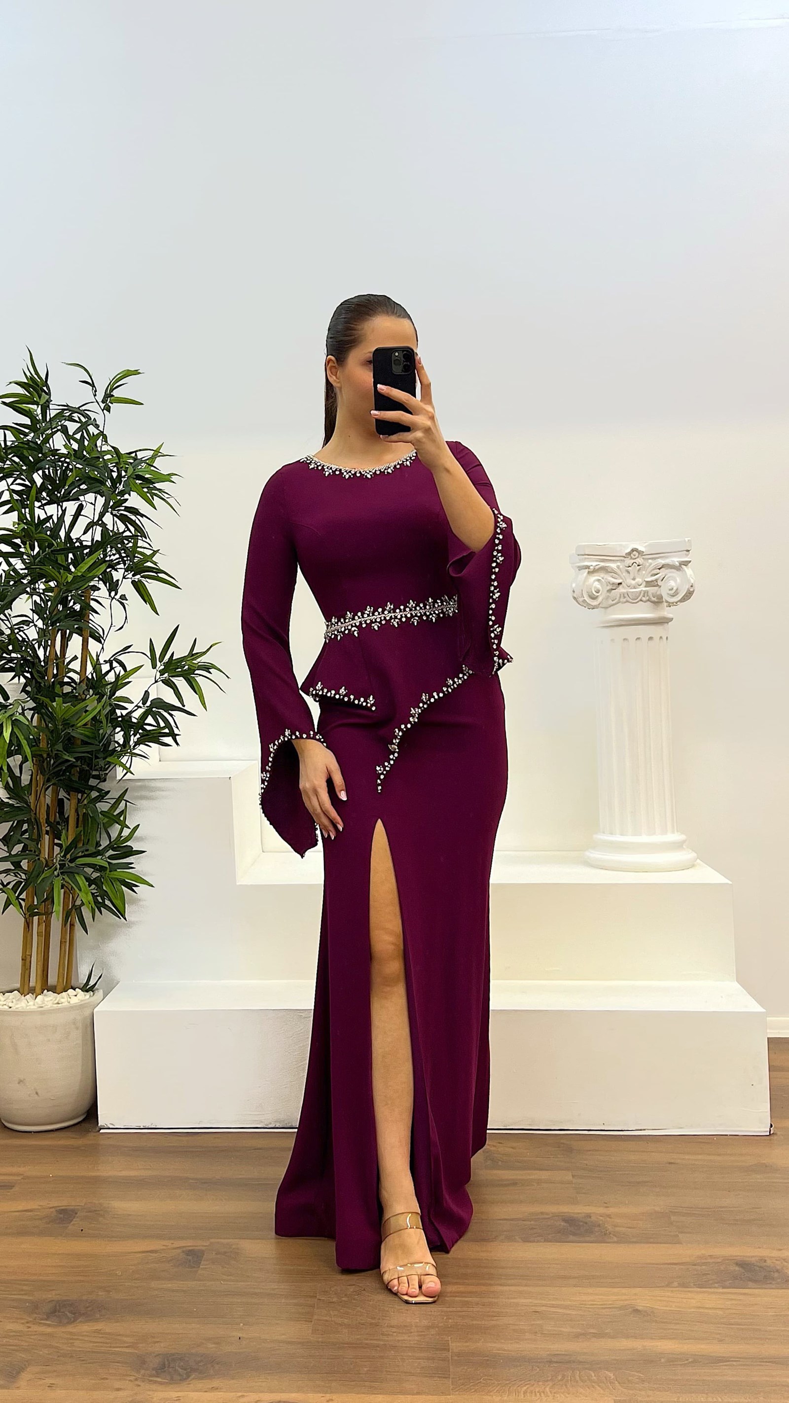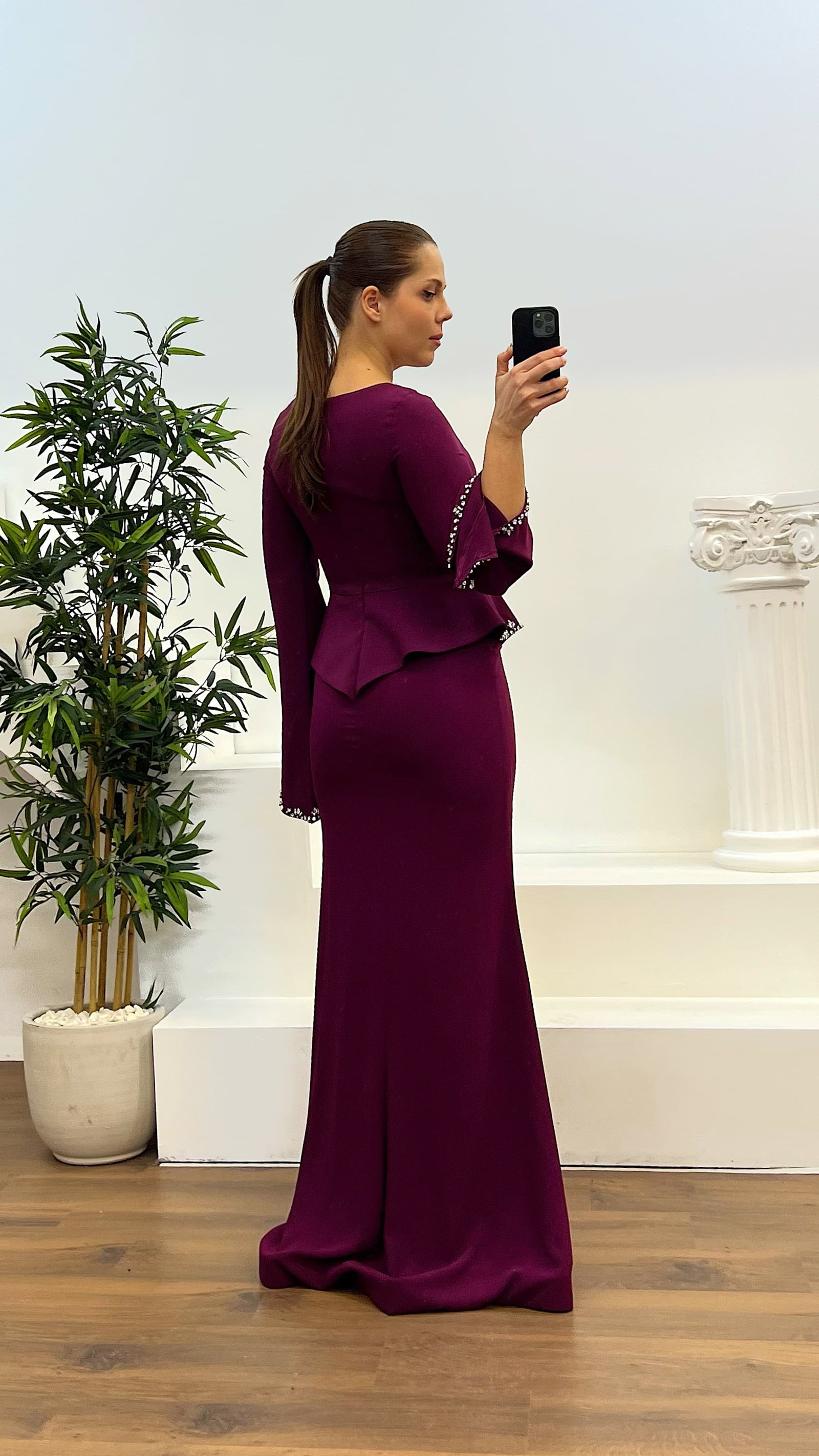 • Mürdüm Taş işlemeli Volanli Kol Detay Büyük Beden Tasarım Elbise