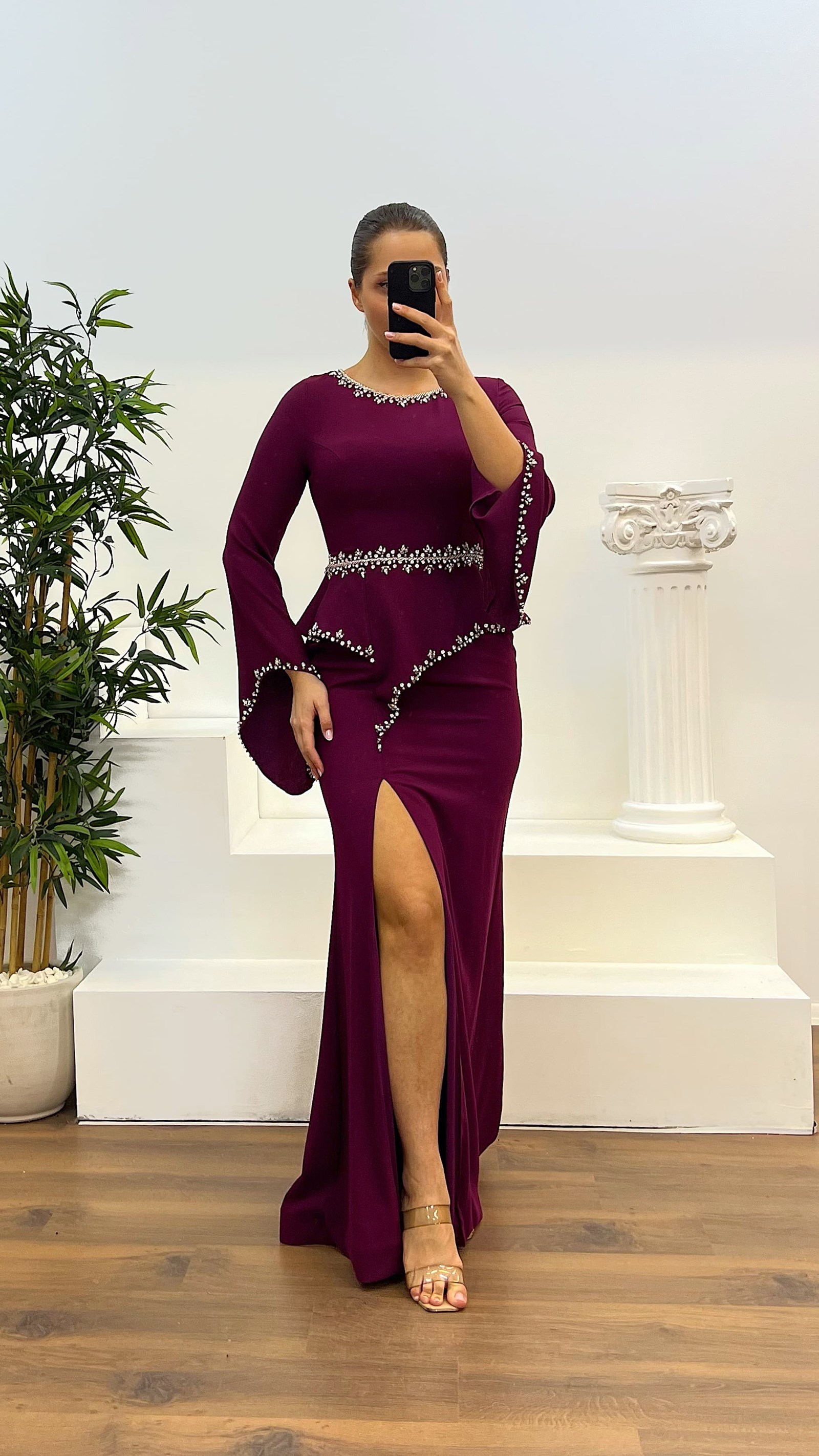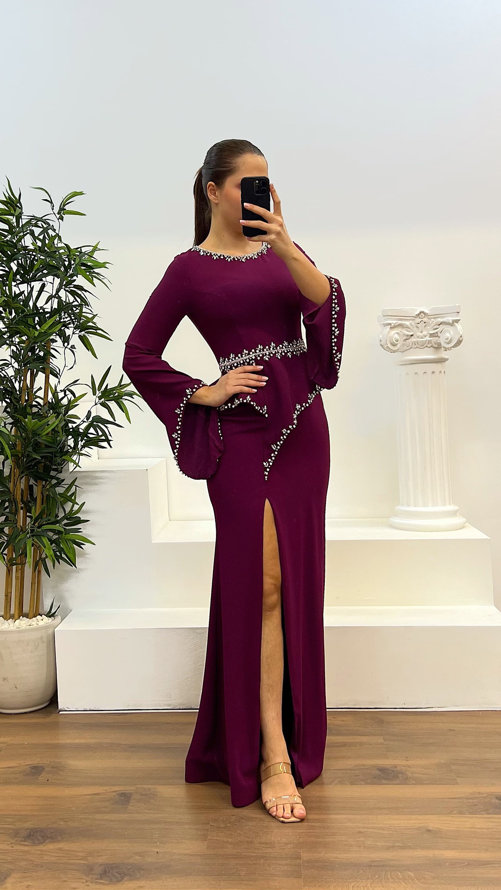 Taş işlemeli volanlı kol detay abiye elbise