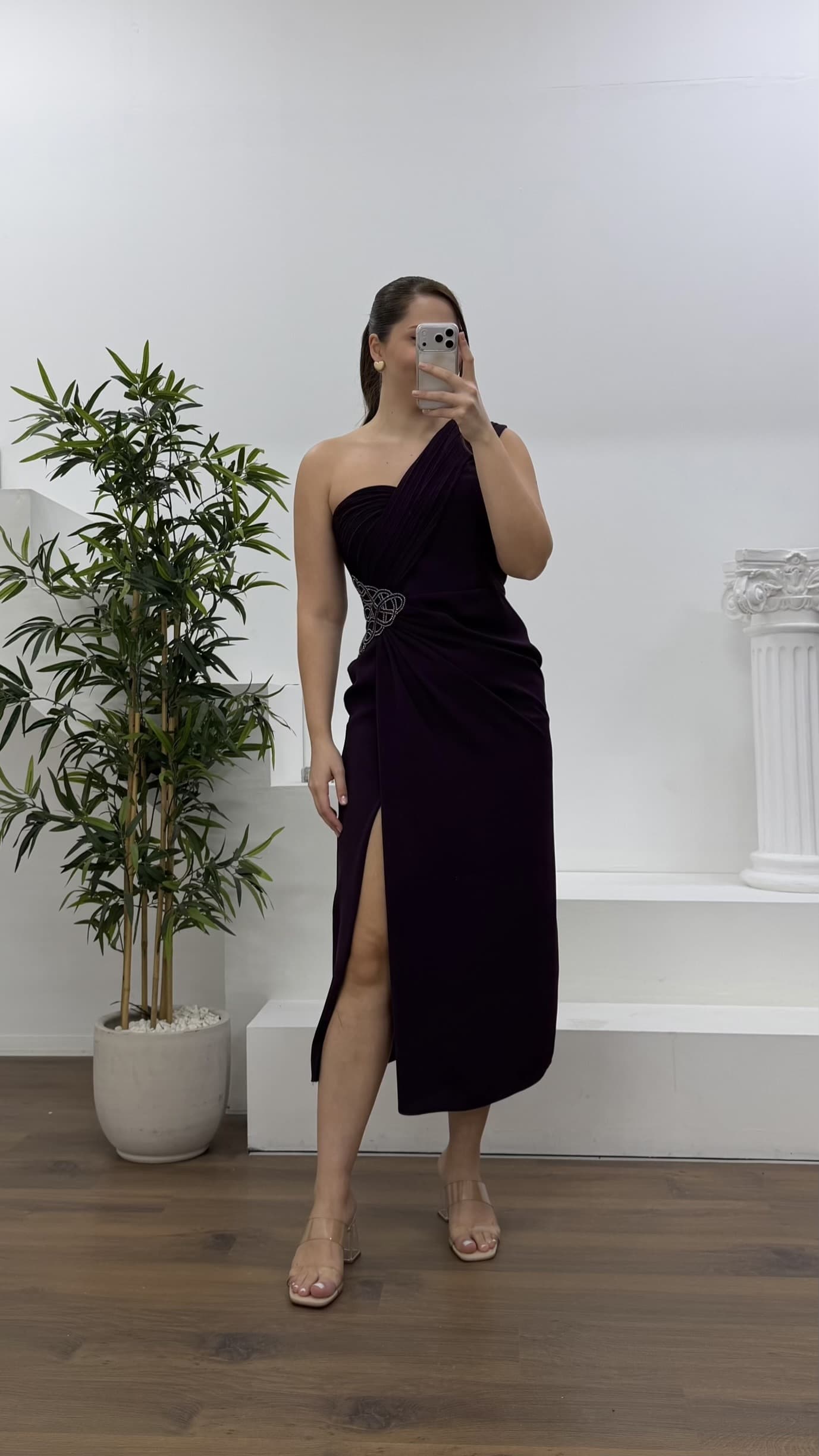 • Mürdüm Taş Motifli Drapeli Büyük Beden Abiye Elbise