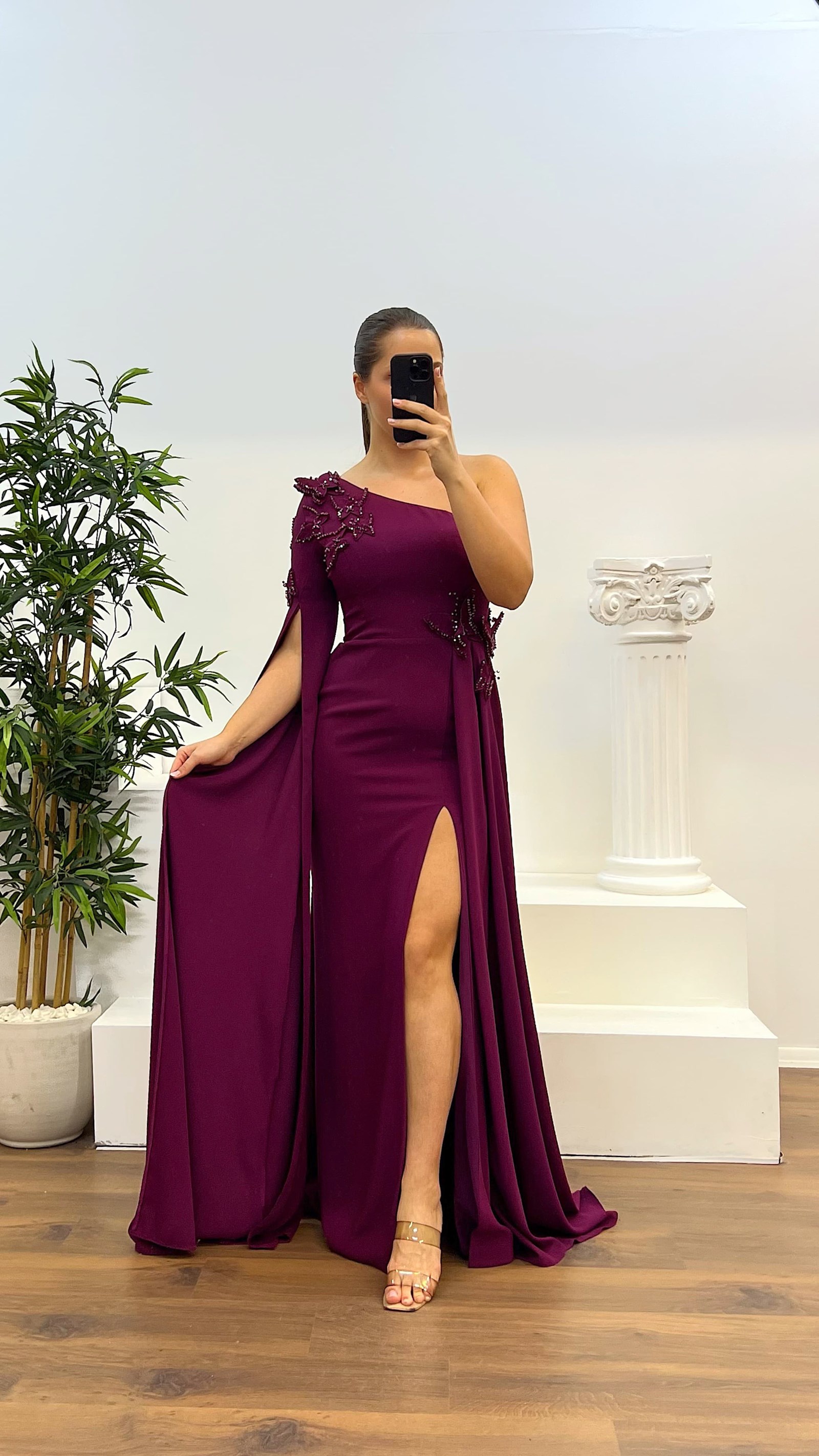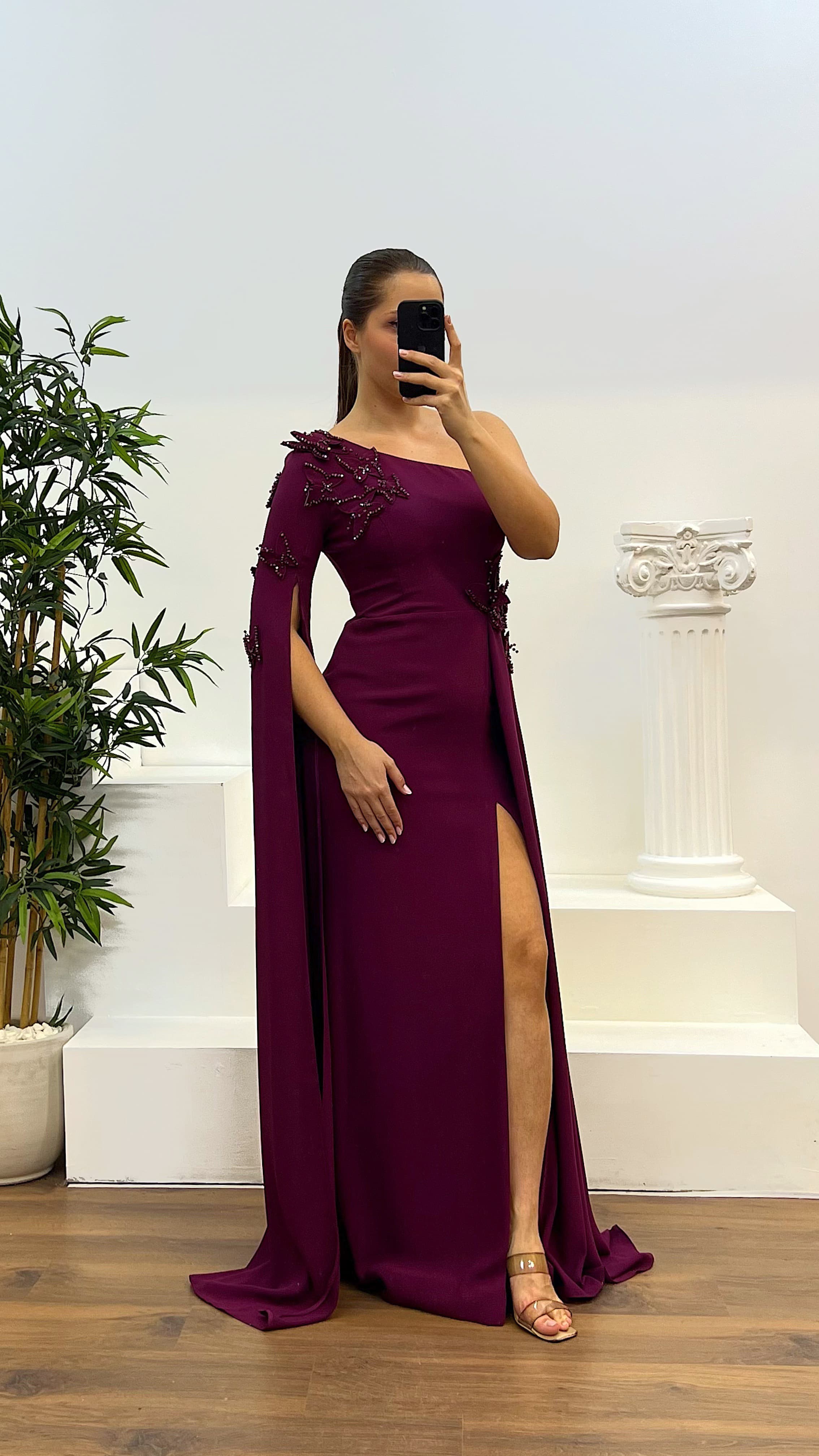• Mürdüm Tek Kol Büyük Beden Abiye Elbise