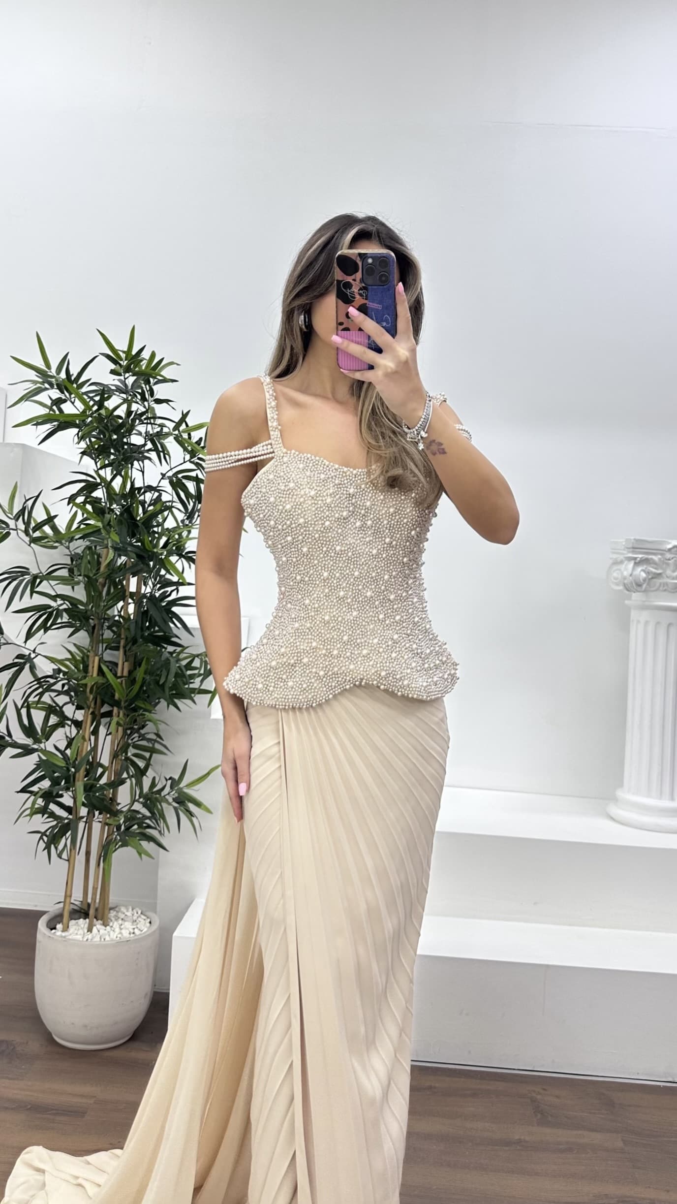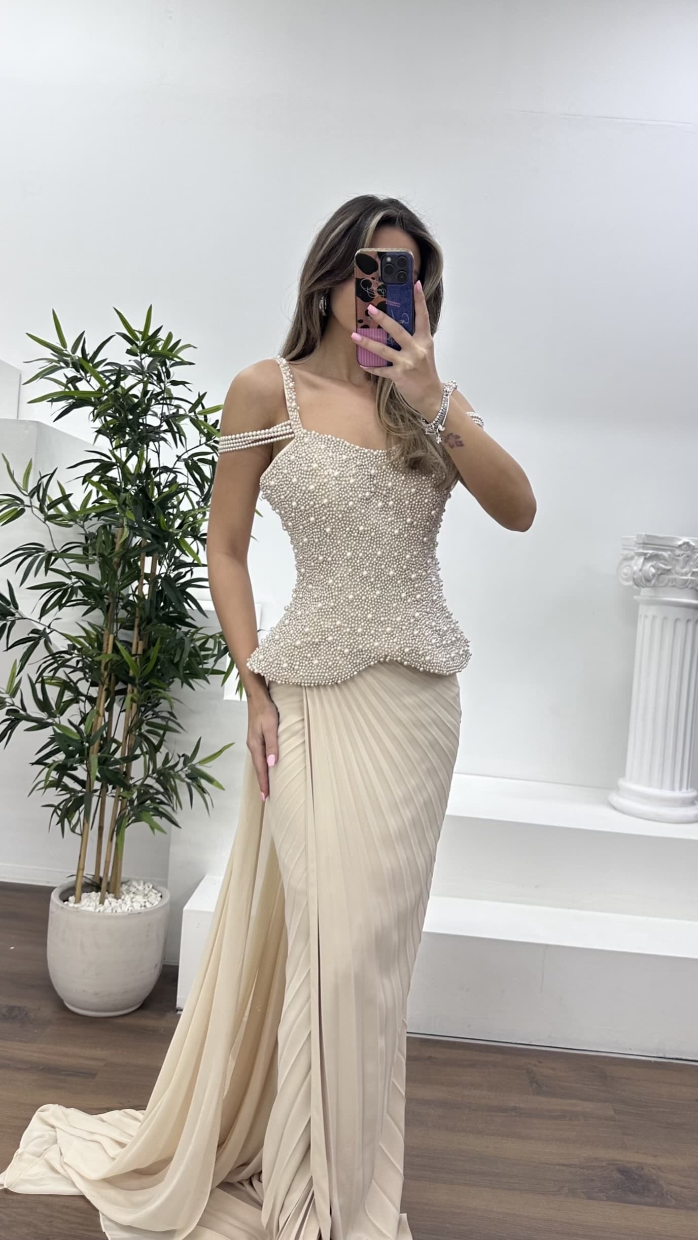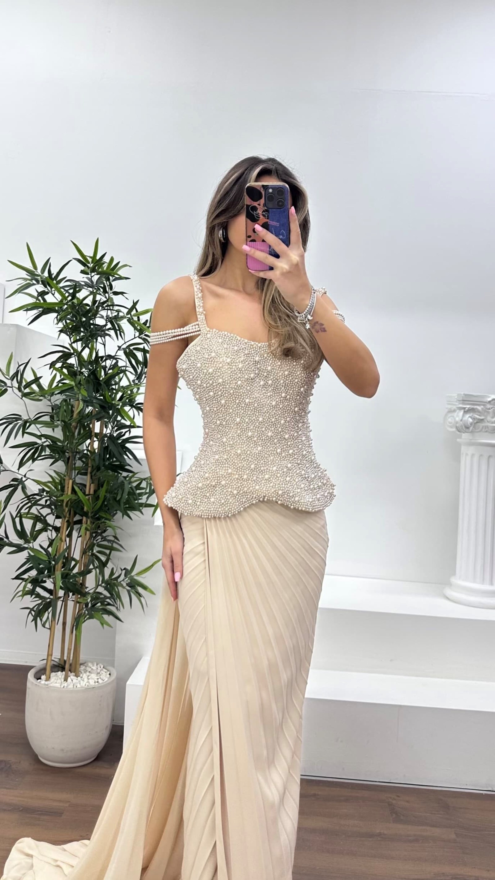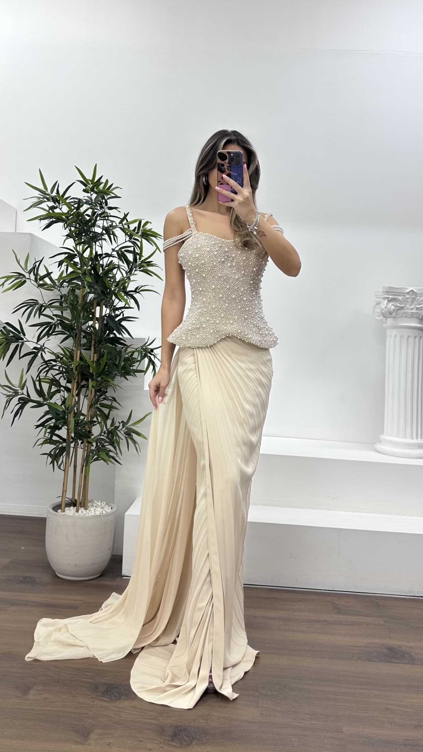 • Nude İnci Detaylı Zarif Kesim Şifon Abiye Elbise