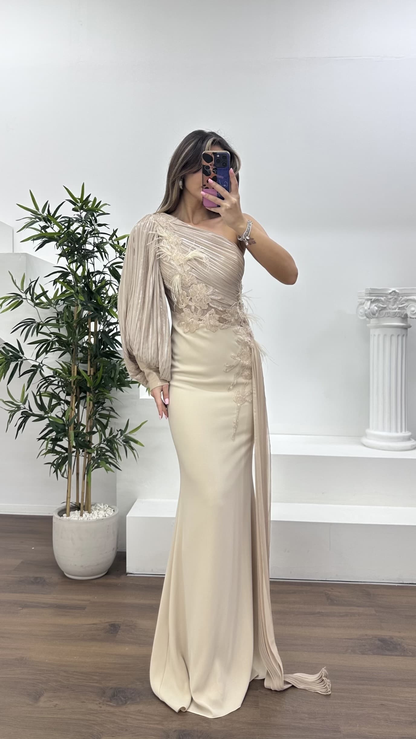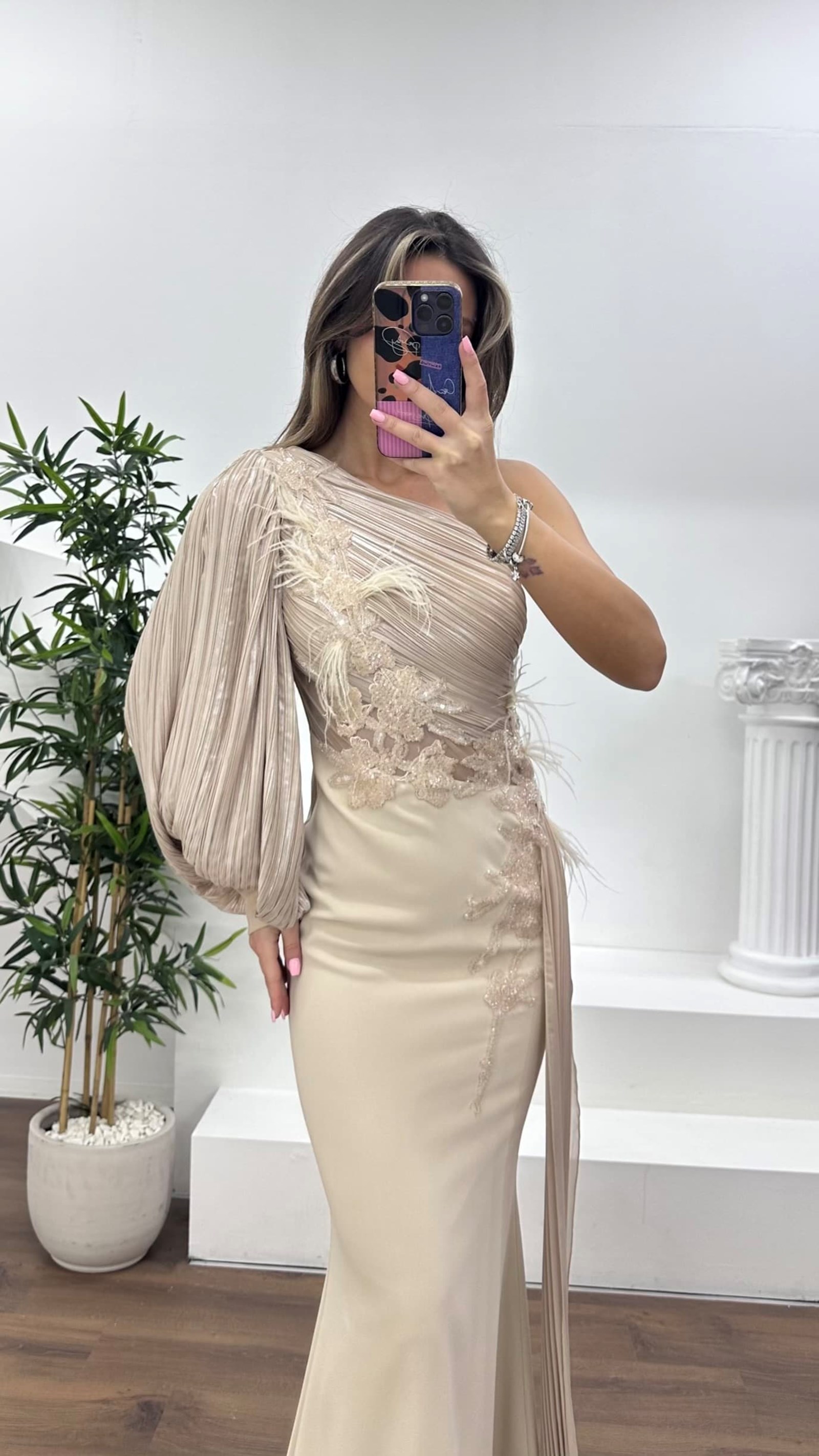 • Nude Pileli Tek Omuz,Çiçeklerle Süslenmiş Drapeli Abiye Elbise
