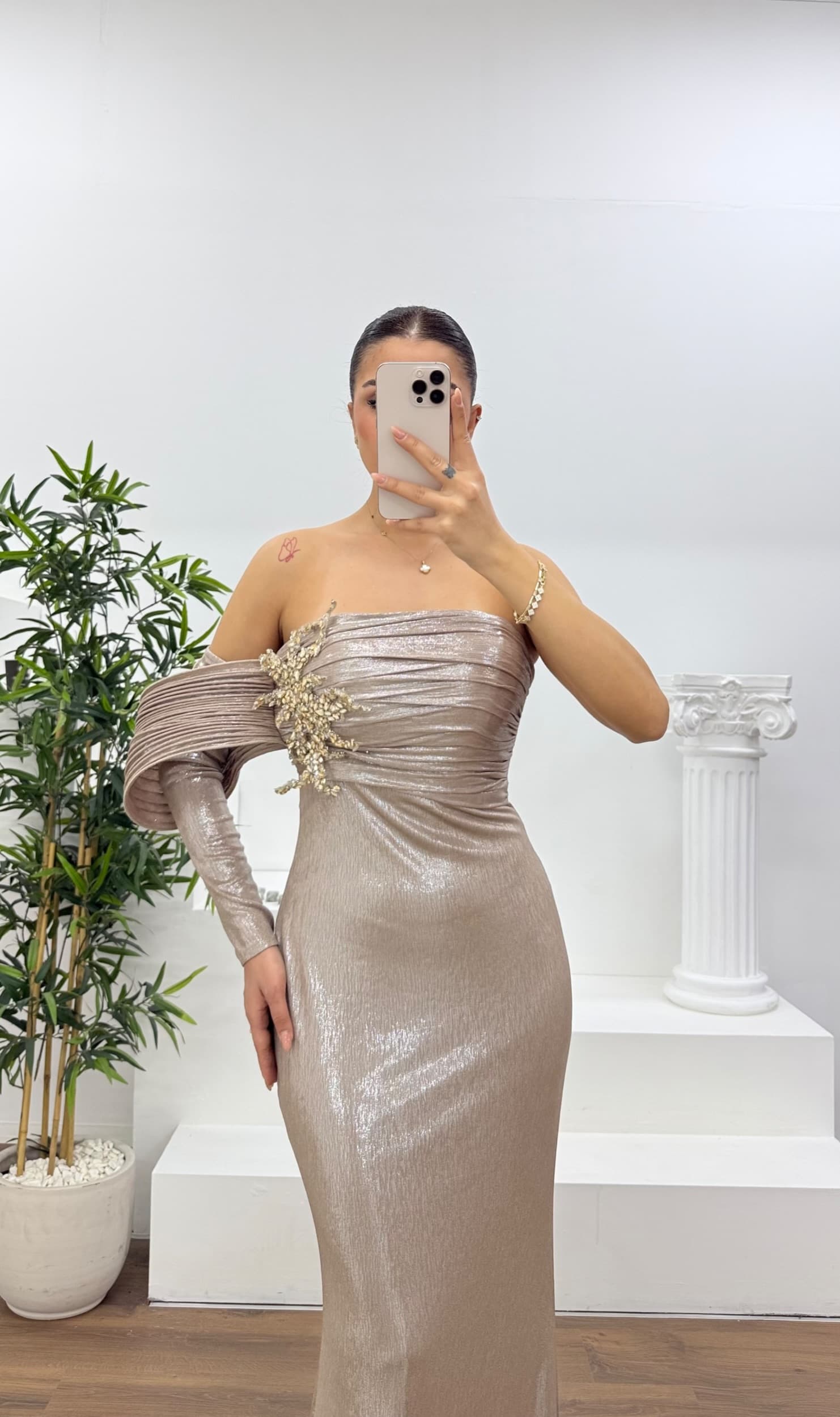 Tek omuz pile kollu taş aplikeli abiye elbise