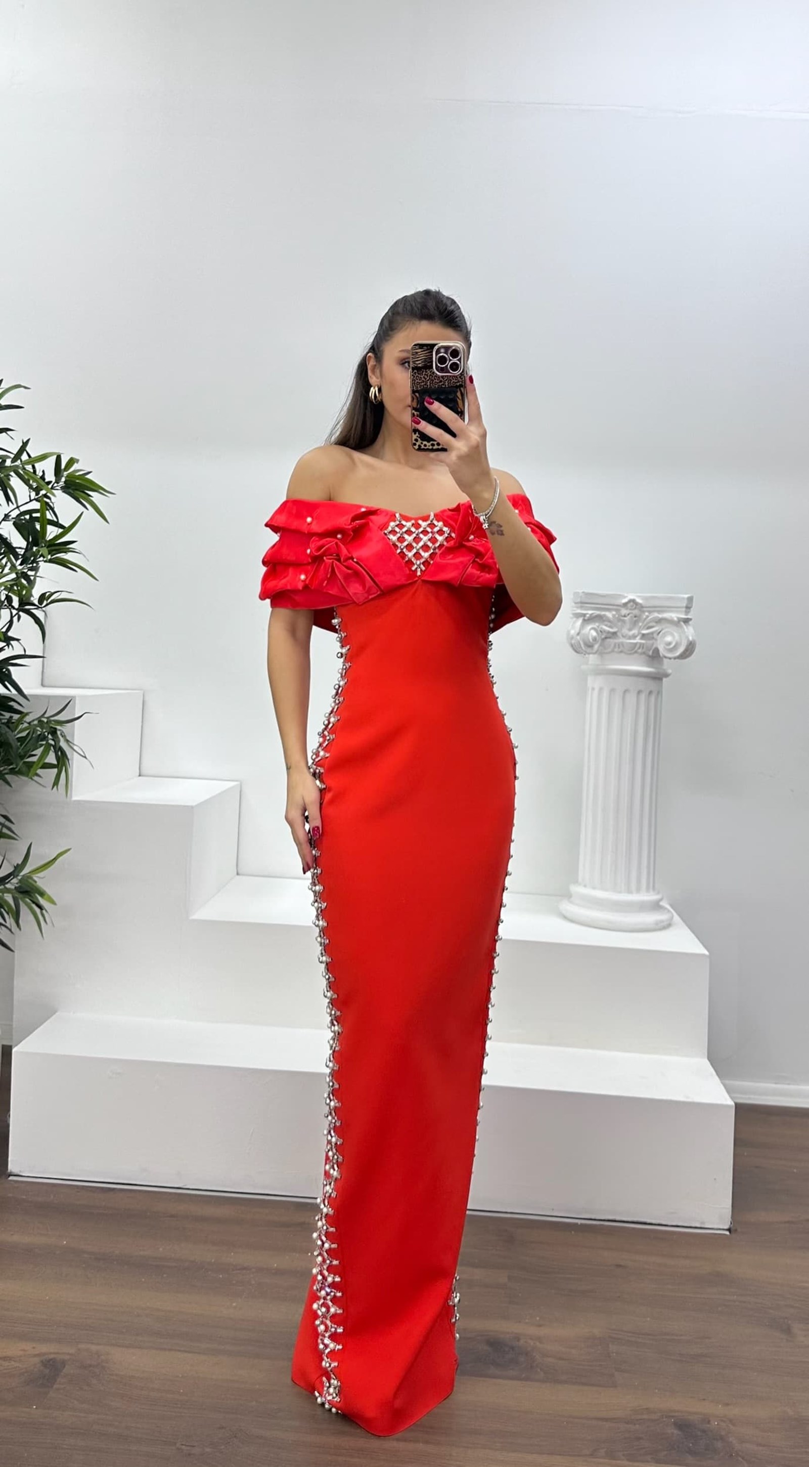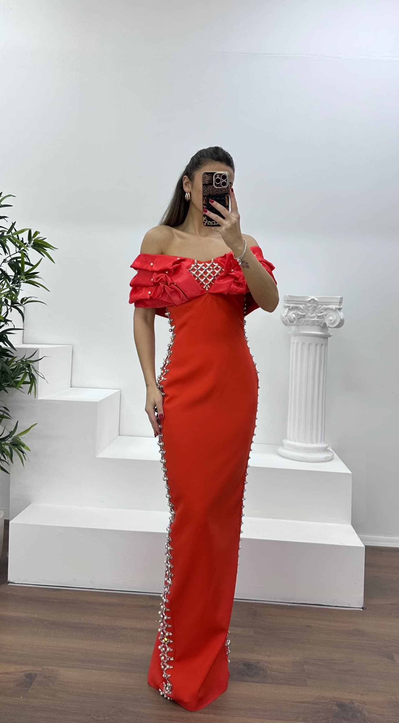 • Oranj Kayık Yaka Taşlı Abiye Elbise