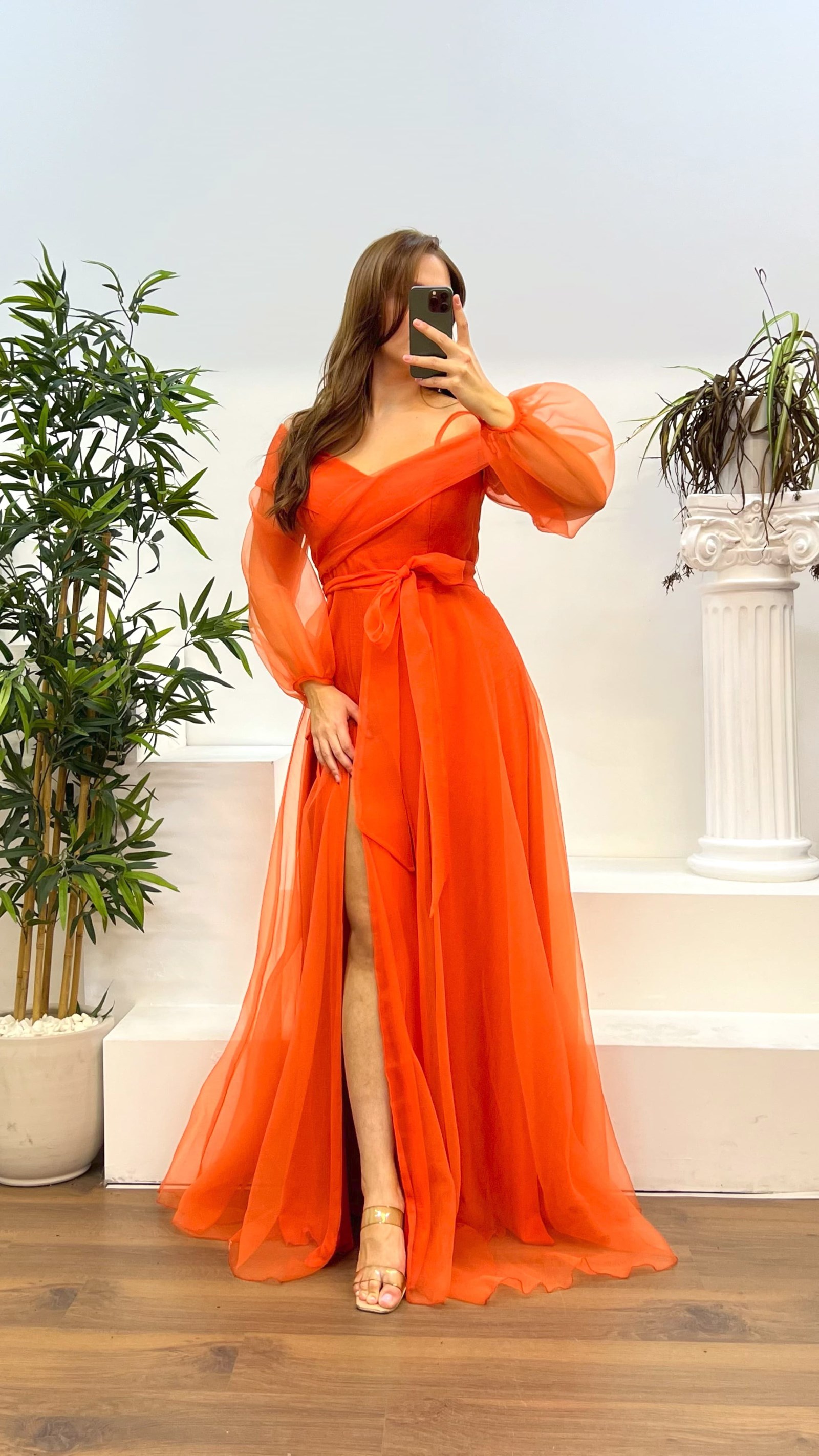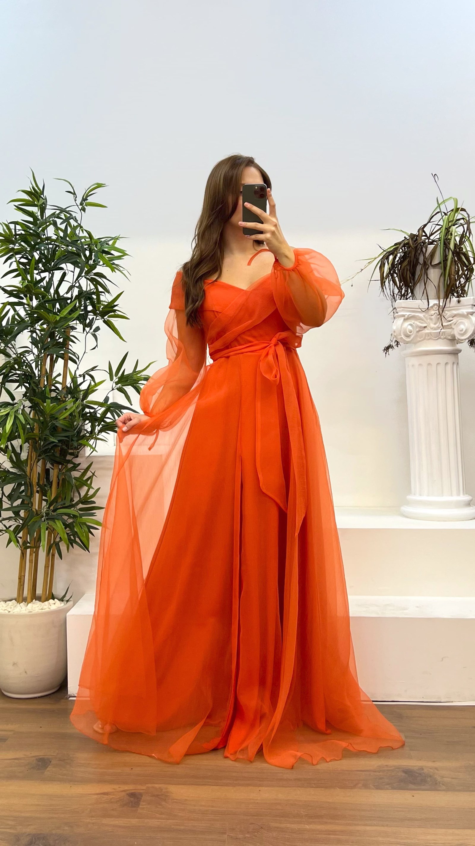 Ürün 44-48 bedene kadar uyumlu,astarlı,yırtmaçlı,kuşaklı tül abiye olarak tasarlanmıştır.