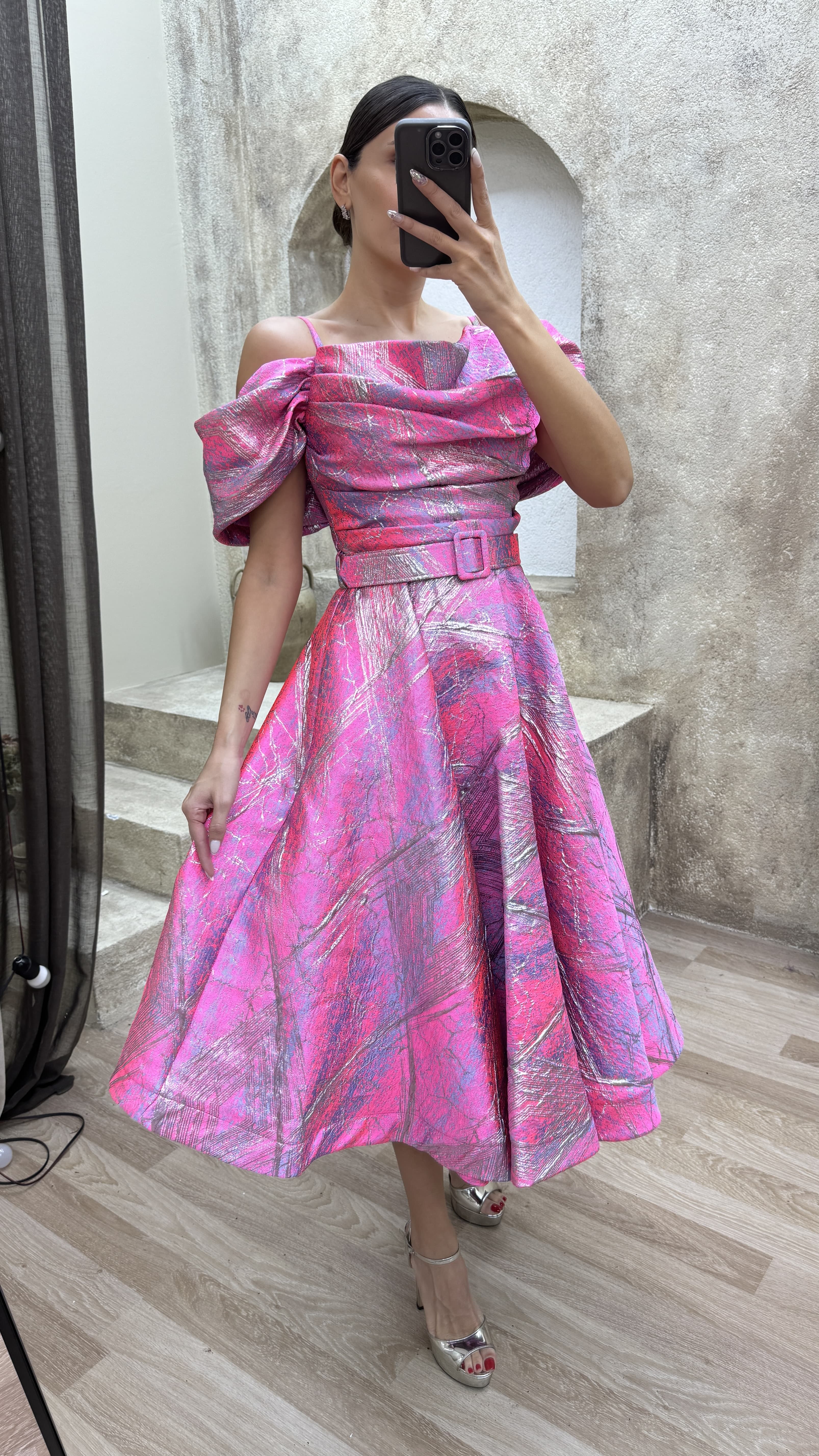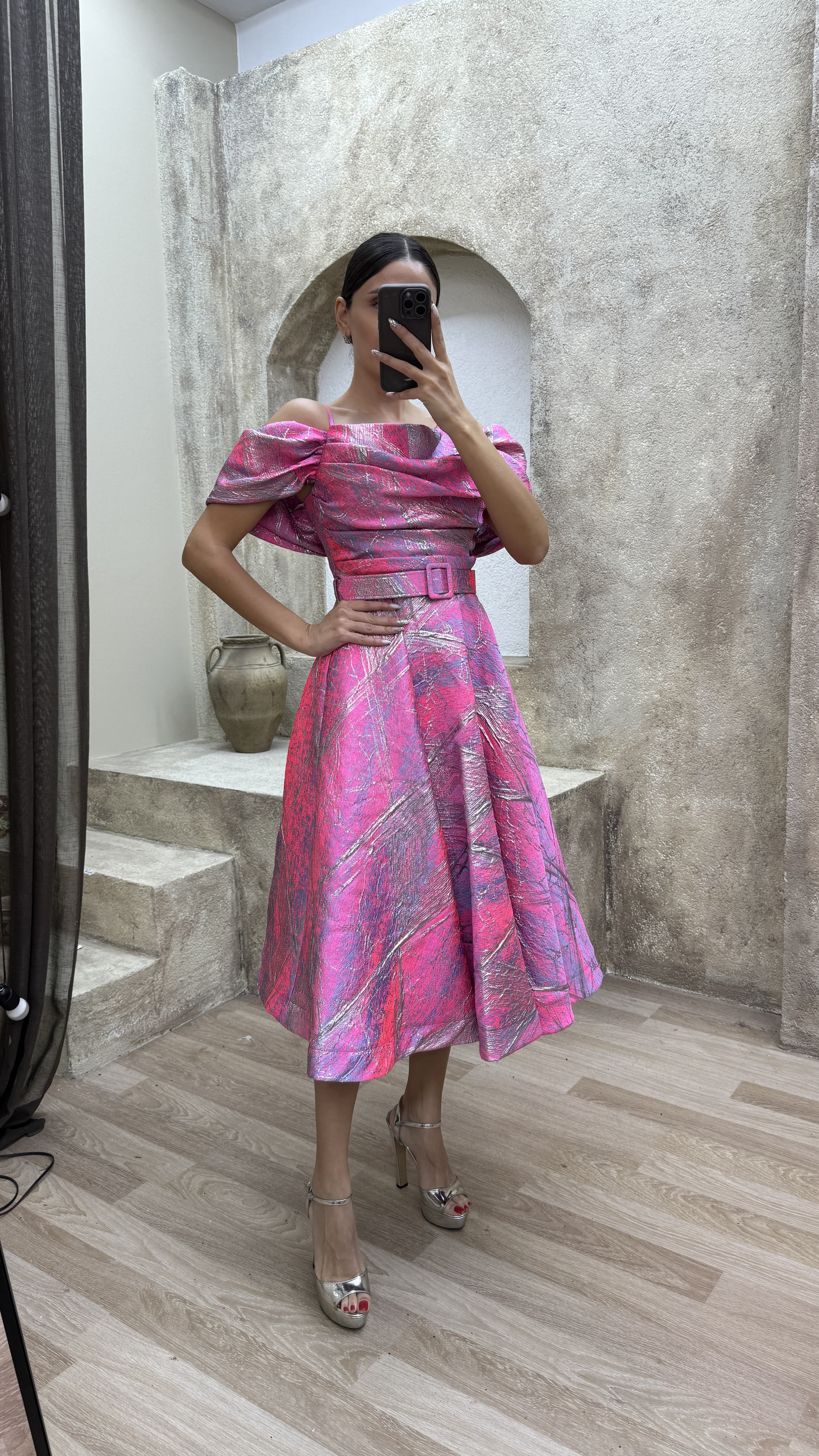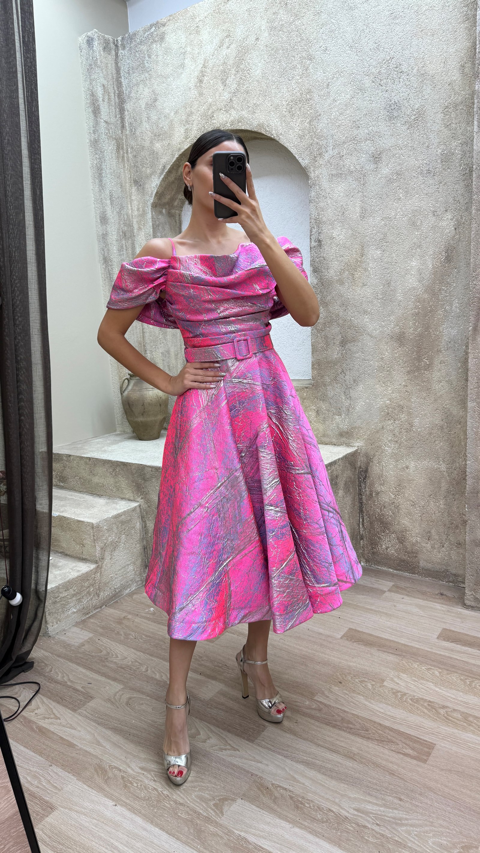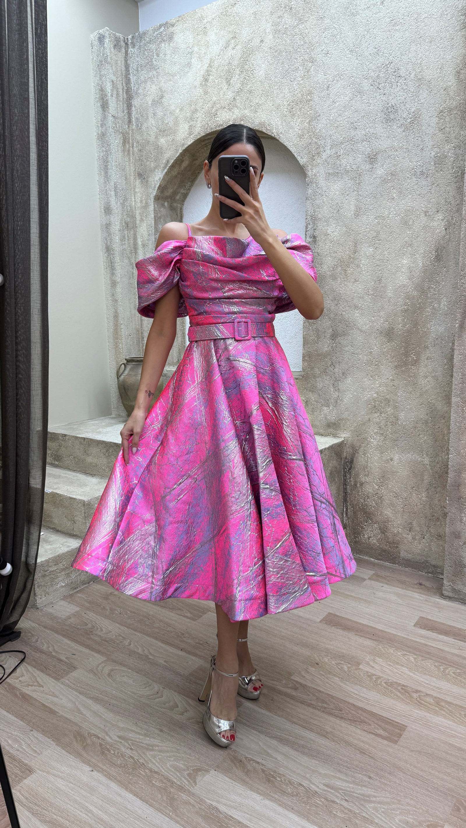 • Pembe Büzgü Detay Kemerli Tasarım Midi Boy Abiye Elbise