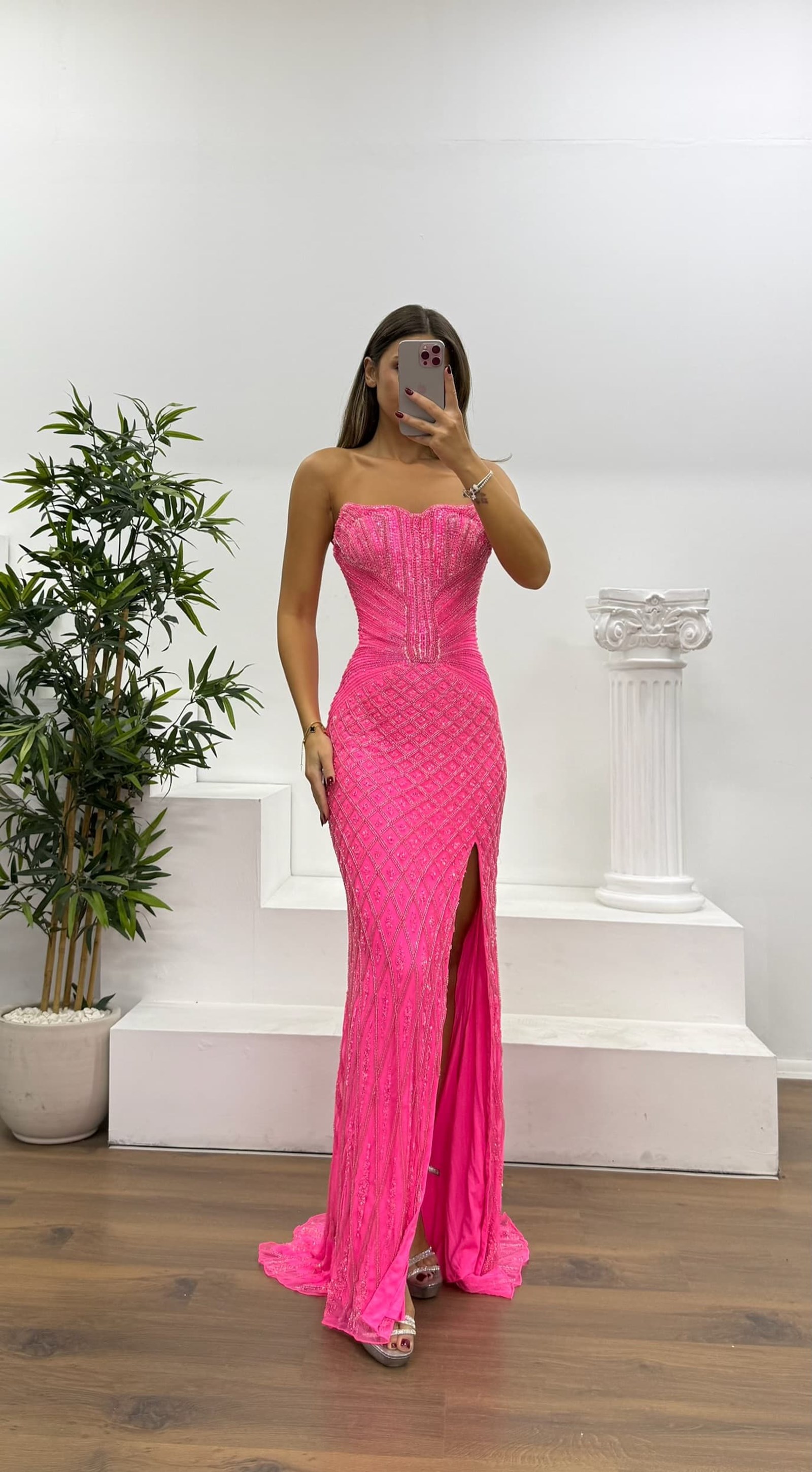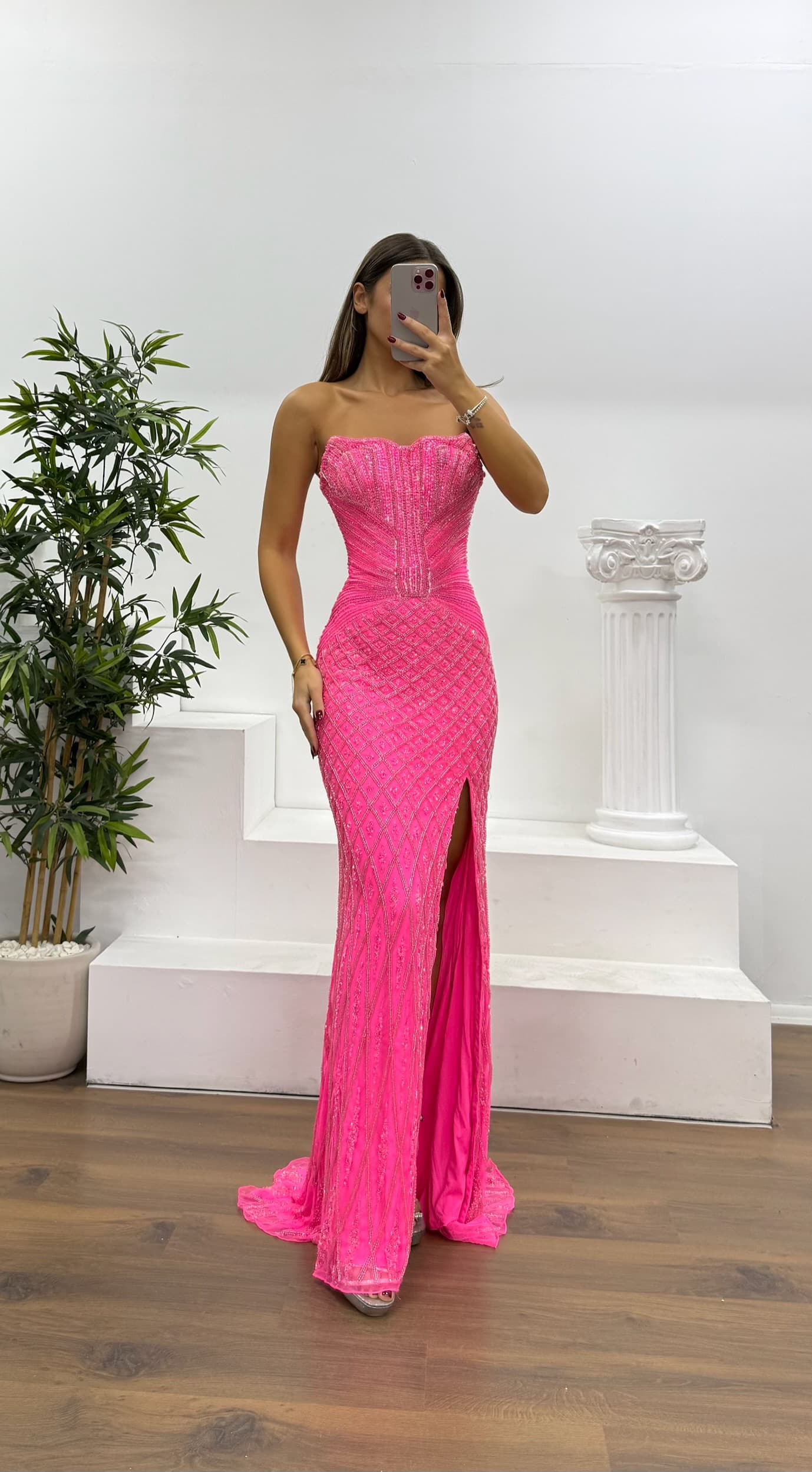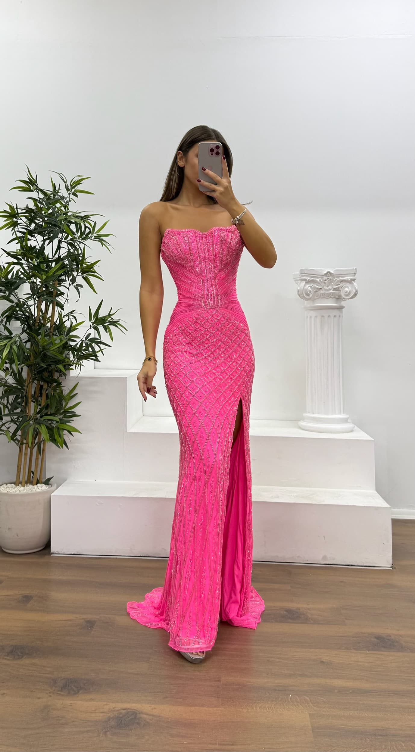 Pembe Straplez Özel El İşlemesi Abiye Elbise