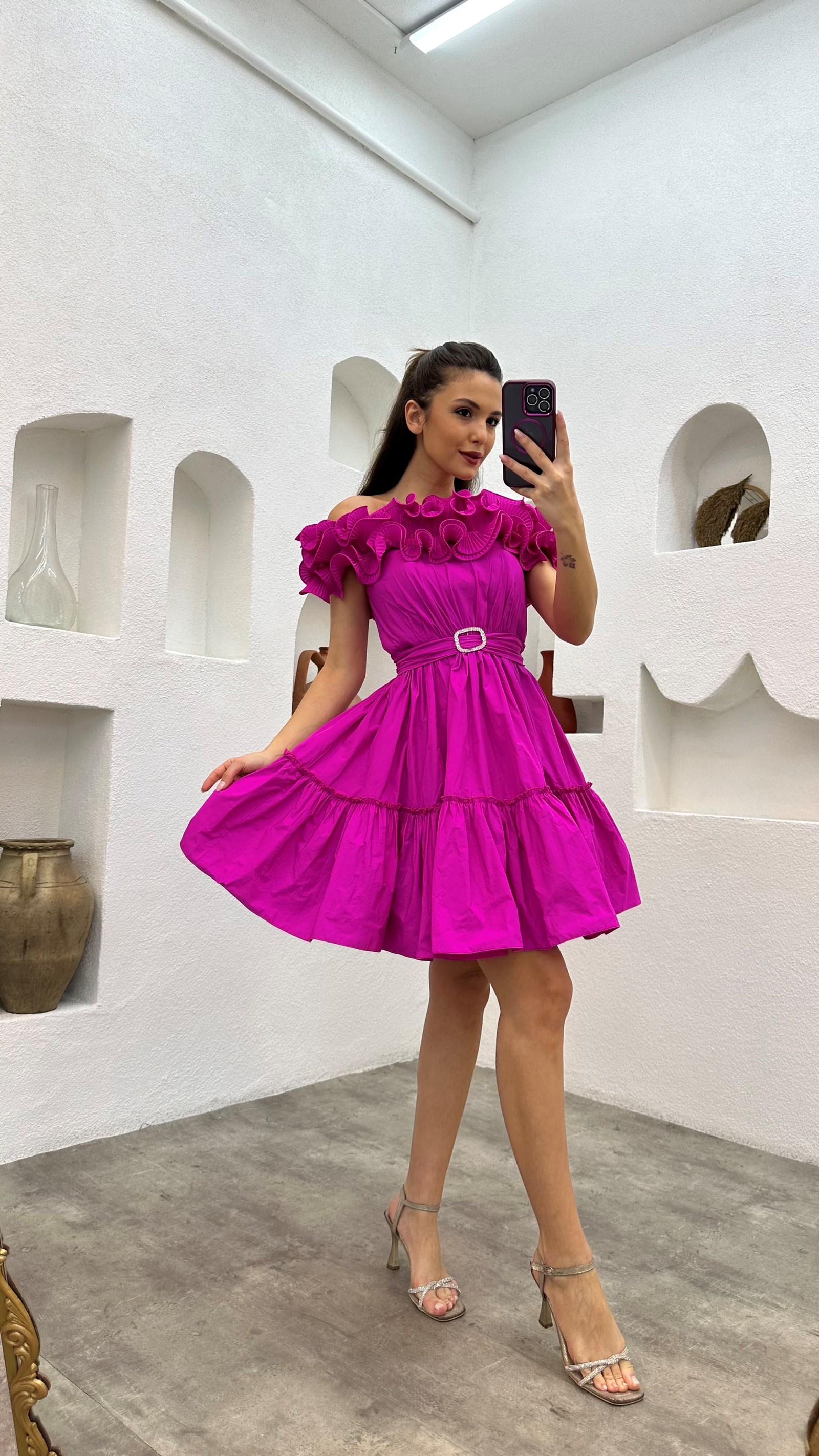 • Lila Volanlı Kemerli Abiye Elbise