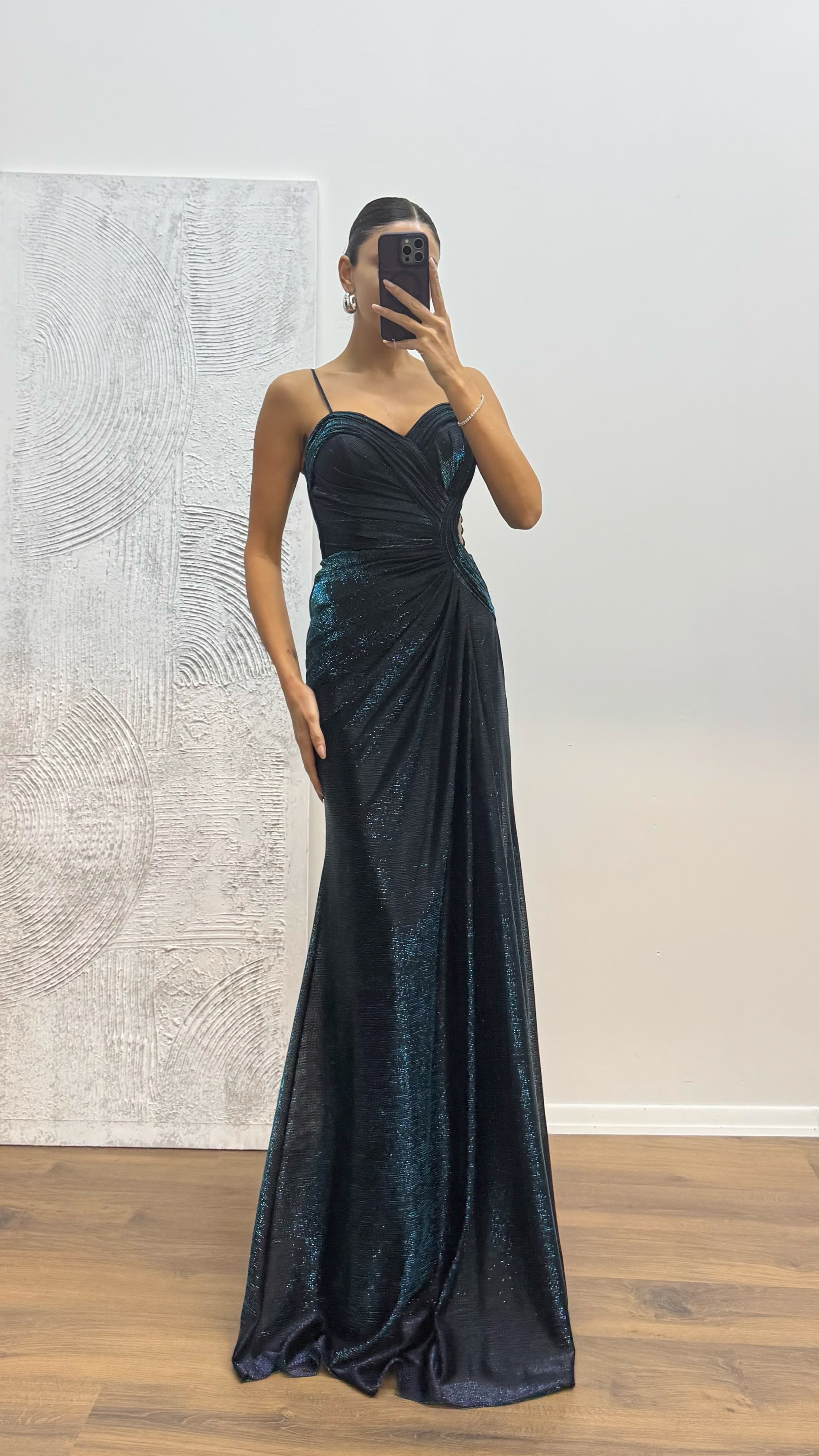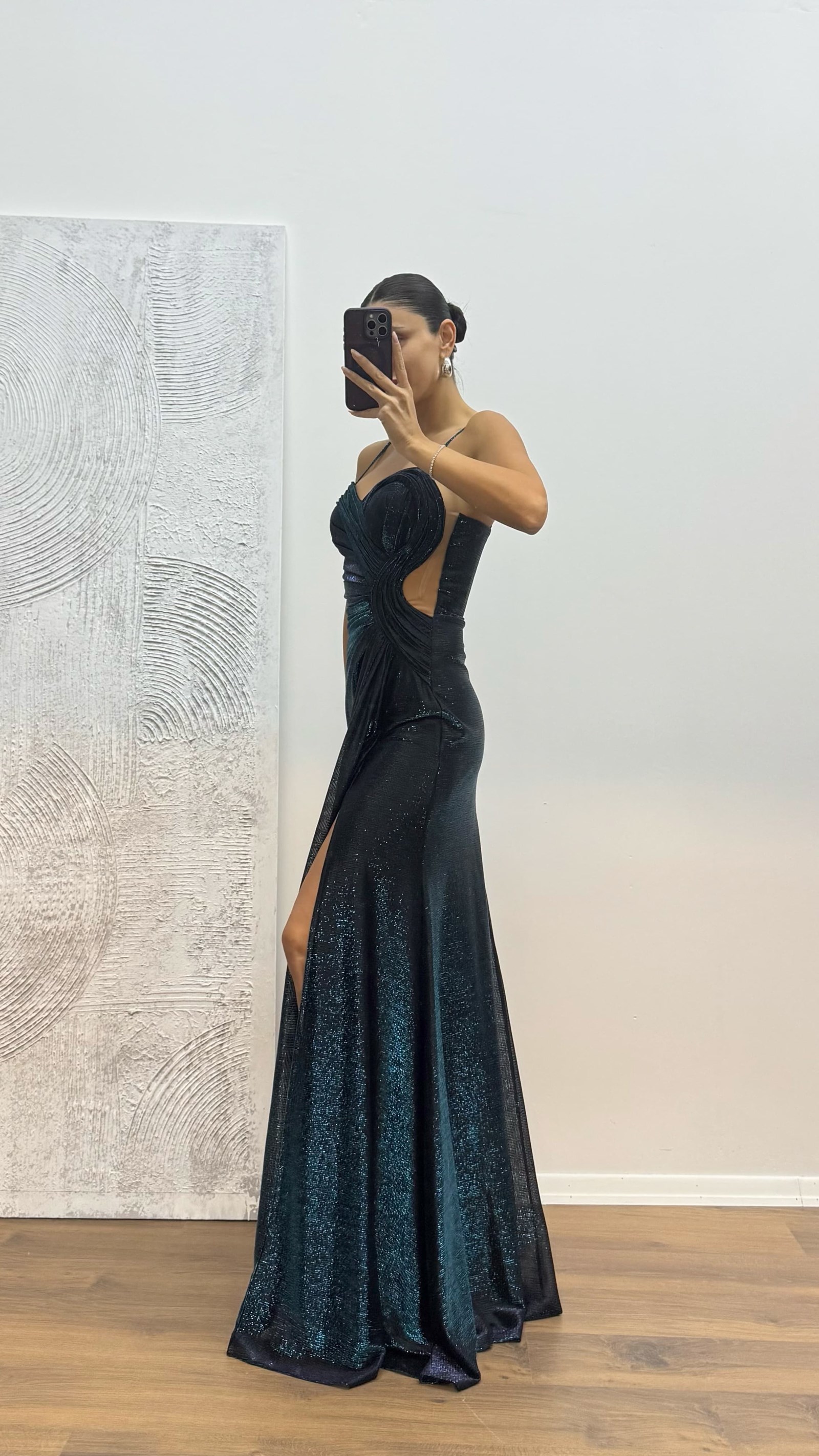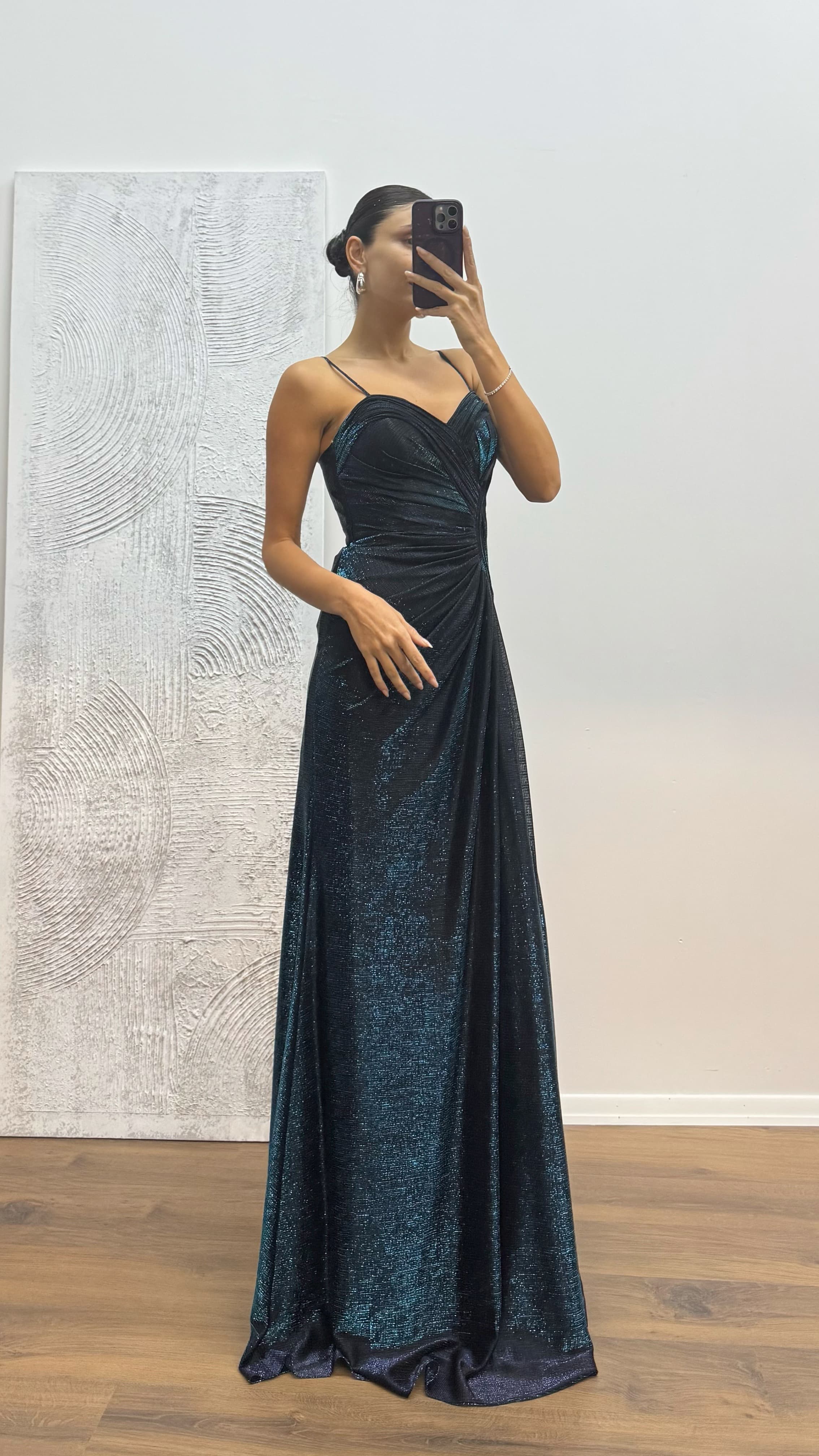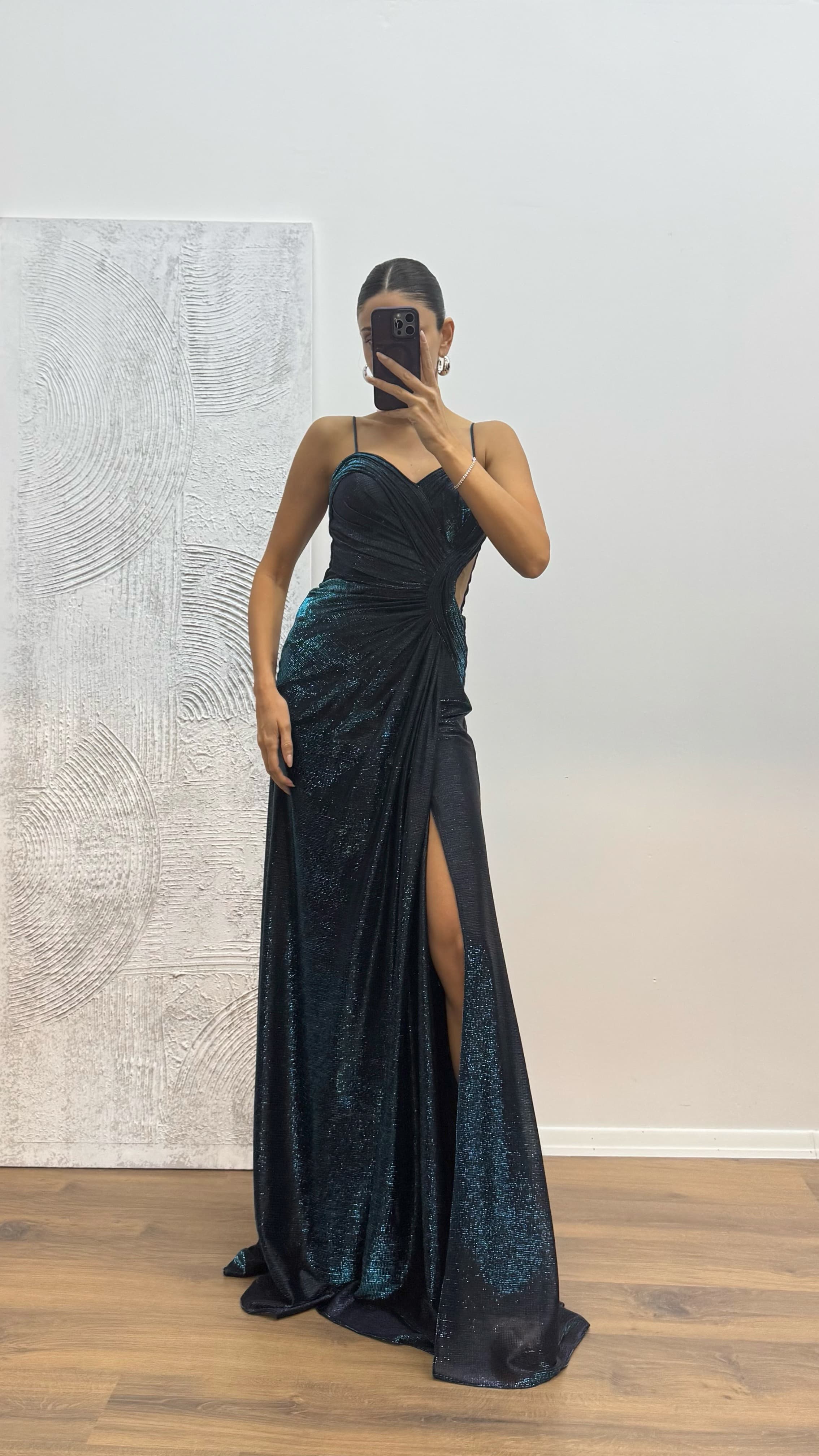 Ürün 36-42 bedene kadar uyumlu, göğüs pedli, astarlı, arka kapama fermuar, yırtmaçlı, ip askılı abiye olarak tasarlanmıştır.