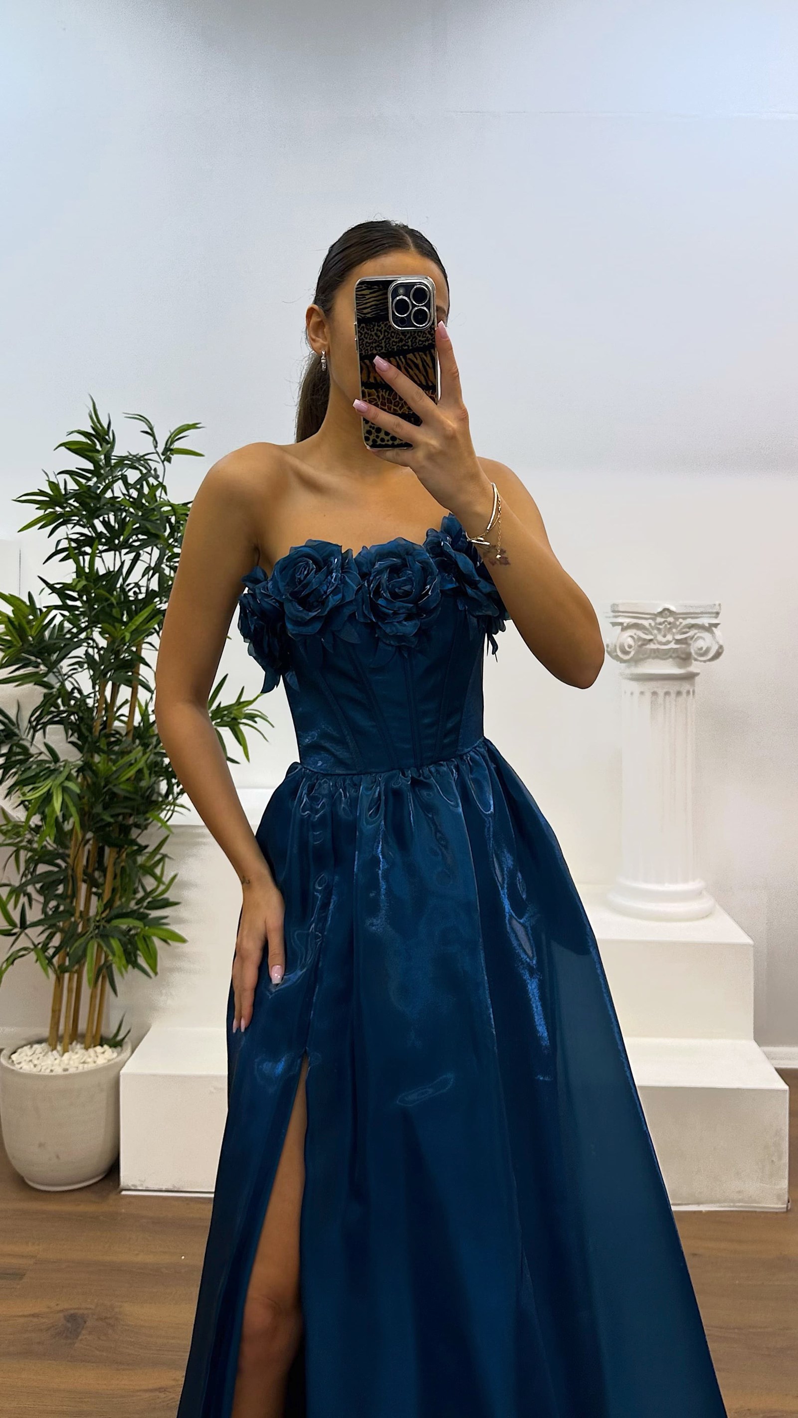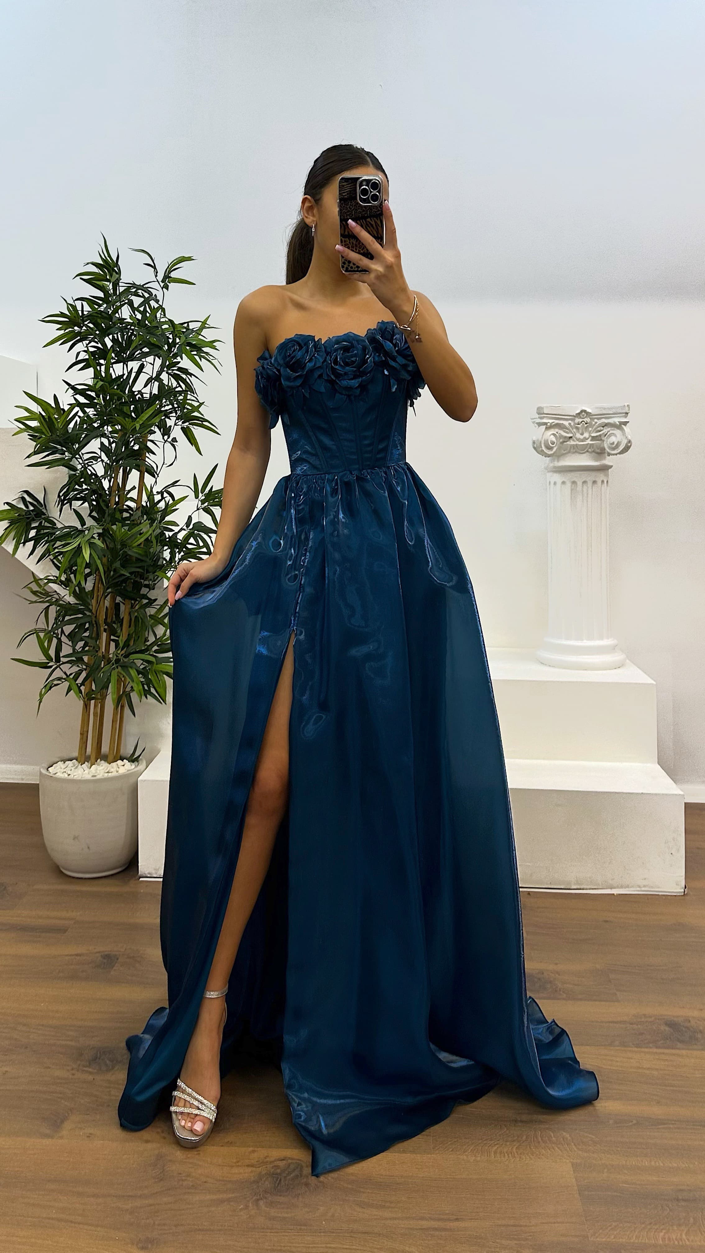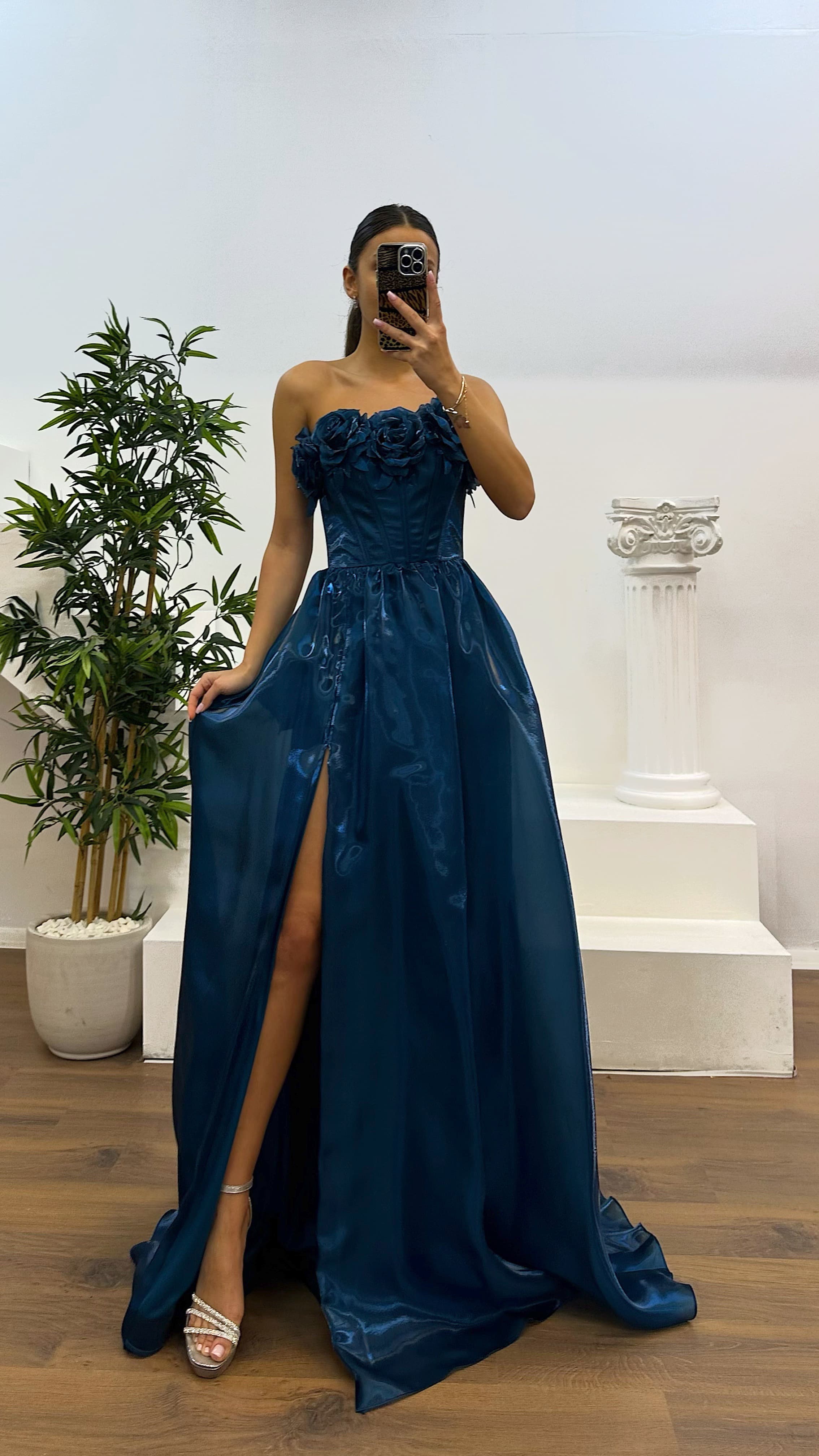 Ürün 36-44 bedene kadar uyumlu, göğüs pedli, astarlı, yırtmaçlı, cepli, sırt çapraz ip ve fermuar kapamalı abiye olarak tasarlanmıştır.