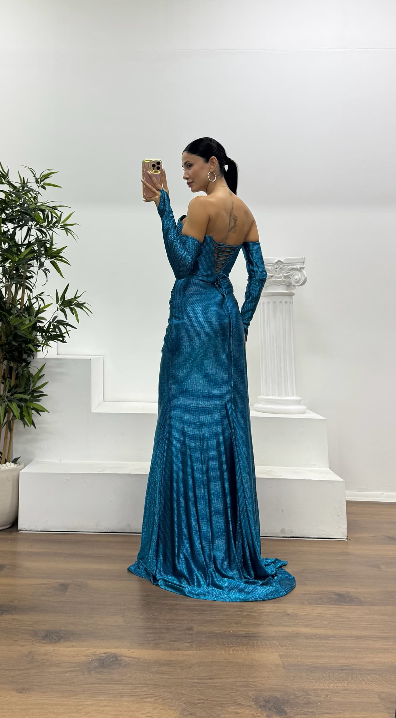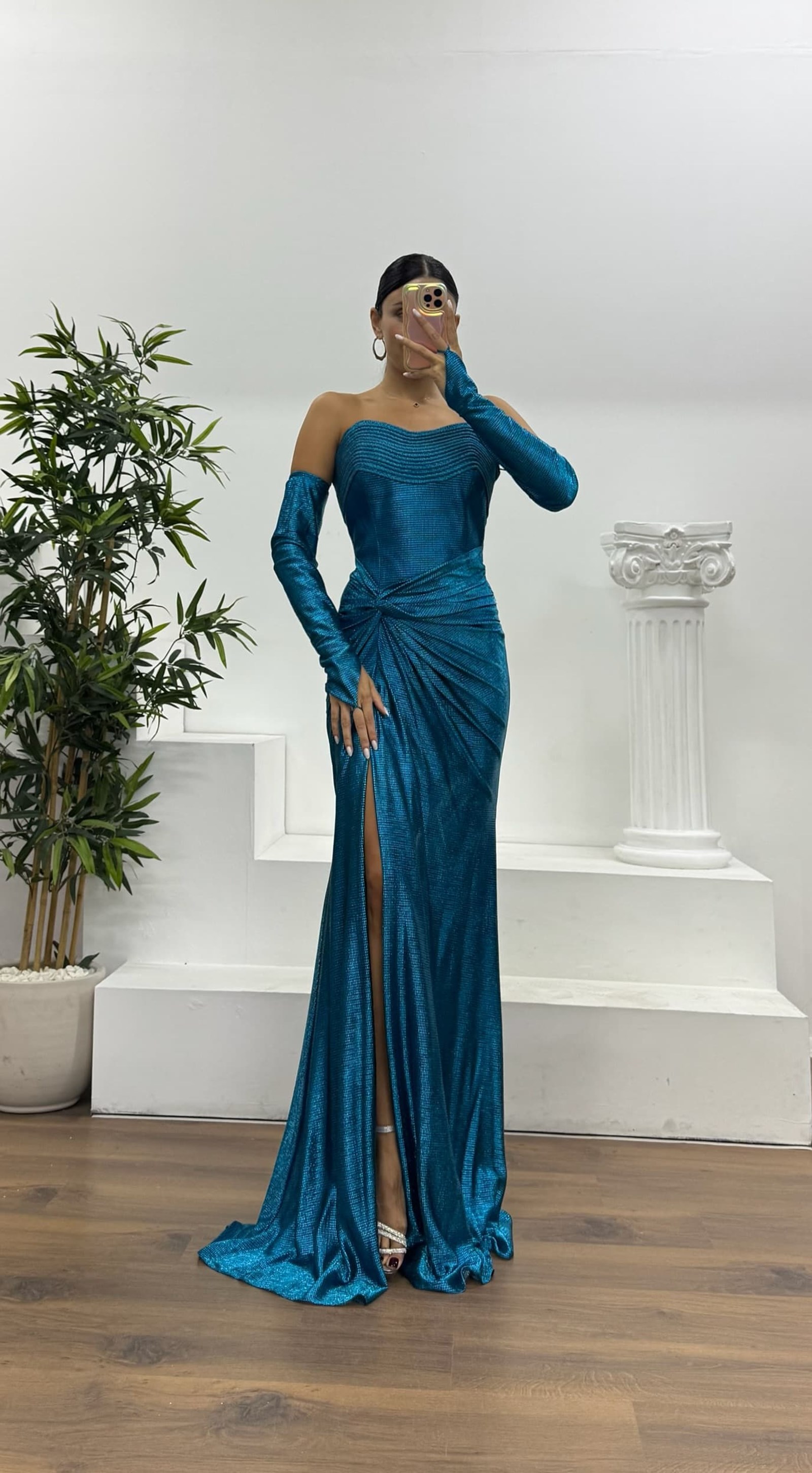 Ürün 36-44 bedene kadar uyumlu, göğüs pedli, astarlı, sırt capraz ip ve fermuar kapamalı, yırtmaçlı, eldivenli abiye olarak tasarlanmıştır.