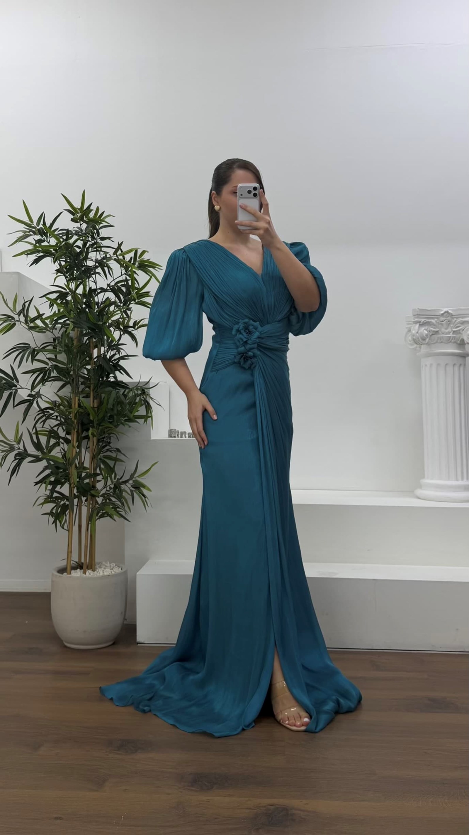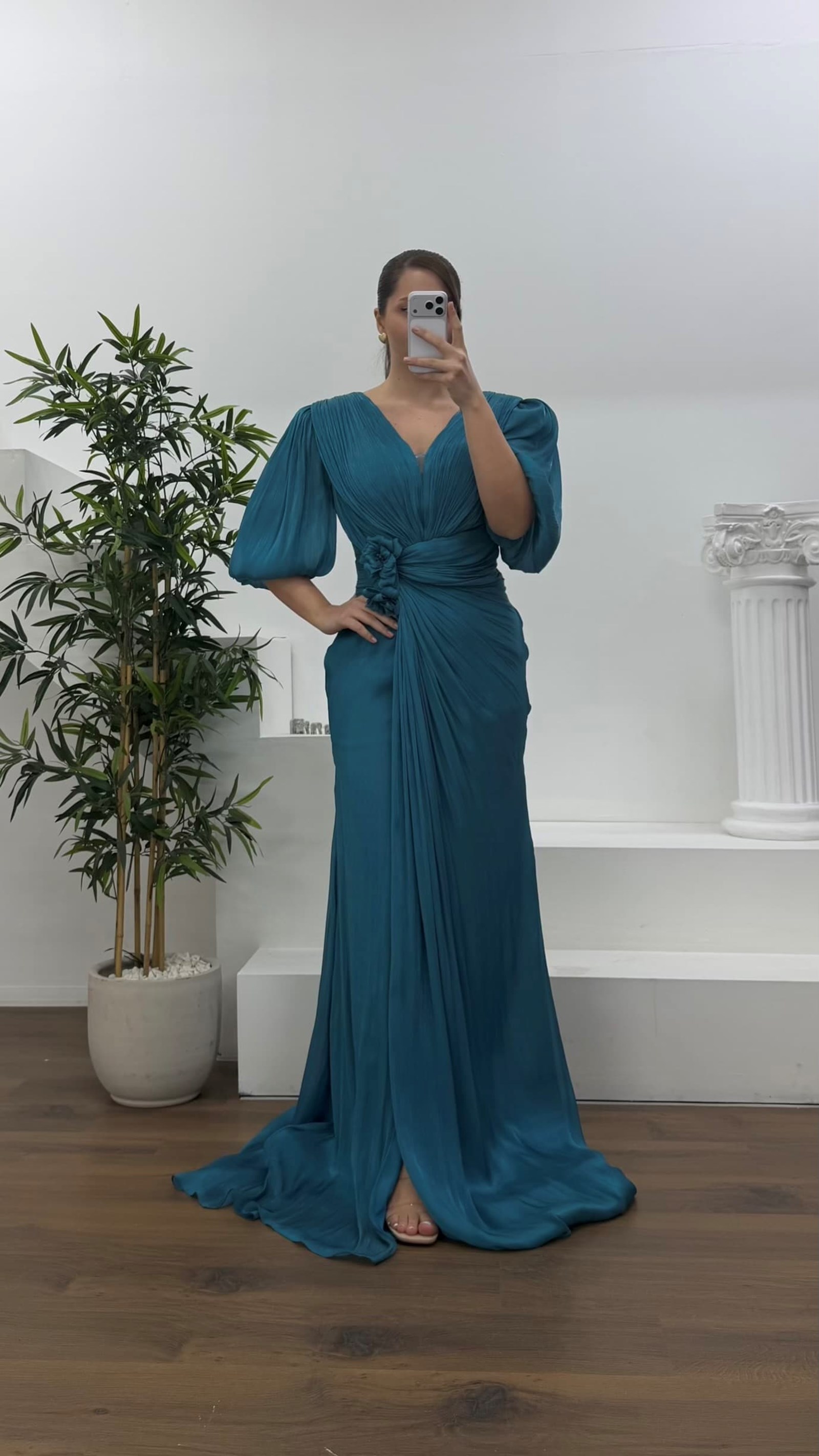 • Petrol V Yaka Şifon Büyük Beden Abiye Elbise