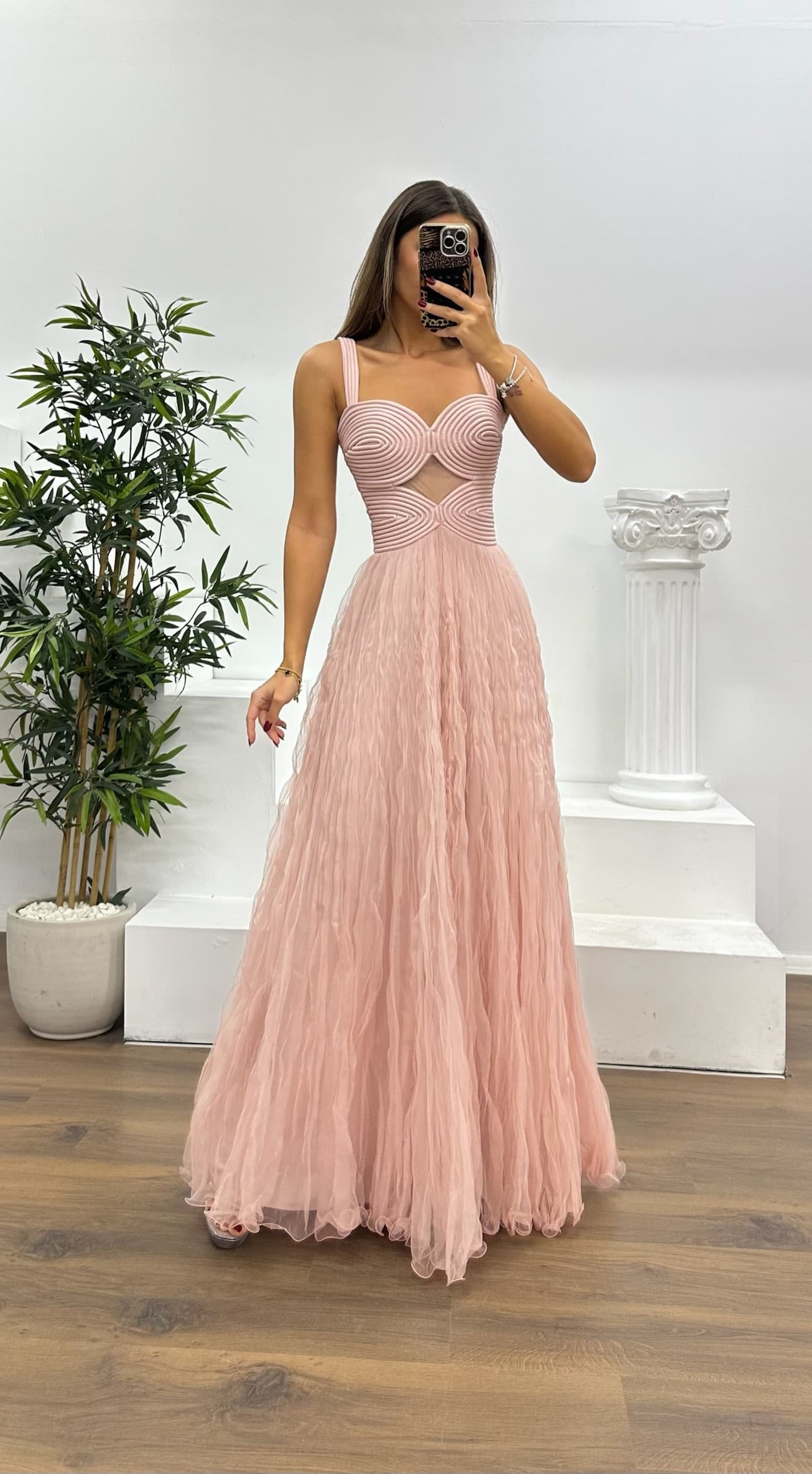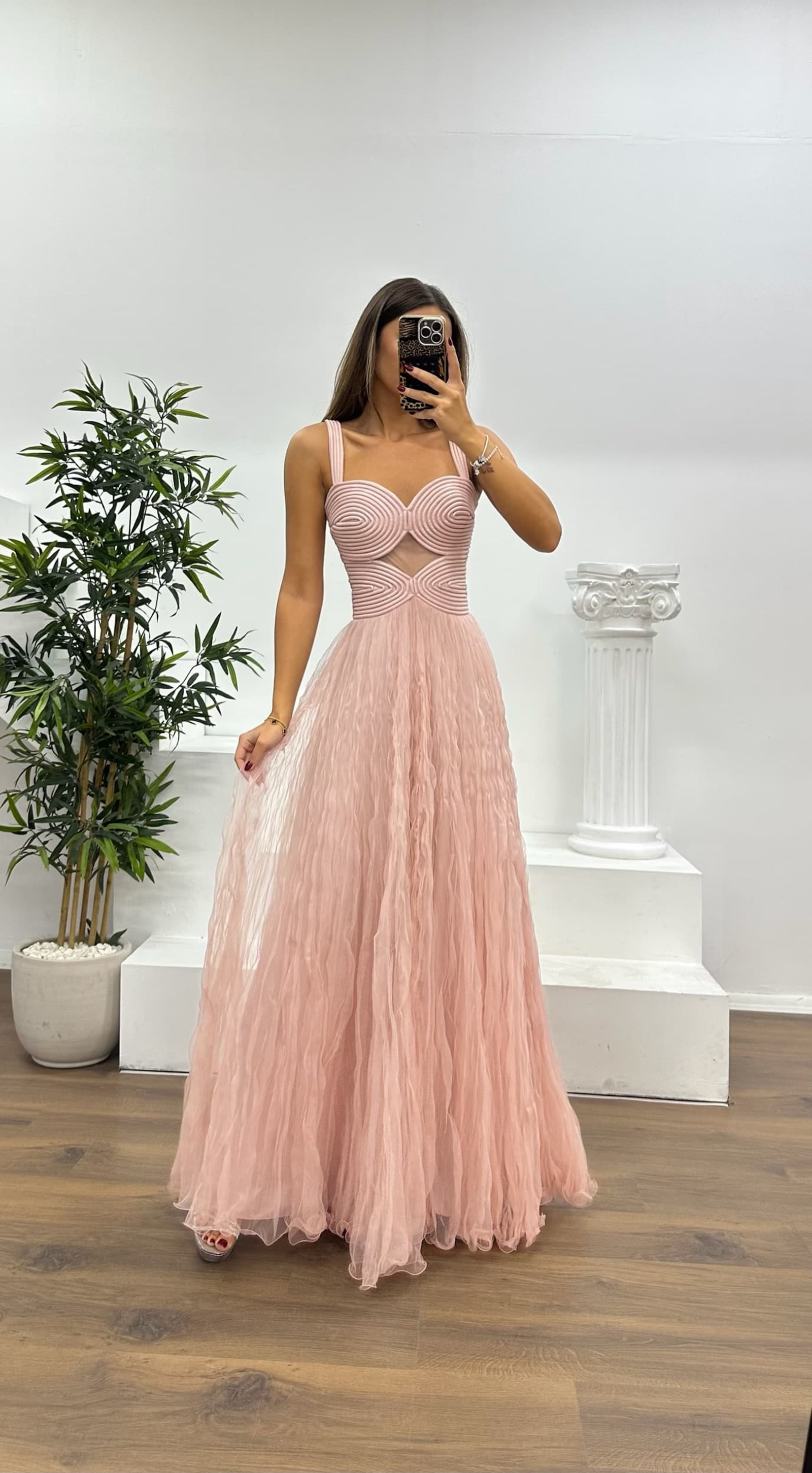 Ürün 36-44 bedene kadar uyumlu, göğüs pedli, astarlı, arka kapama fermuar, göğüs detay abiye olarak tasarlanmıştır.