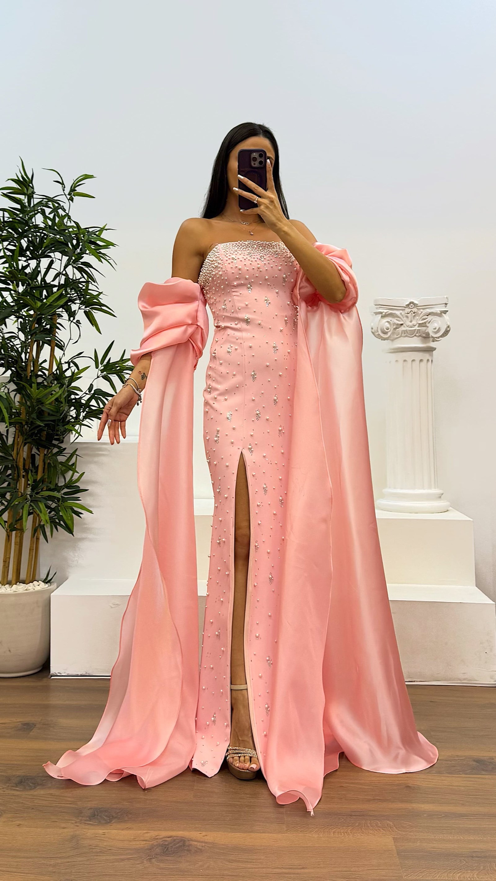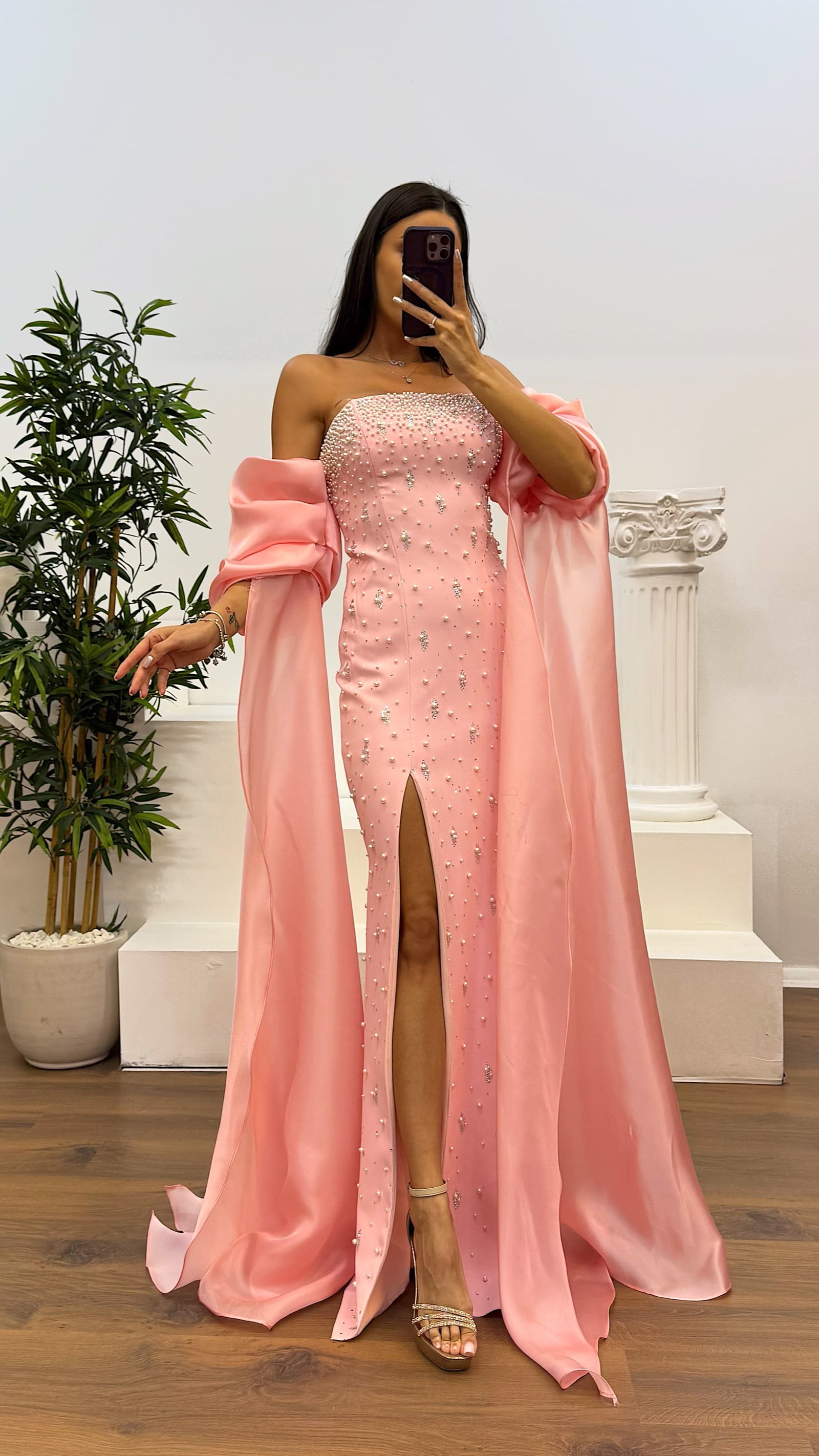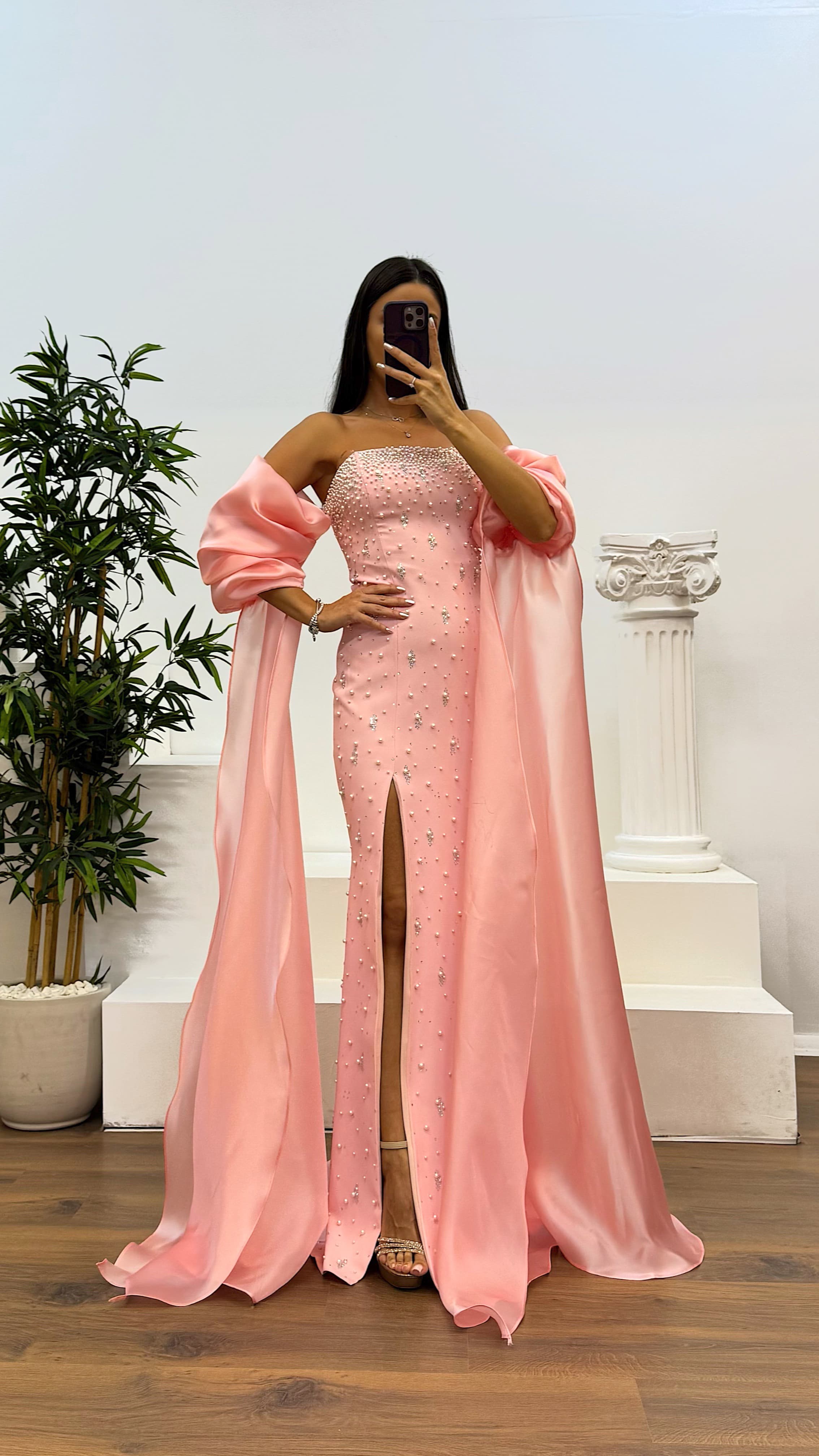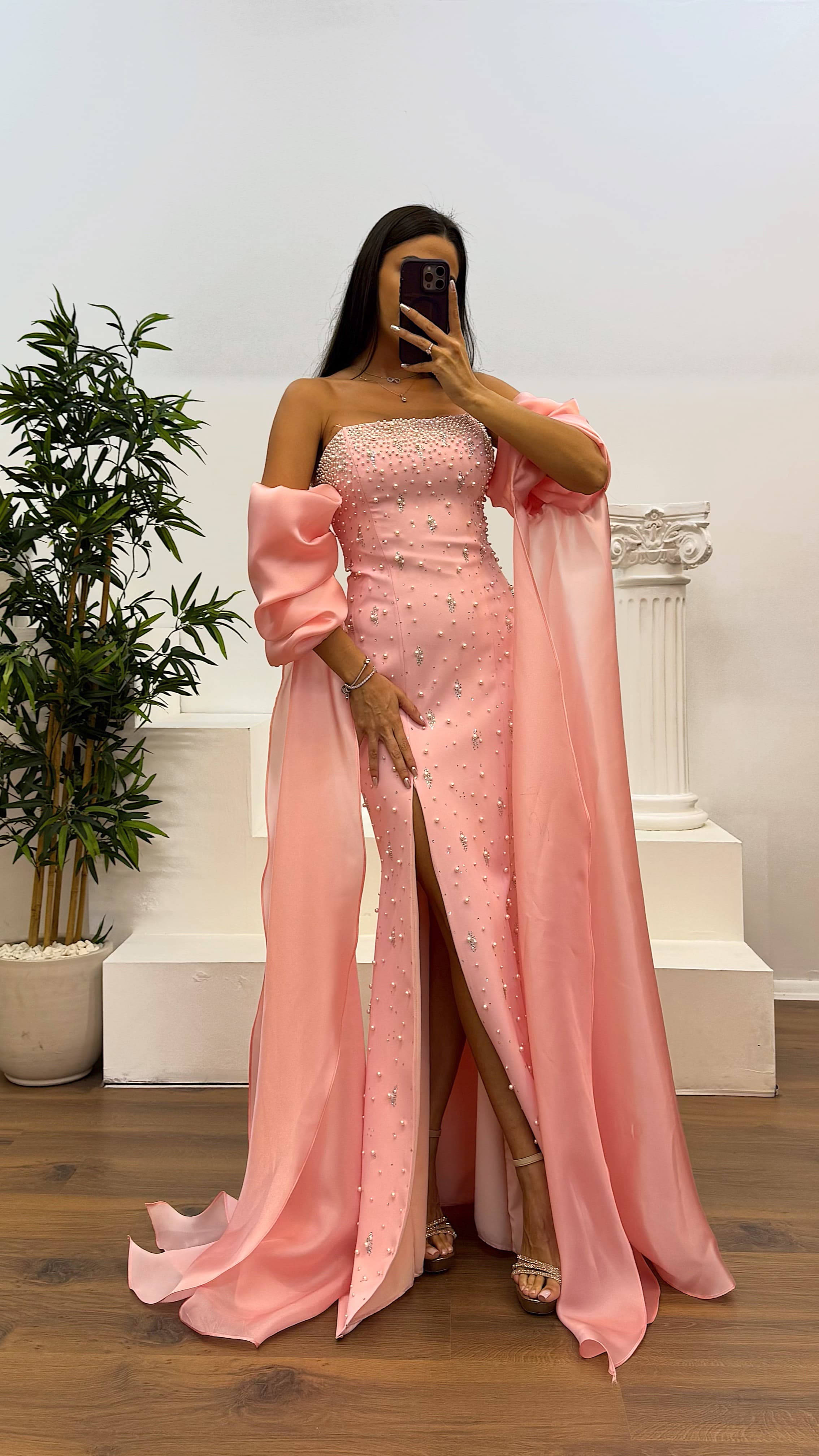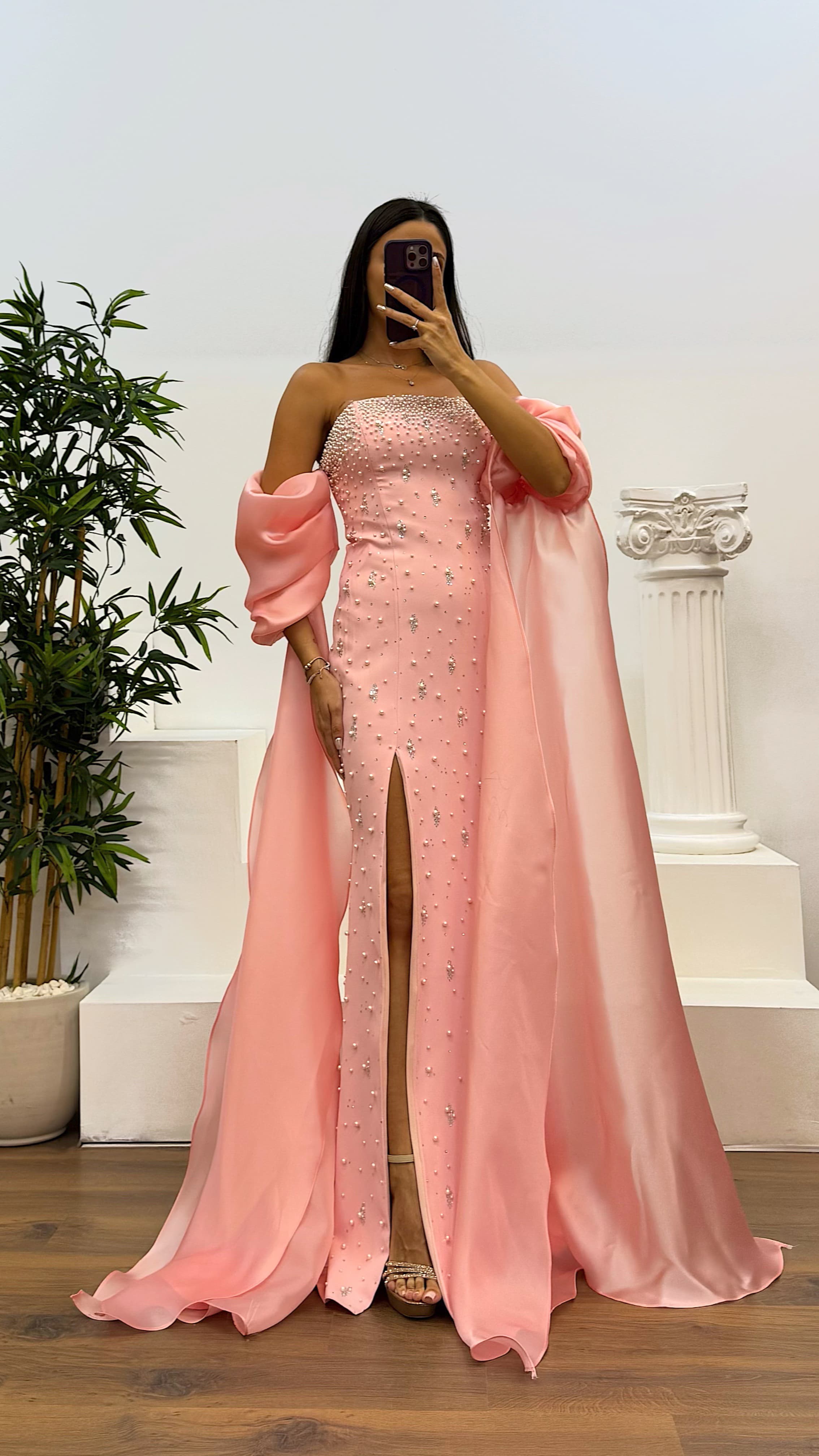 Balon kol inci detay abiye elbise