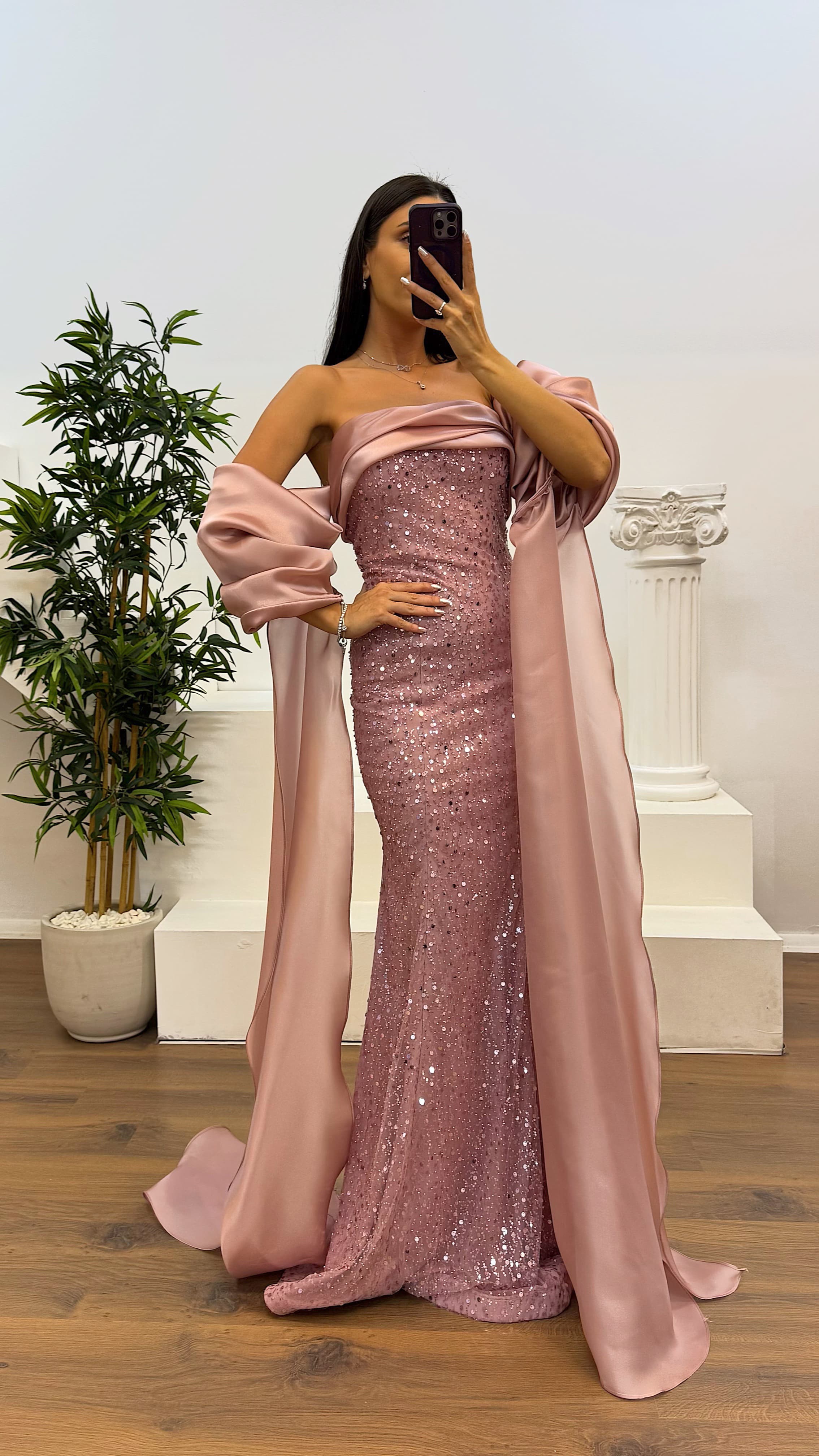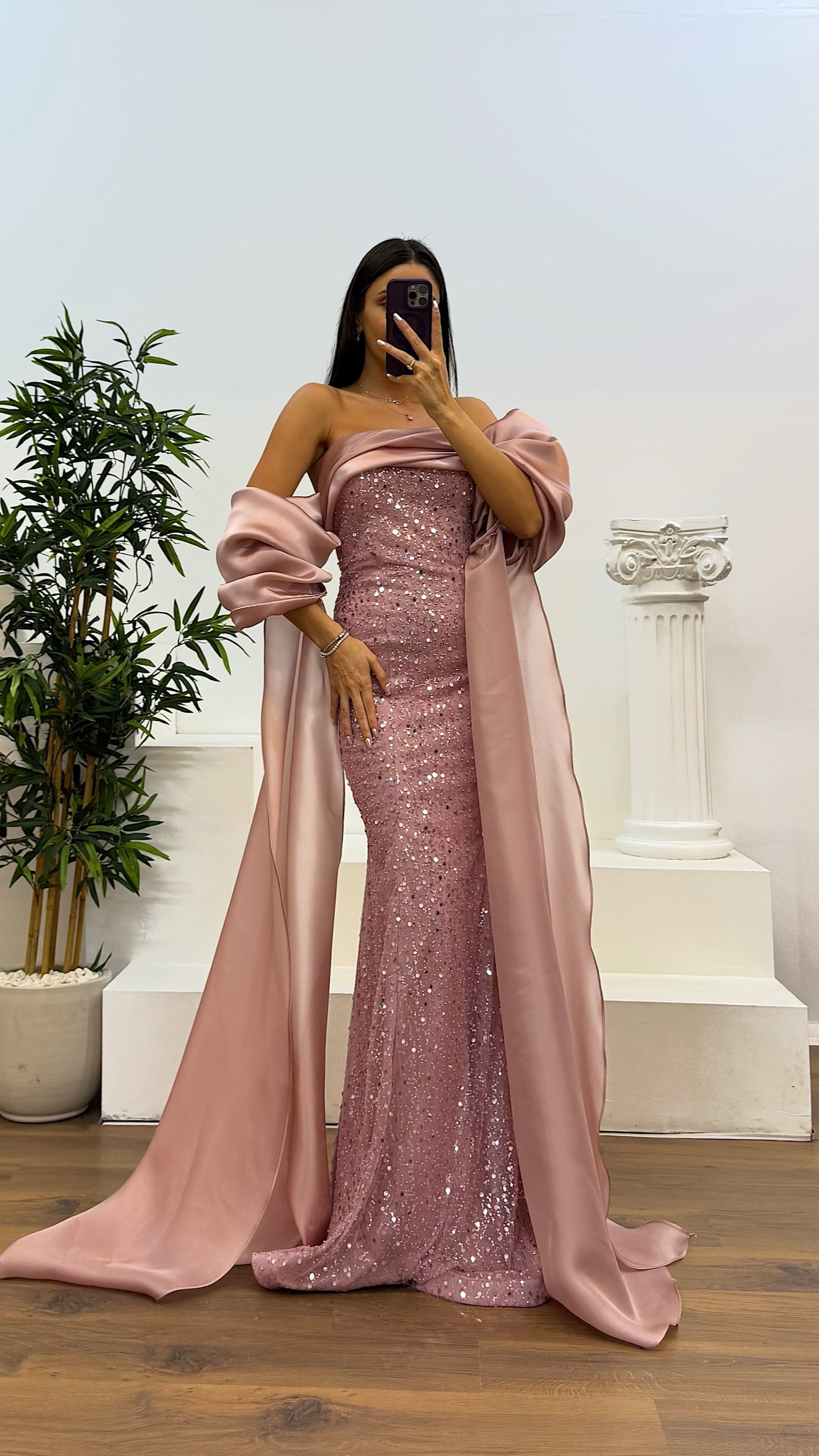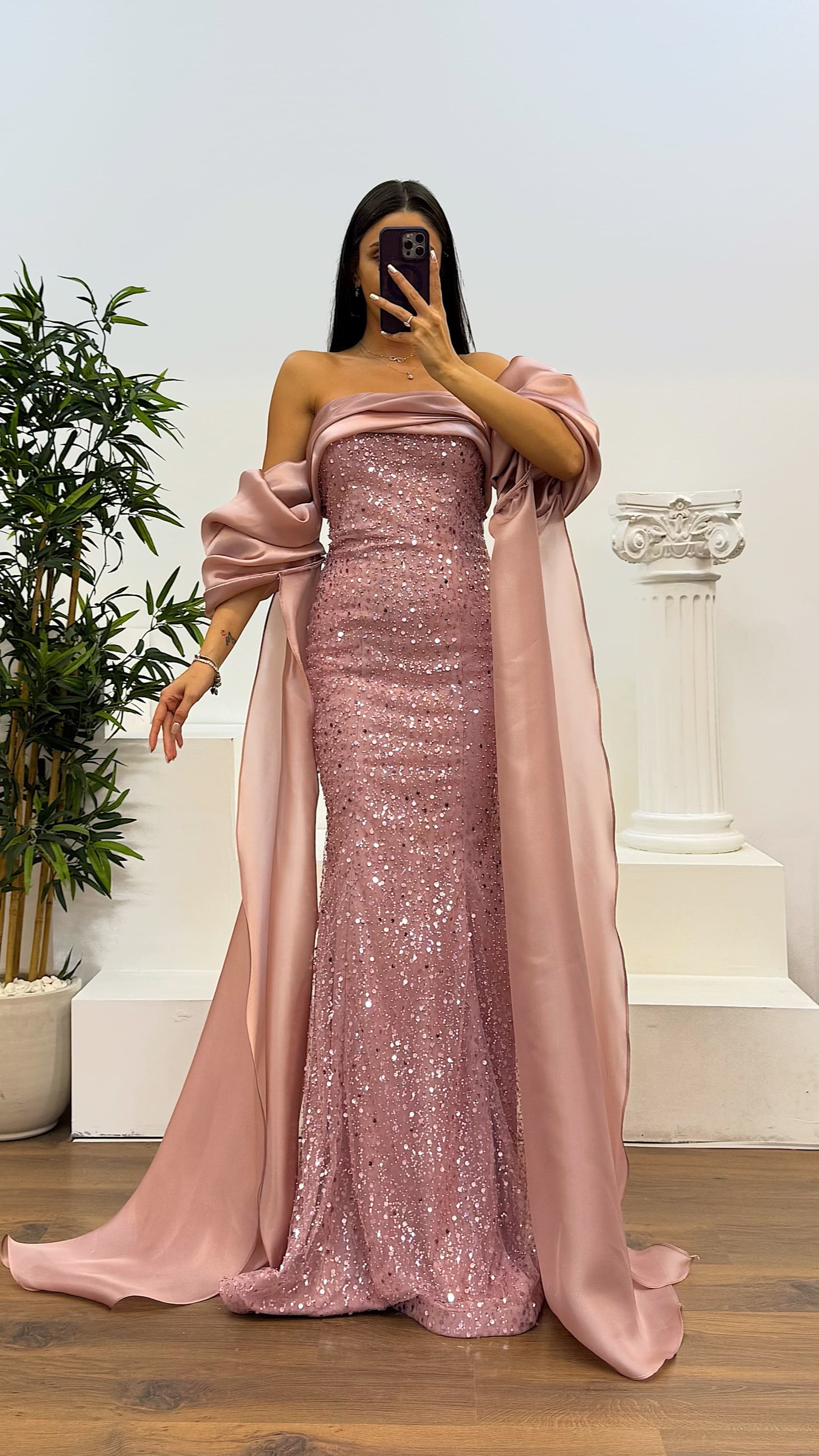 Pudra Balon Kol İşlemeli Abiye Elbise