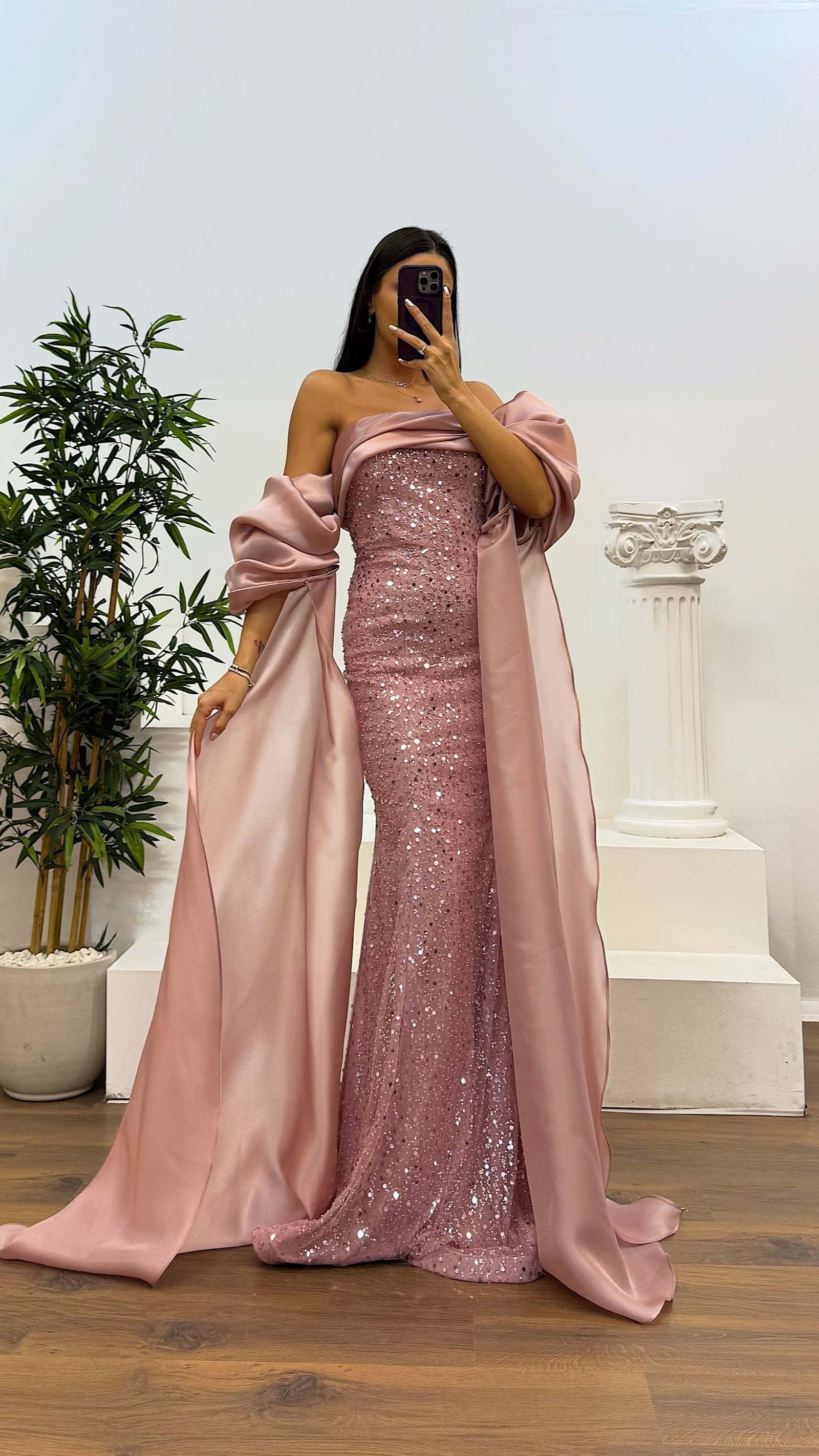 • Pudra Balon Kol İşlemeli Abiye Elbise