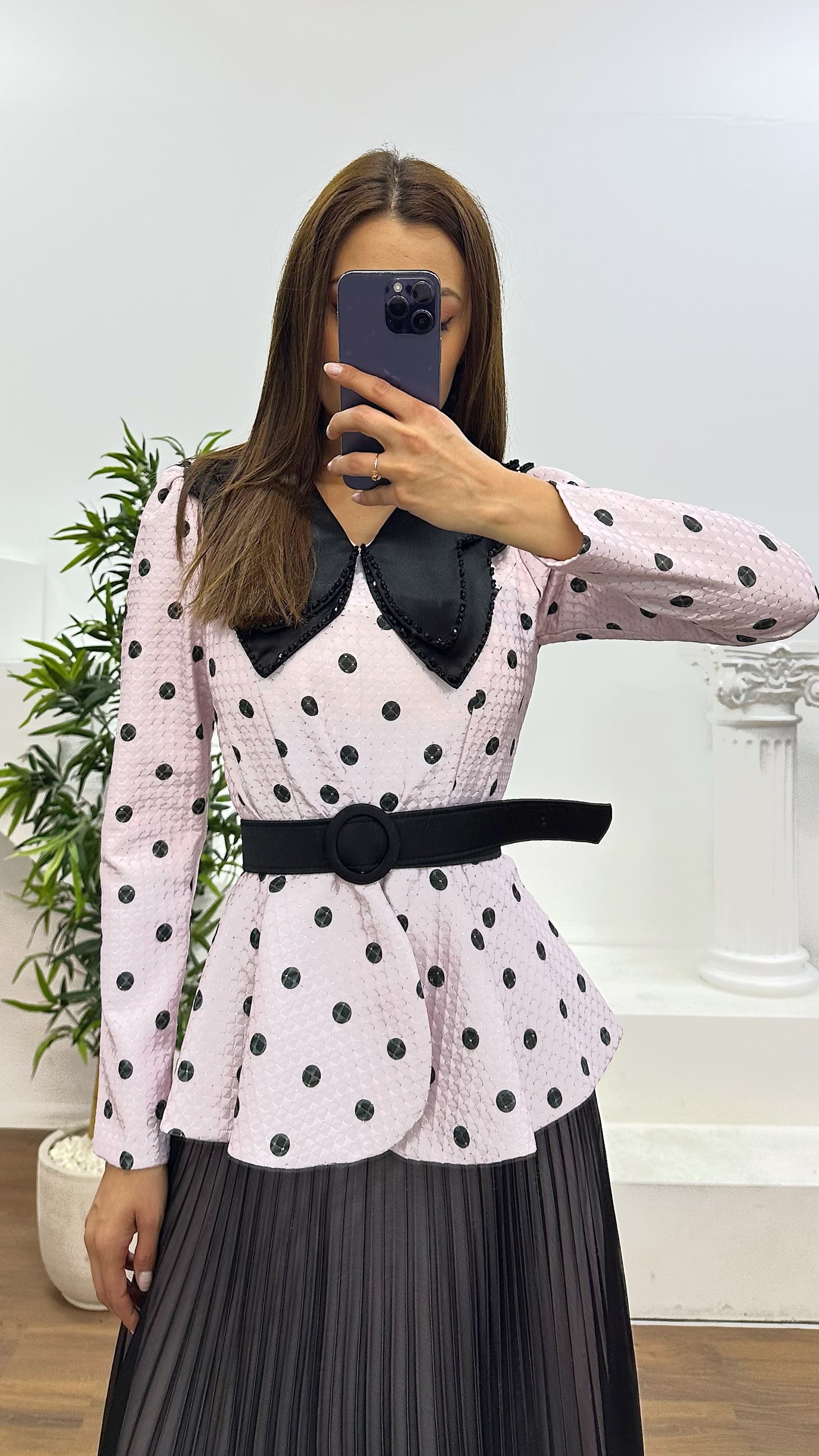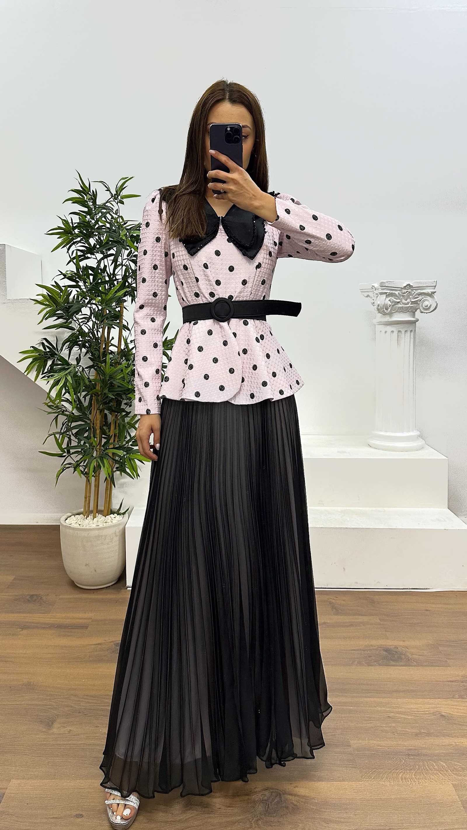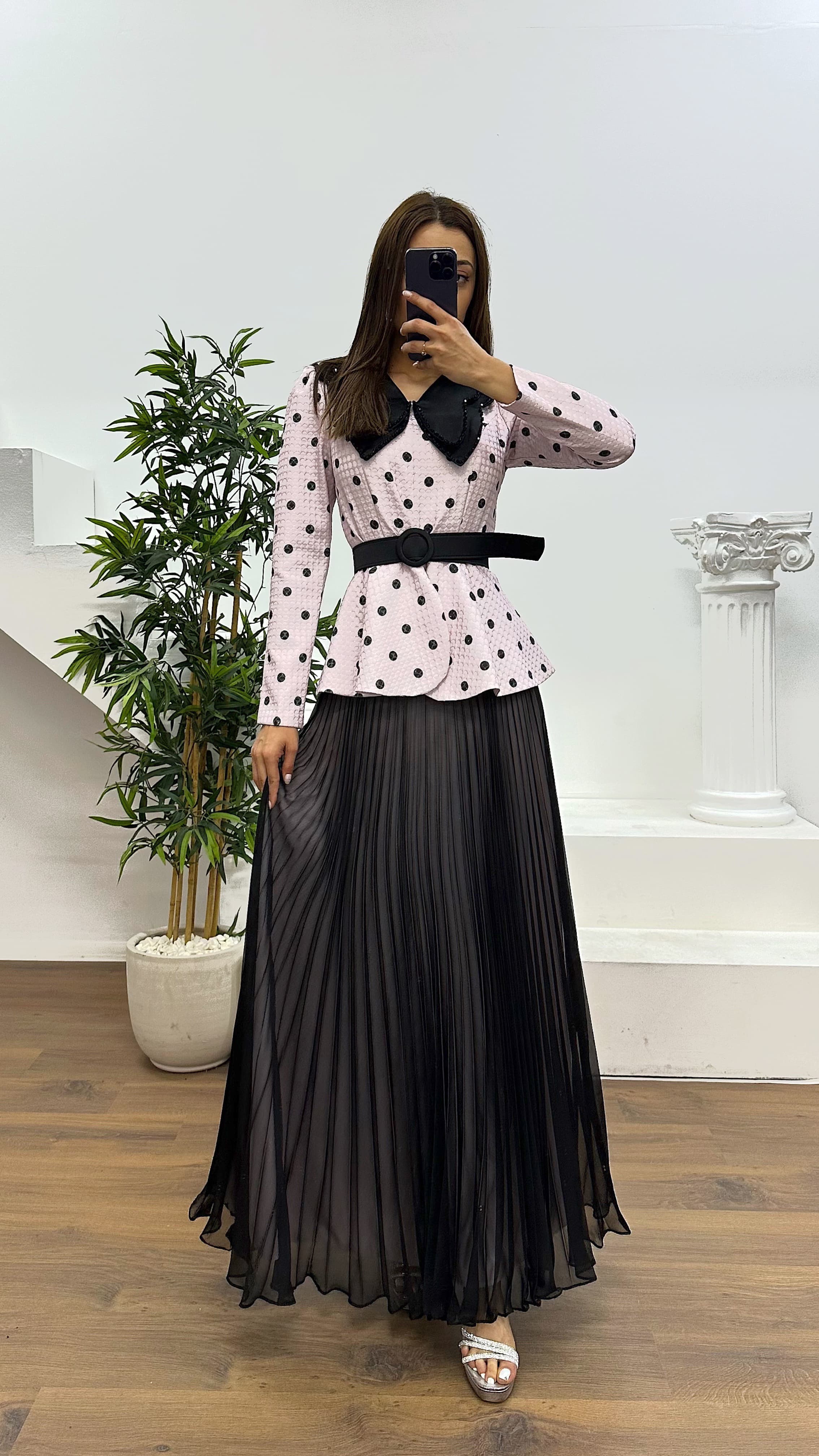Ürün 36-42 bedene kadar uyumlu, arka kapama fermuar, kemerli, piliseli, bebe yaka etek takım olarak tasarlanmıştır.