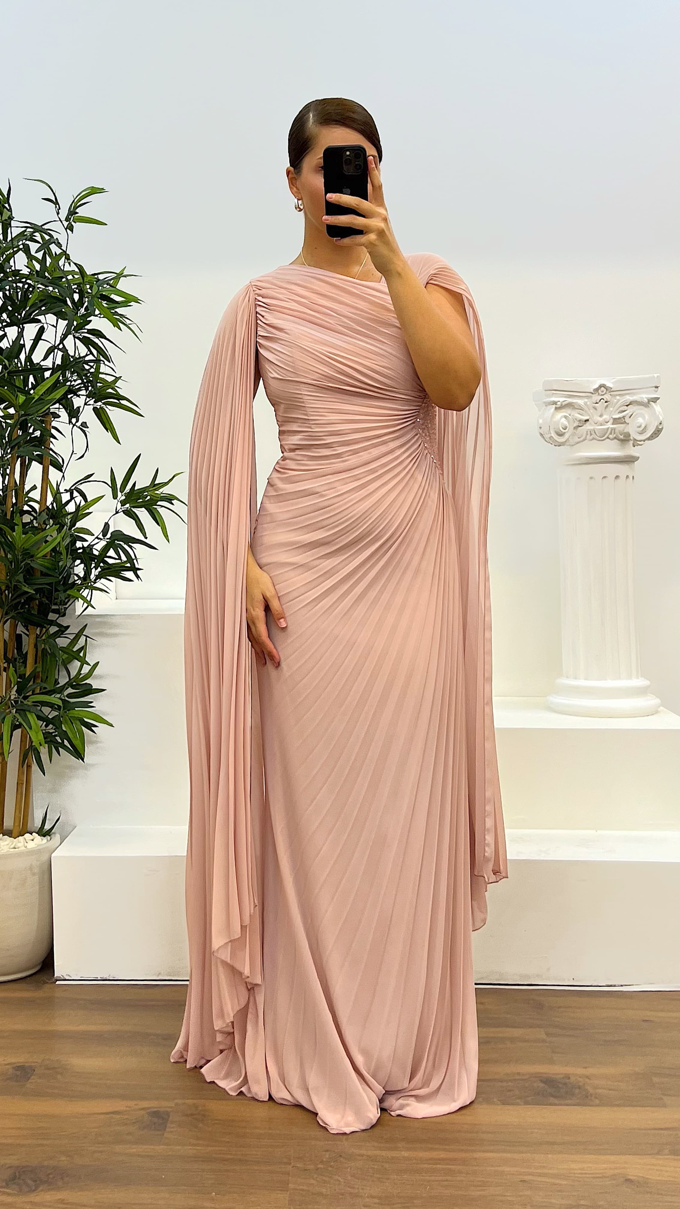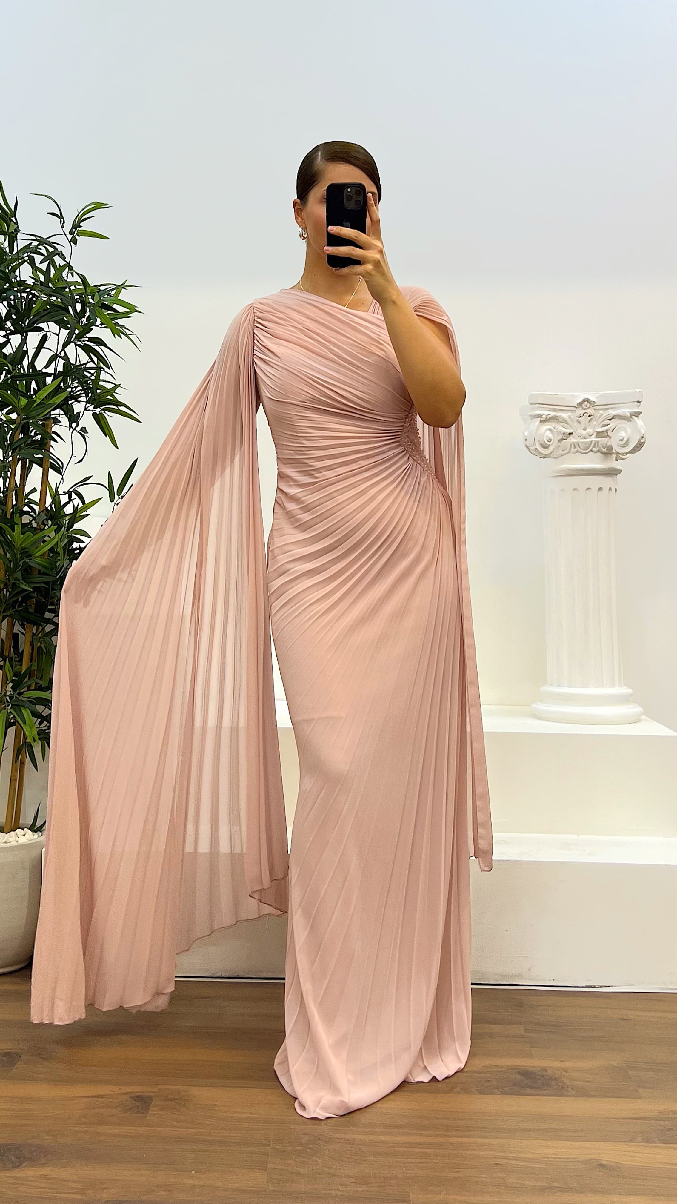 Ürün 44-48 bedene kadar uyumlu, göğüs pedli, astarlı, yan fermuarlı, bel işlemeli abiye olarak tasarlanmıştır.