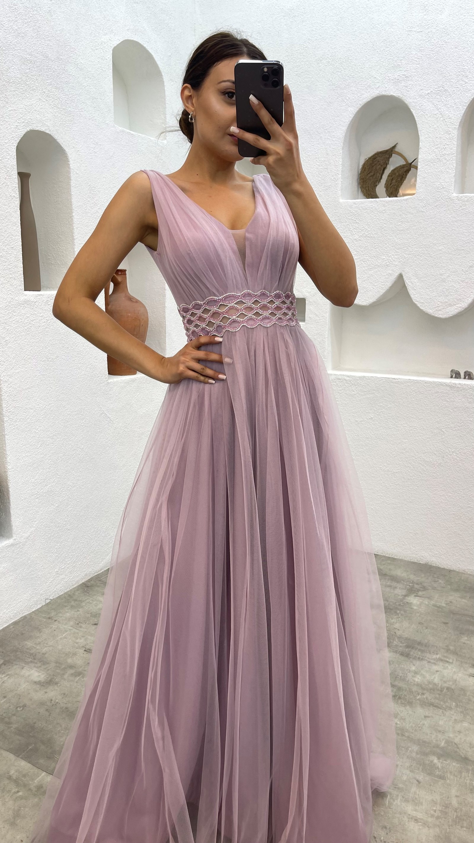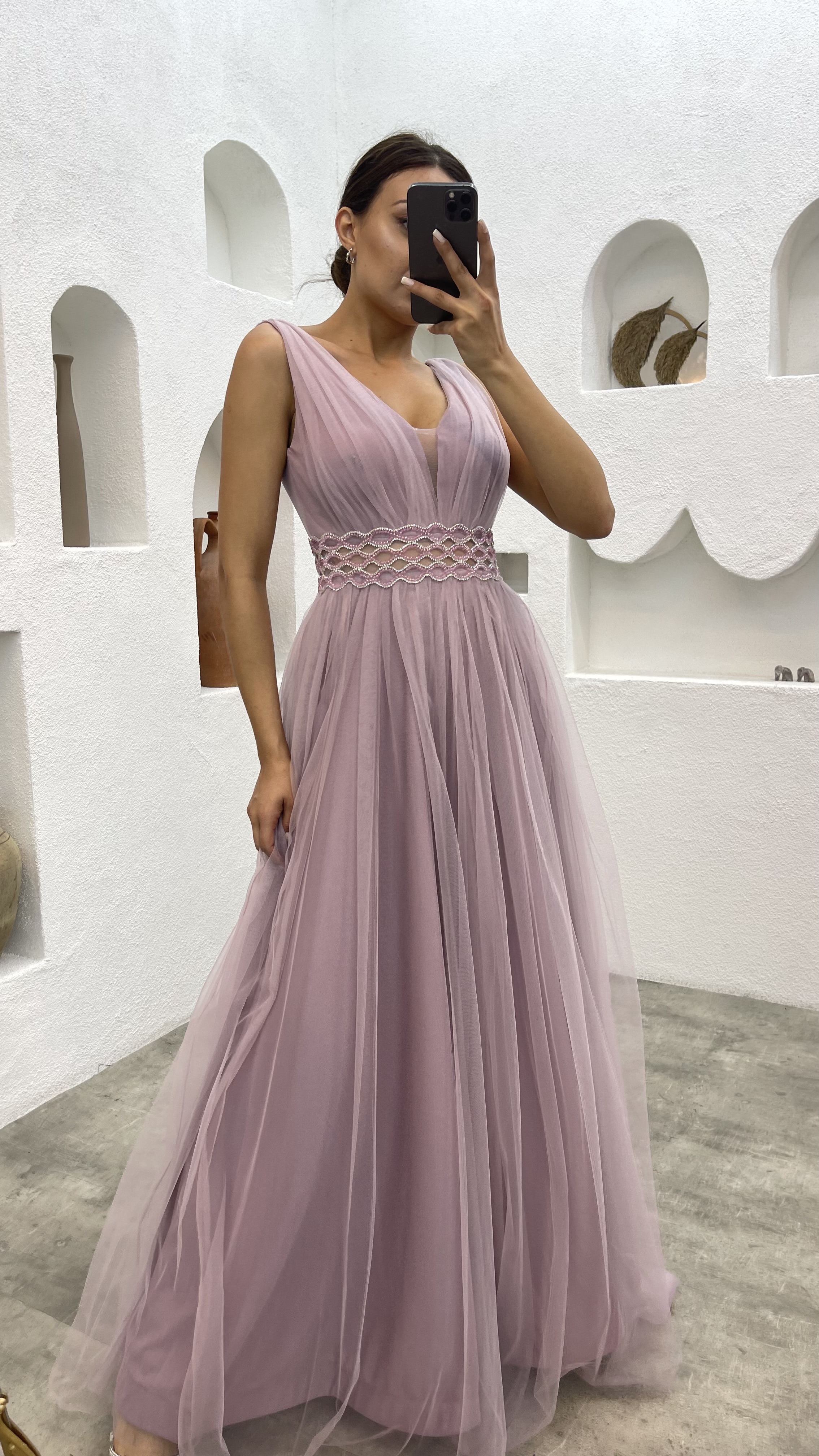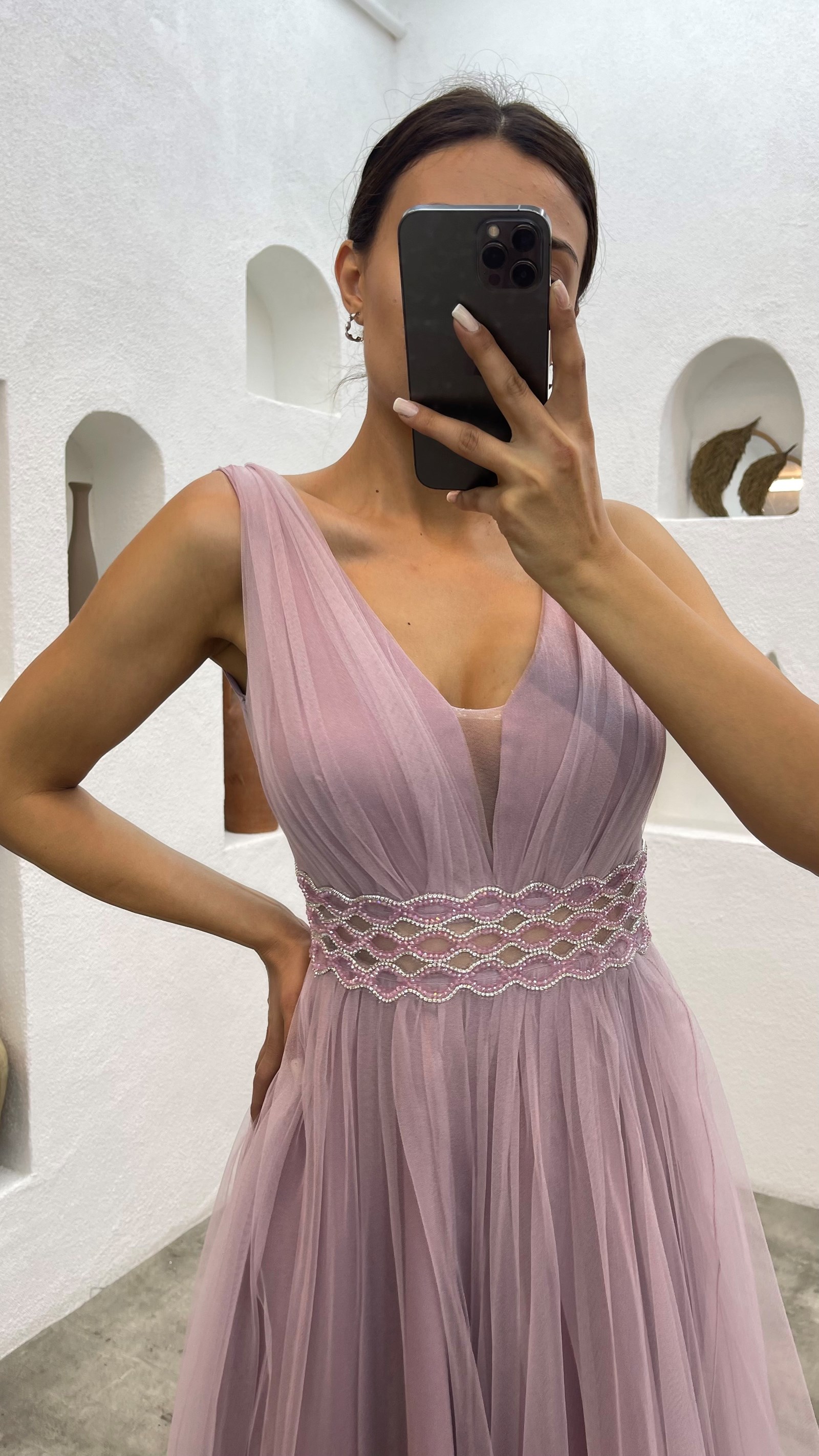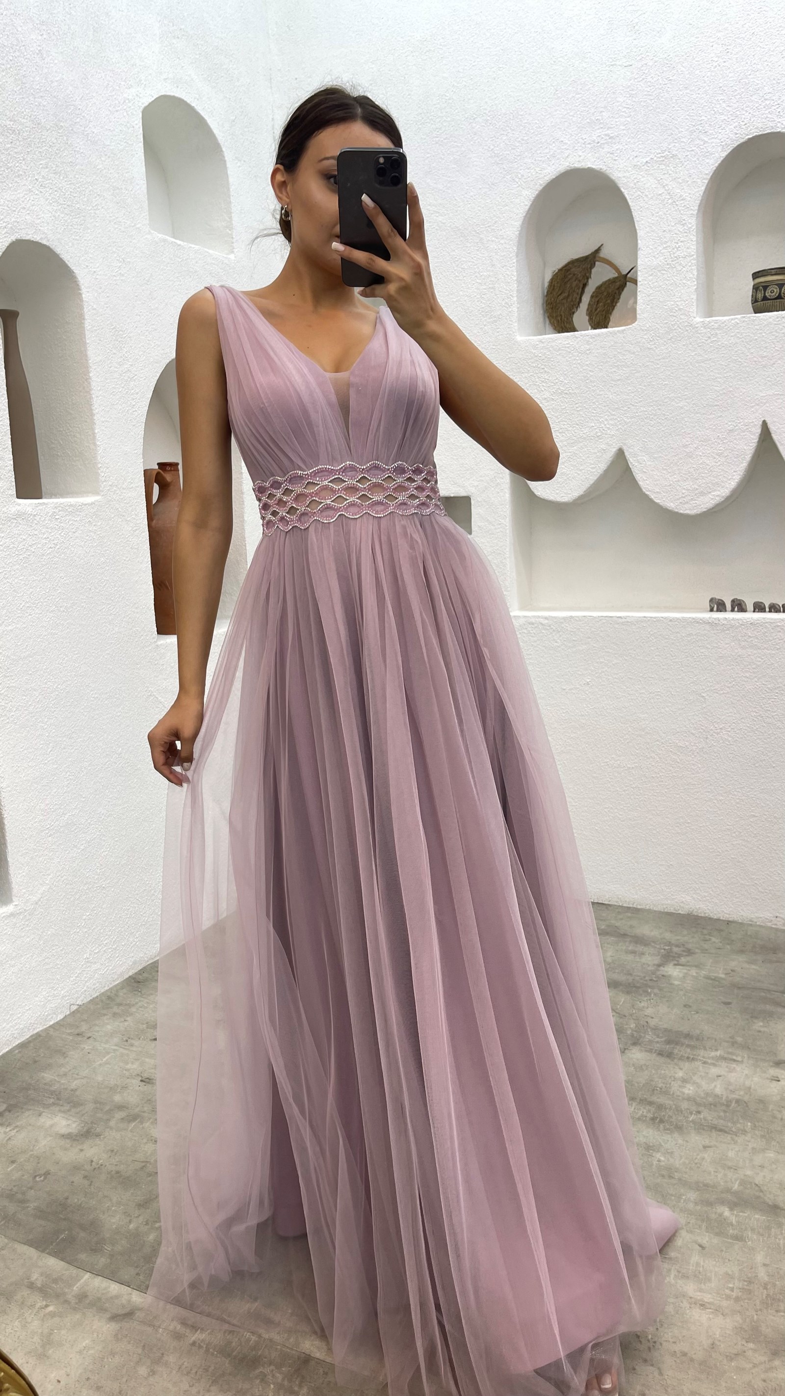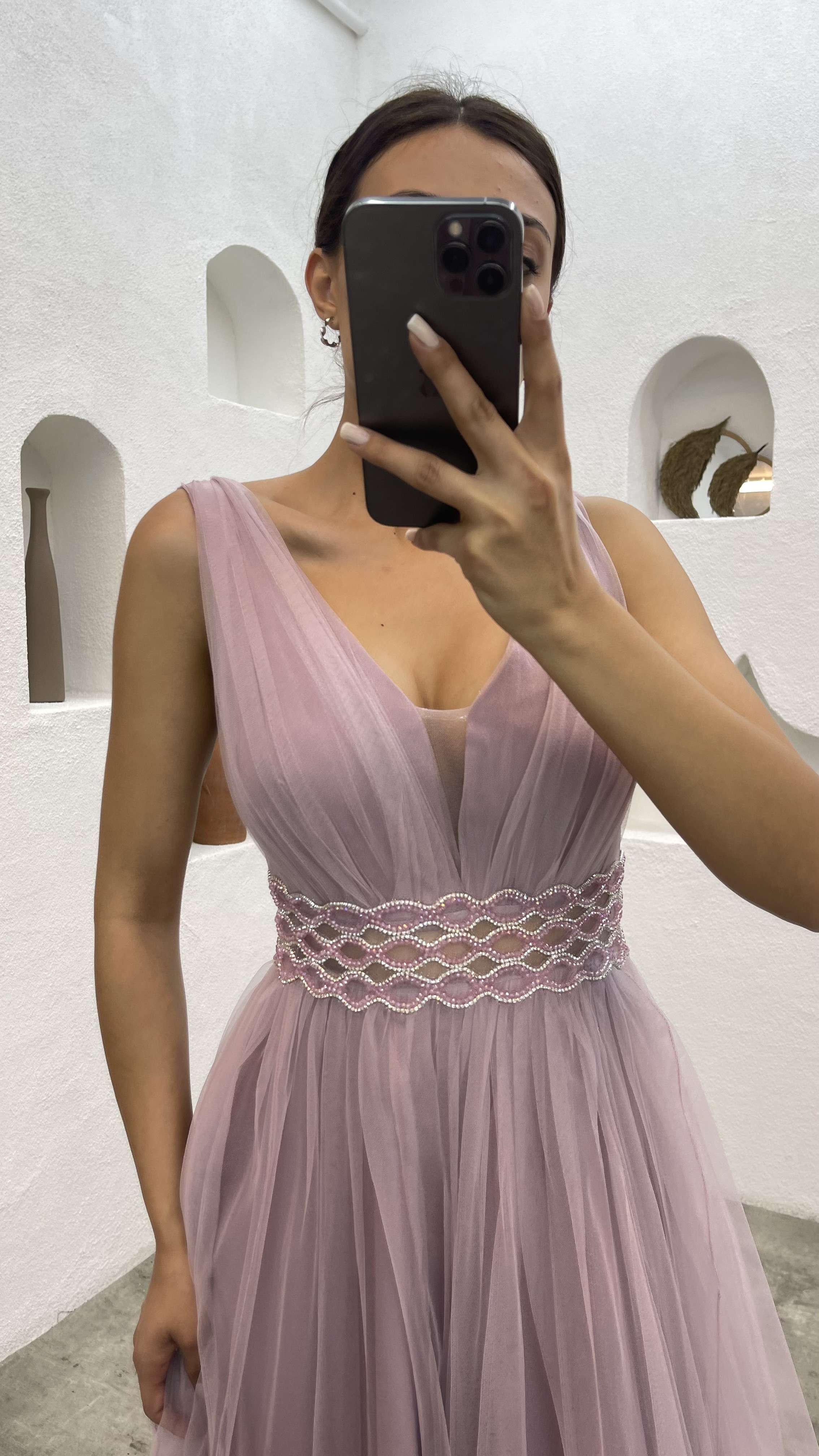Pudra Beli Taş İşlemeli Abiye Elbise
