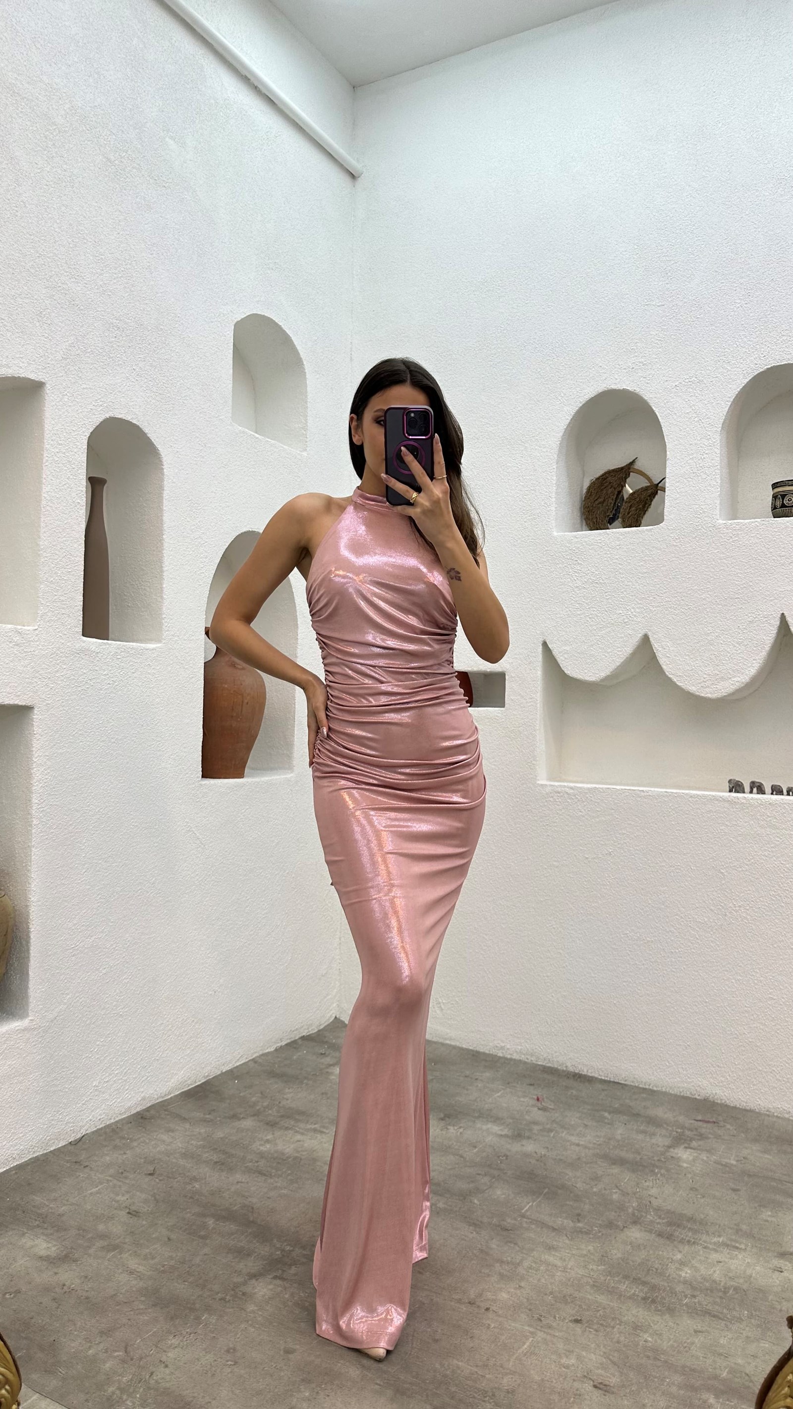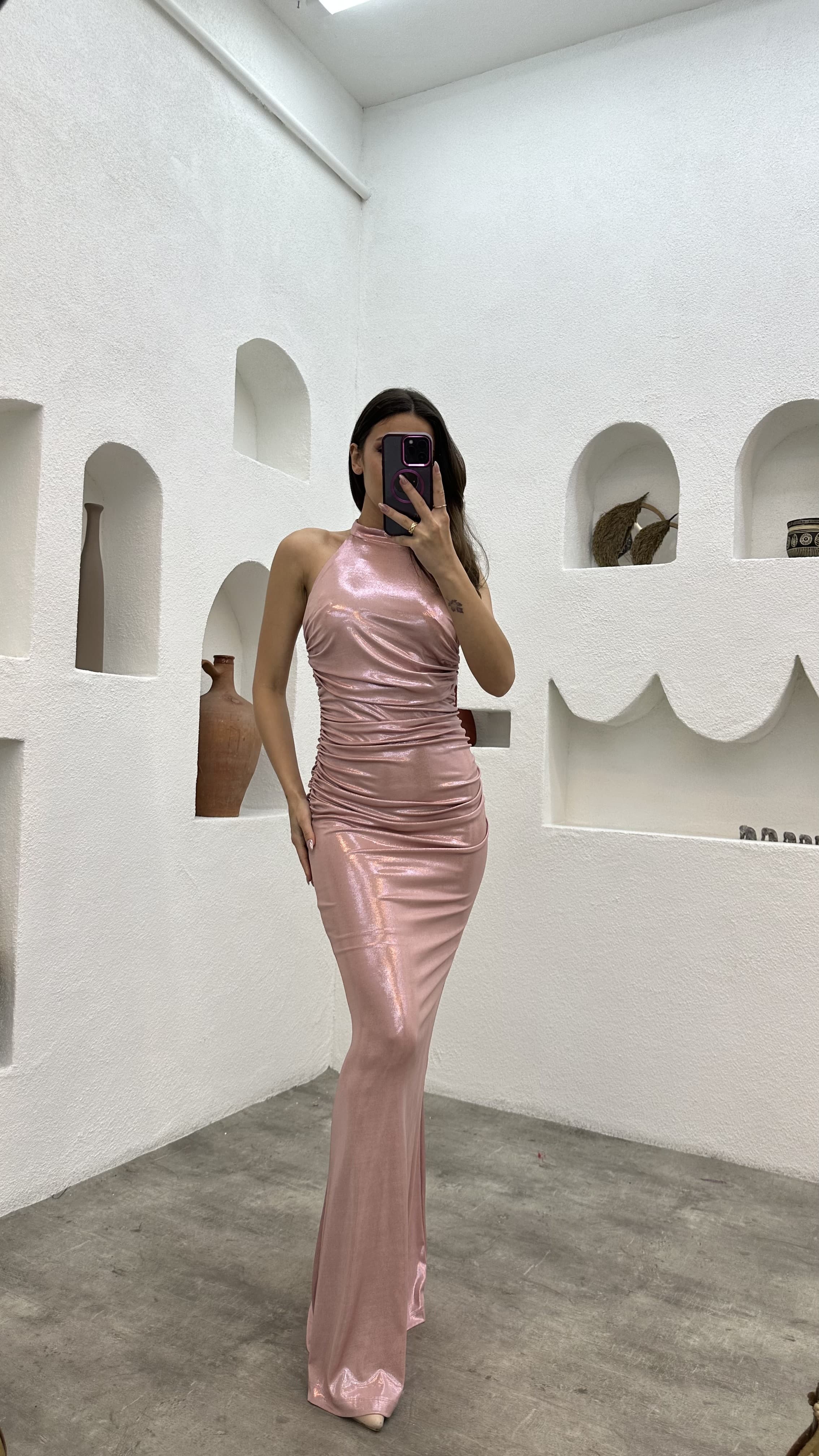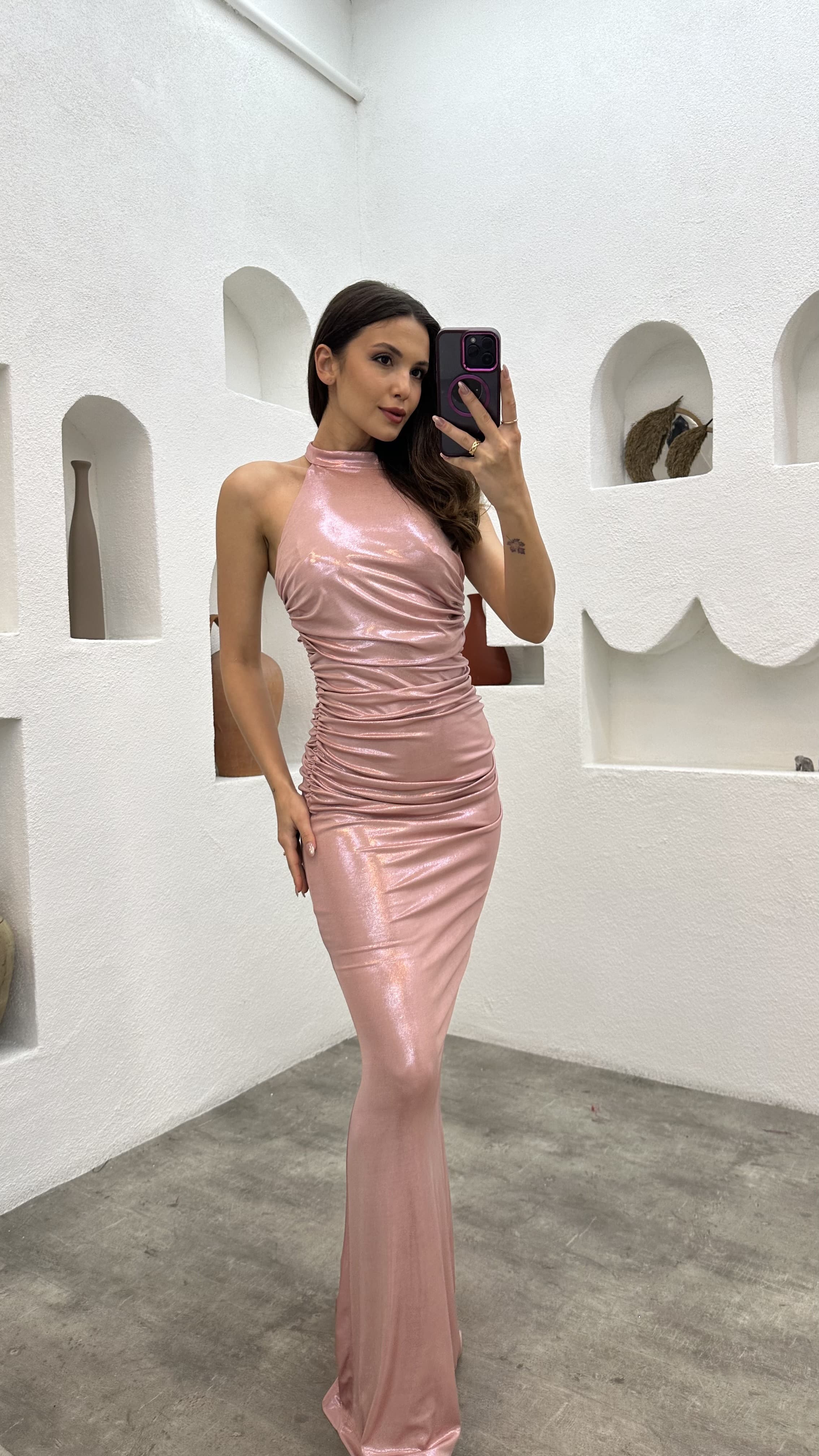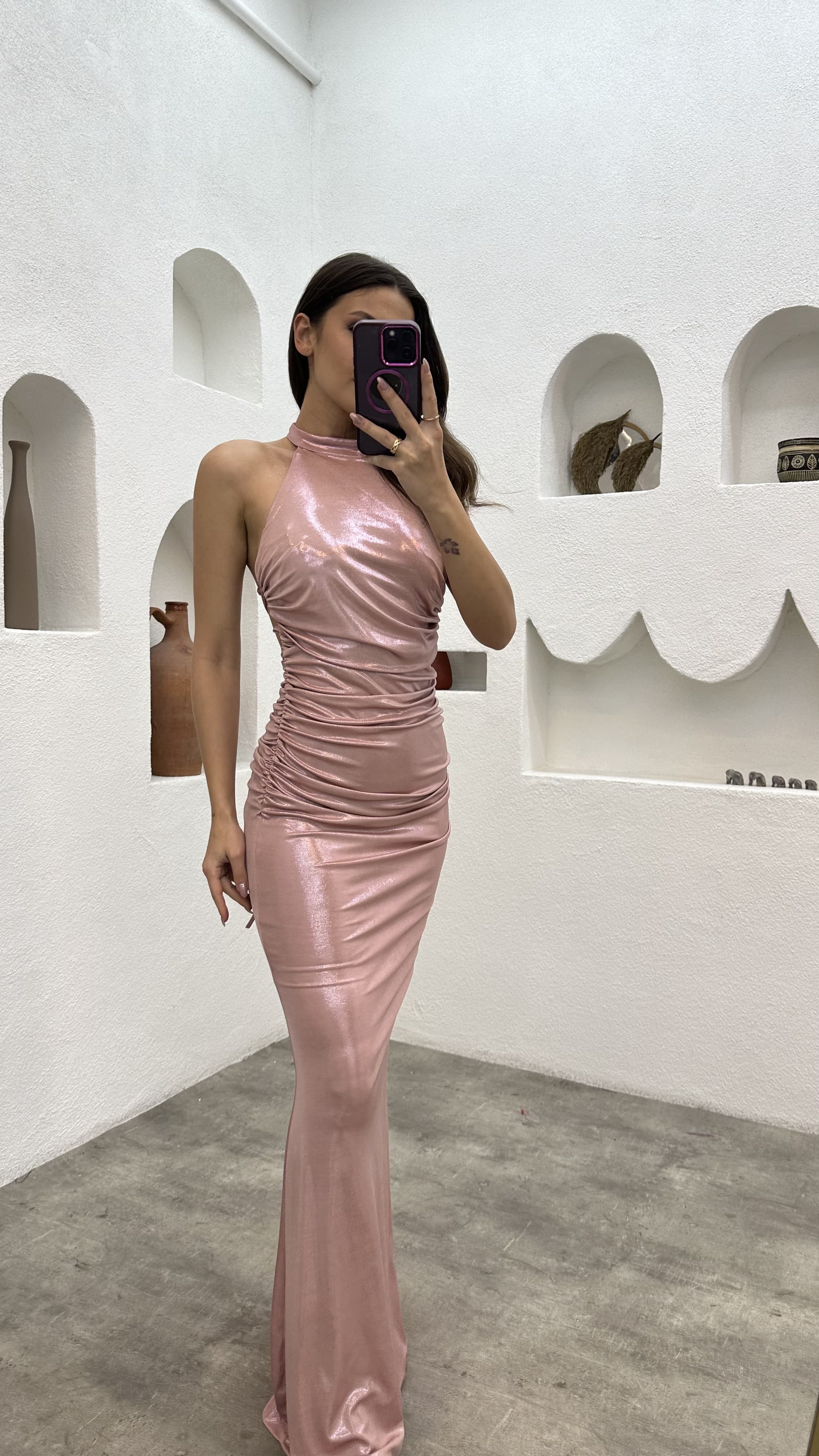• Pudra Boyun Detay Drapeli Elbise