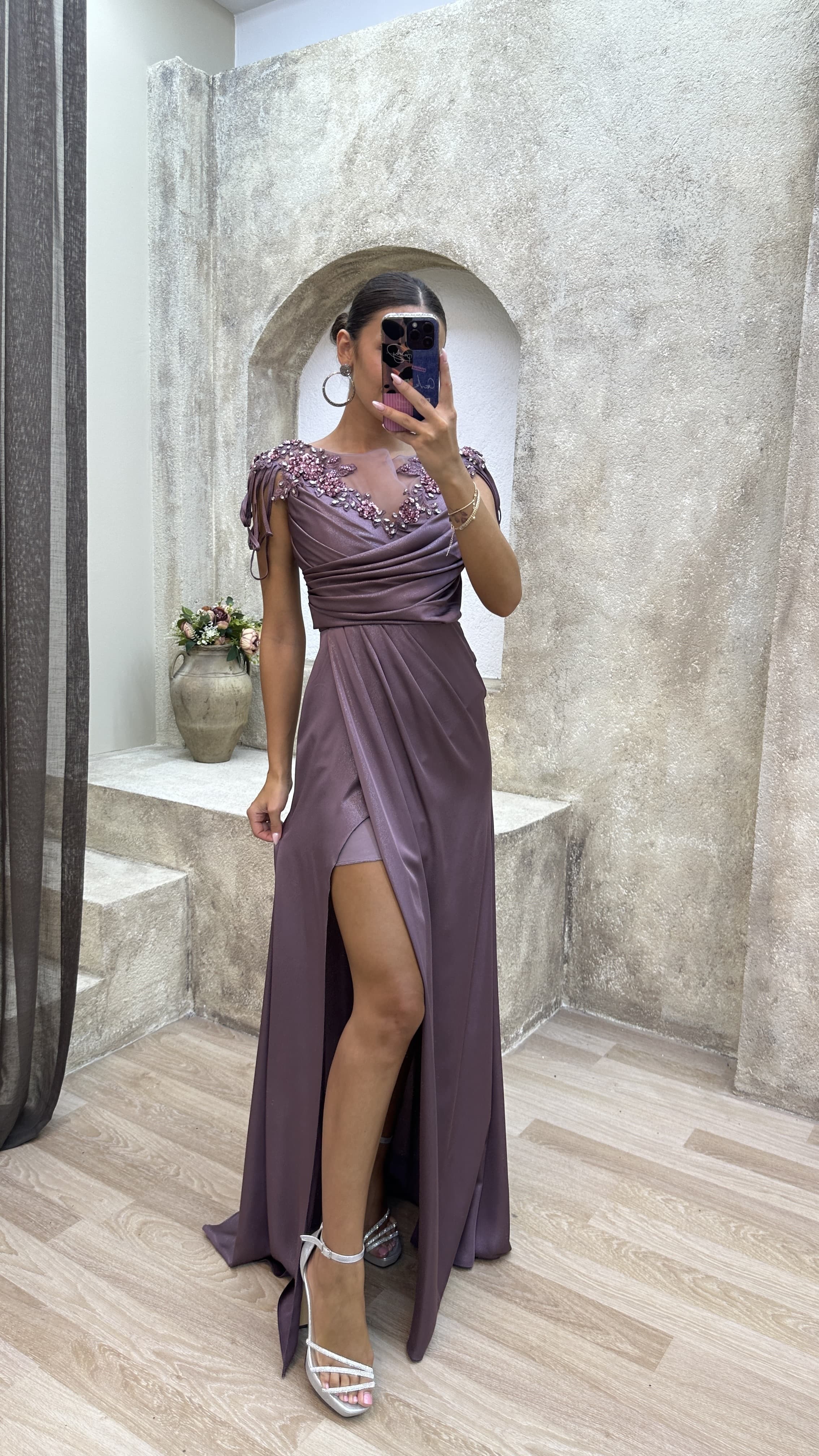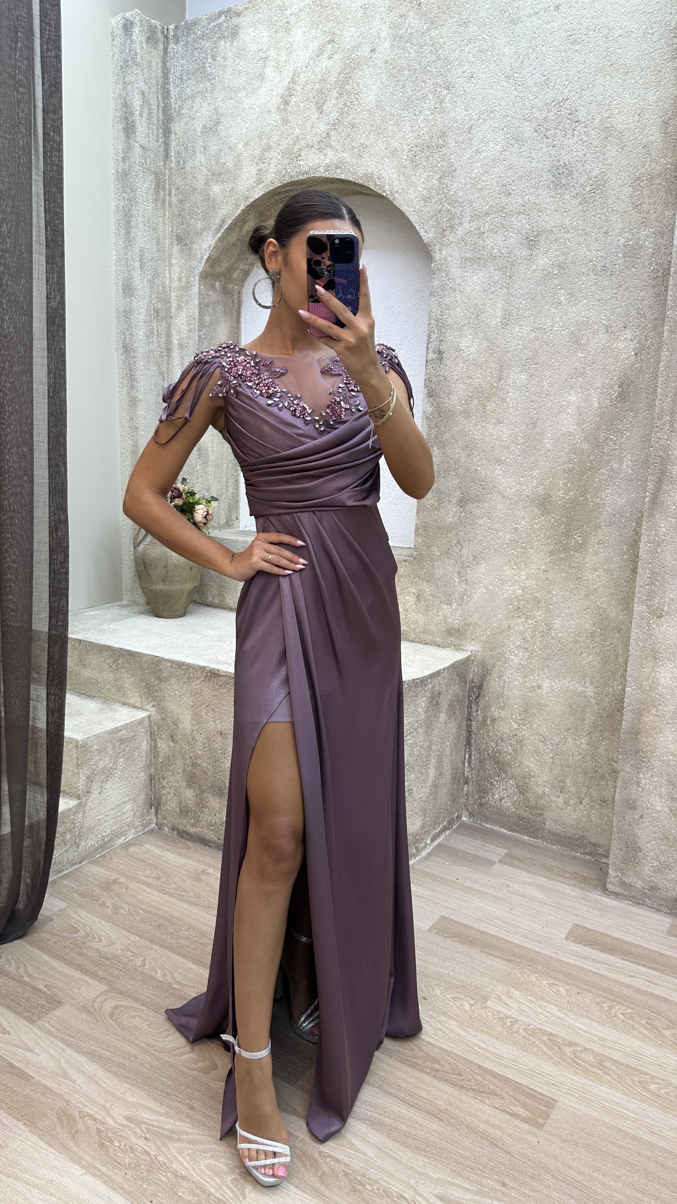 • Gri Göğsü İşlemeli Büzgülü Saten Abiye Elbise