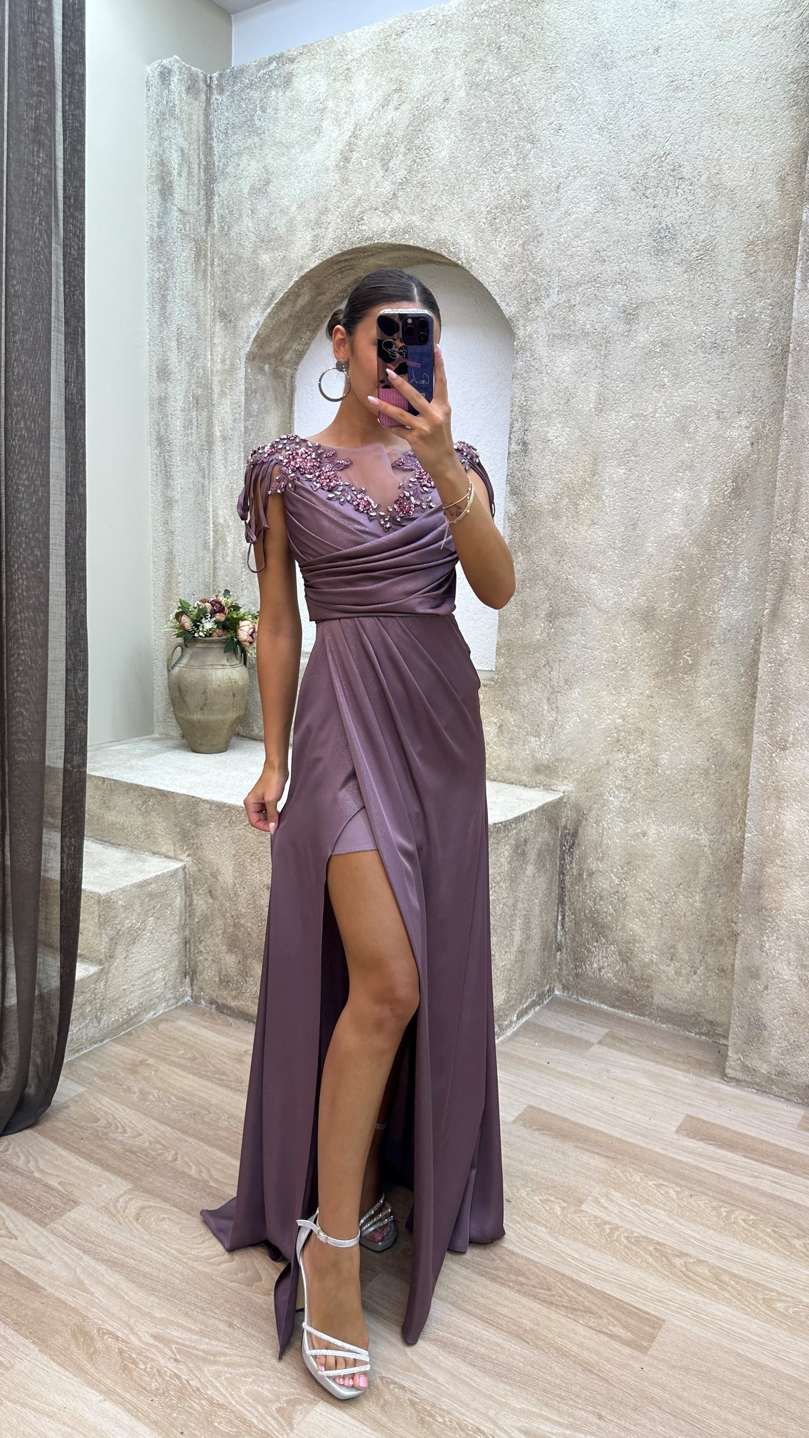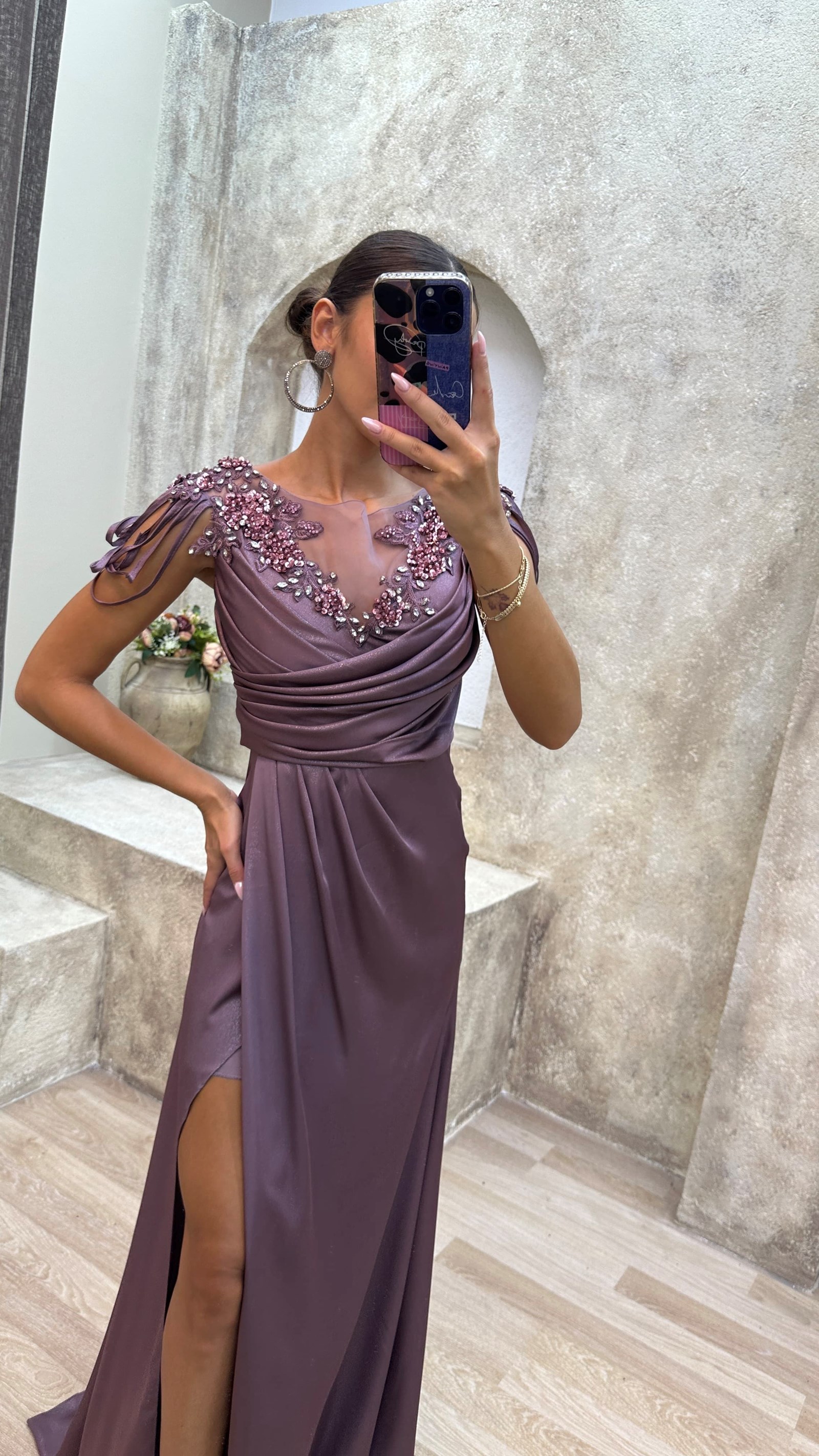 • Pudra Göğsü İşlemeli Büzgülü Saten Abiye Elbise