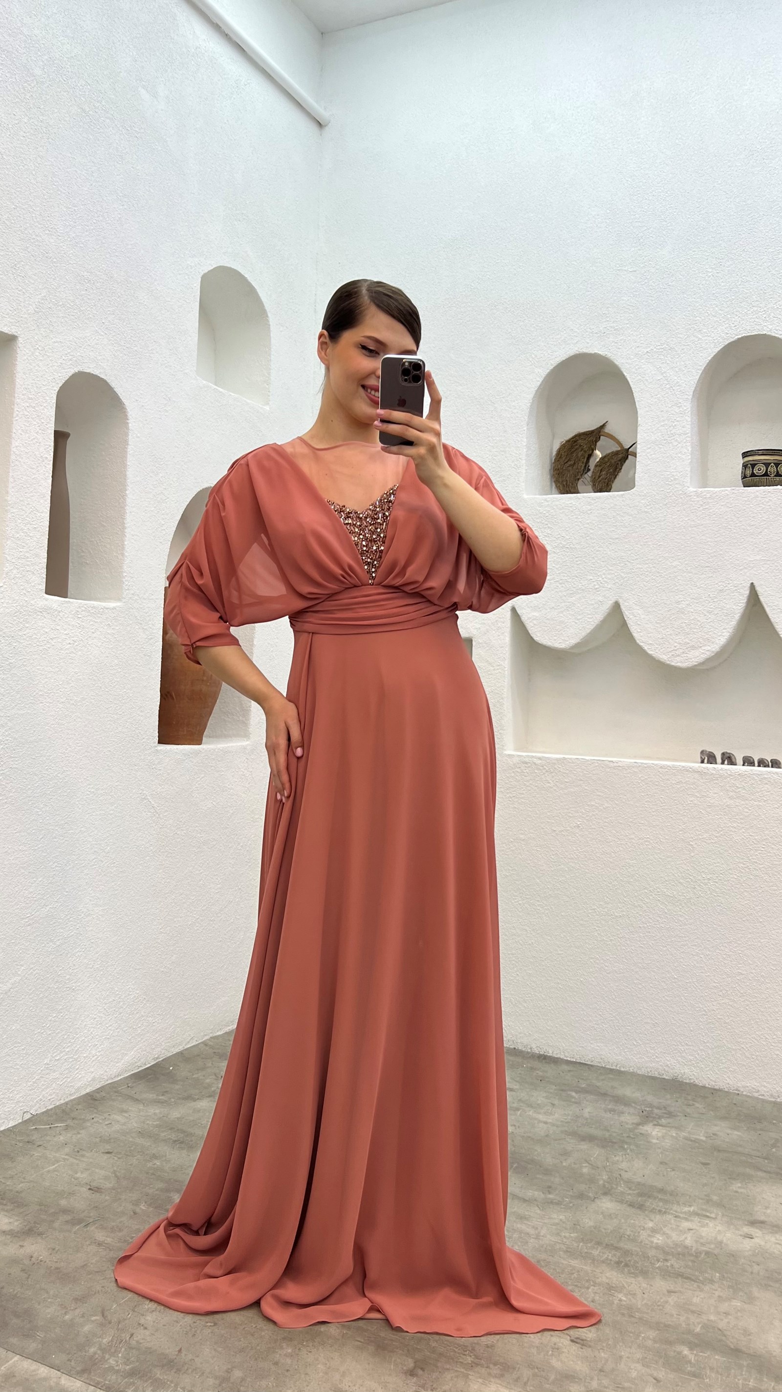 Pudra Göğsü İşlemeli Drapeli Tül Büyük Beden Abiye Elbise