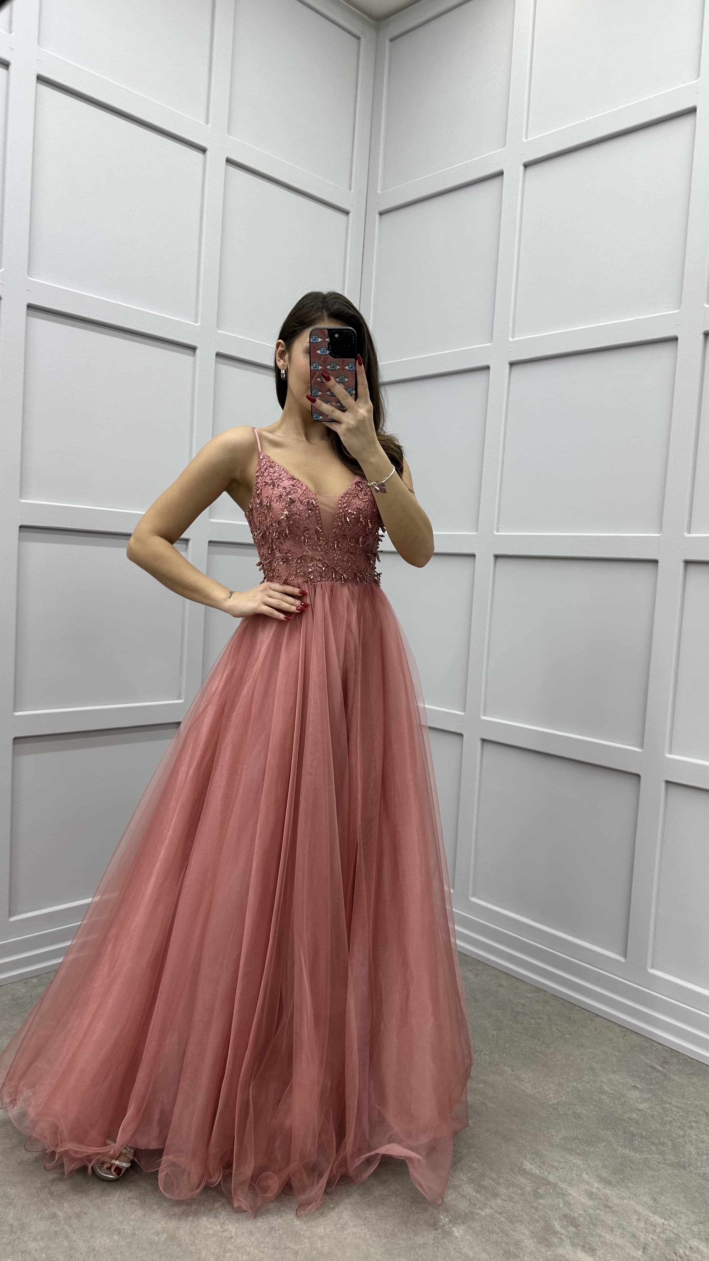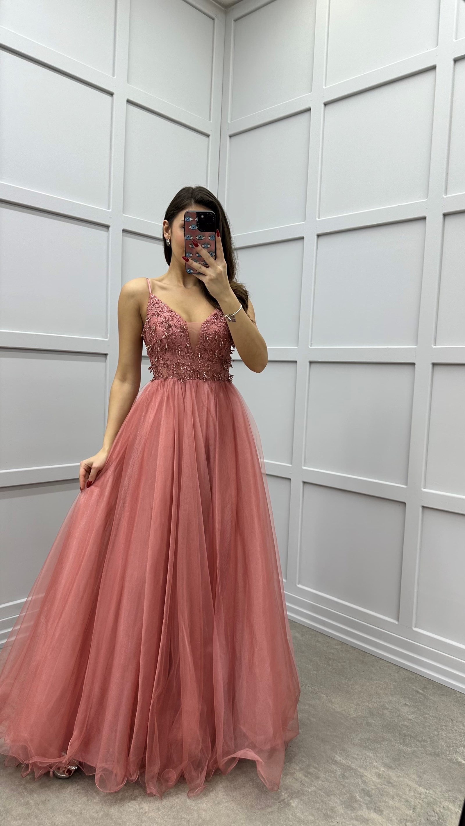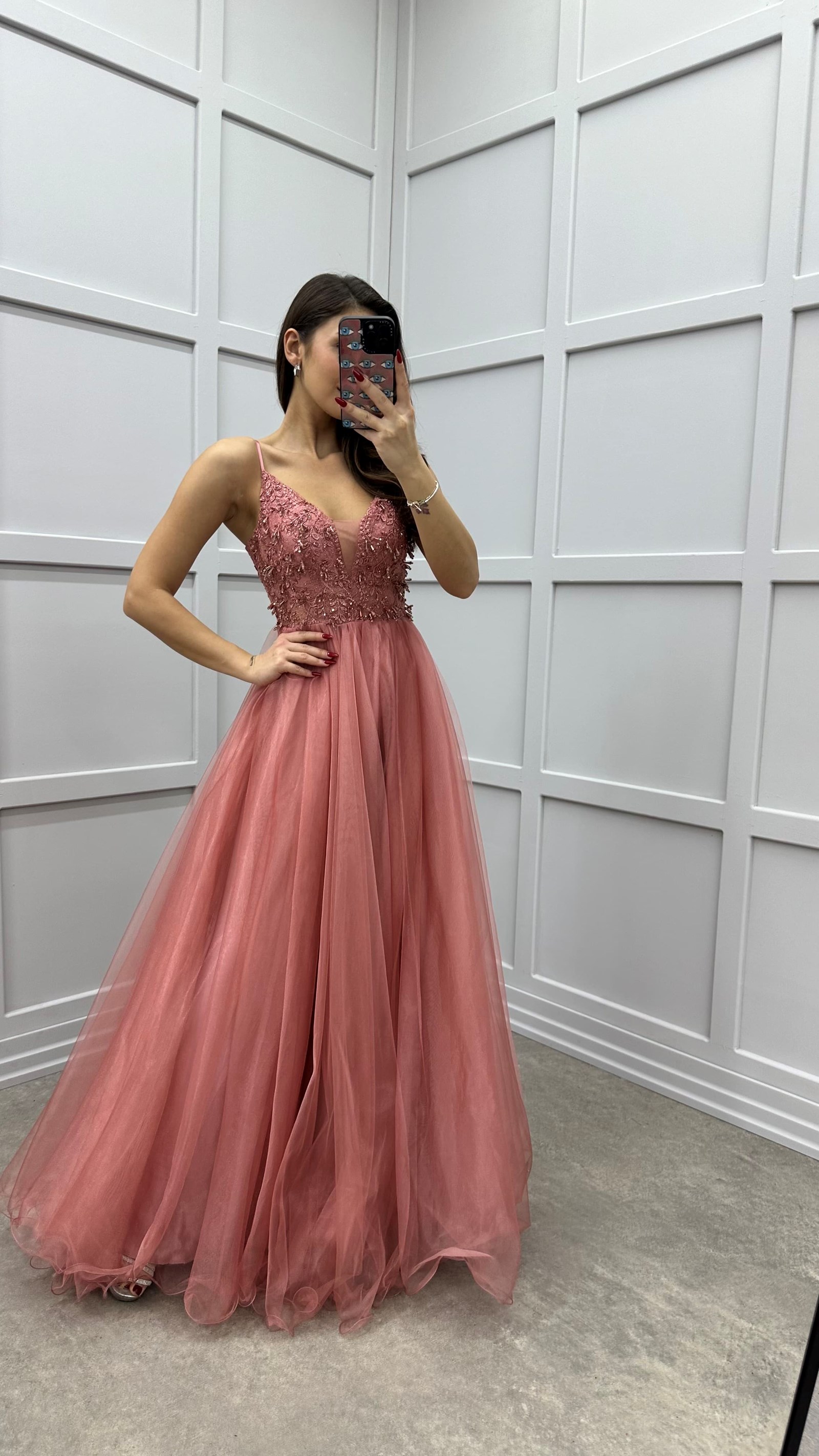 • Pudra İp Askılı Göğüs Detay Tasarım Tül Abiye Elbise