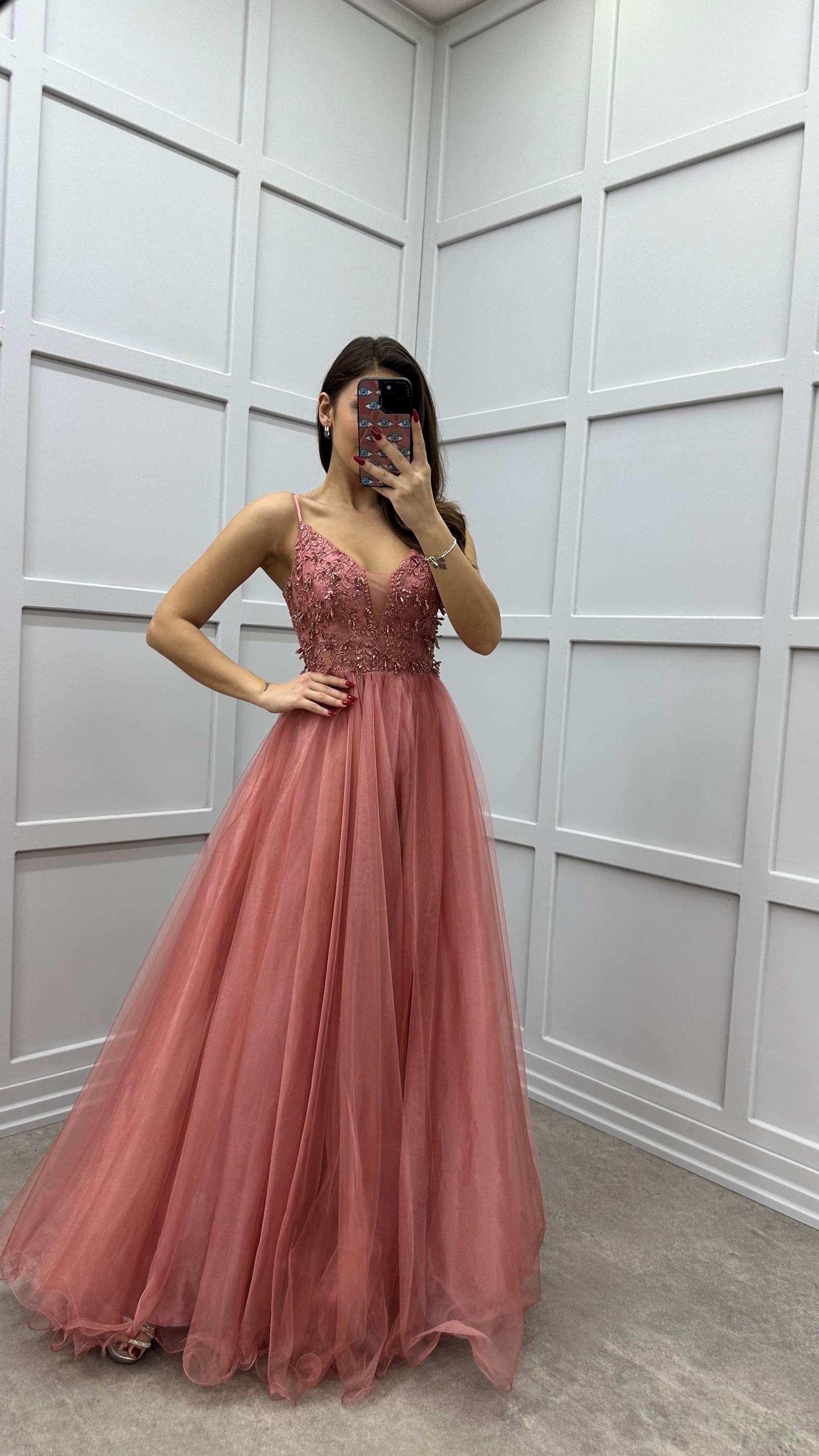 • Kırmızı İp Askılı Göğüs Detay Tasarım Tül Abiye Elbise