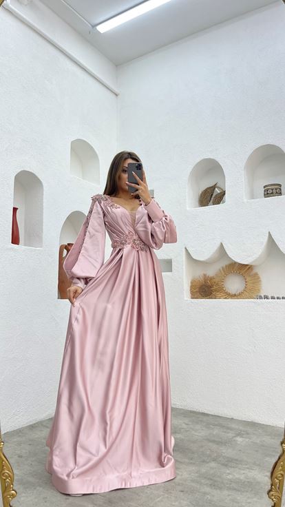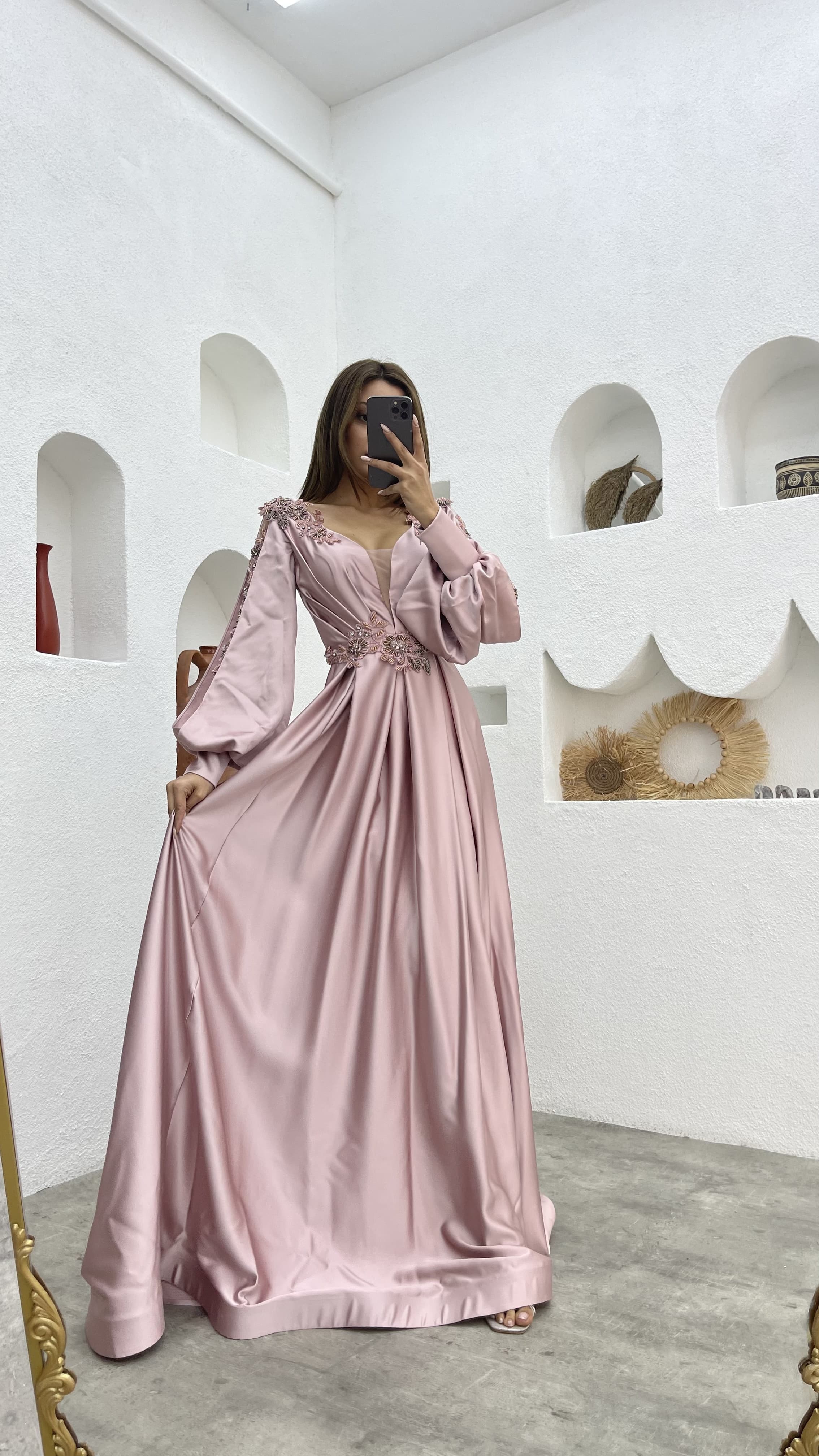 Pudra İşlemeli Motifli Saten Abiye Elbise