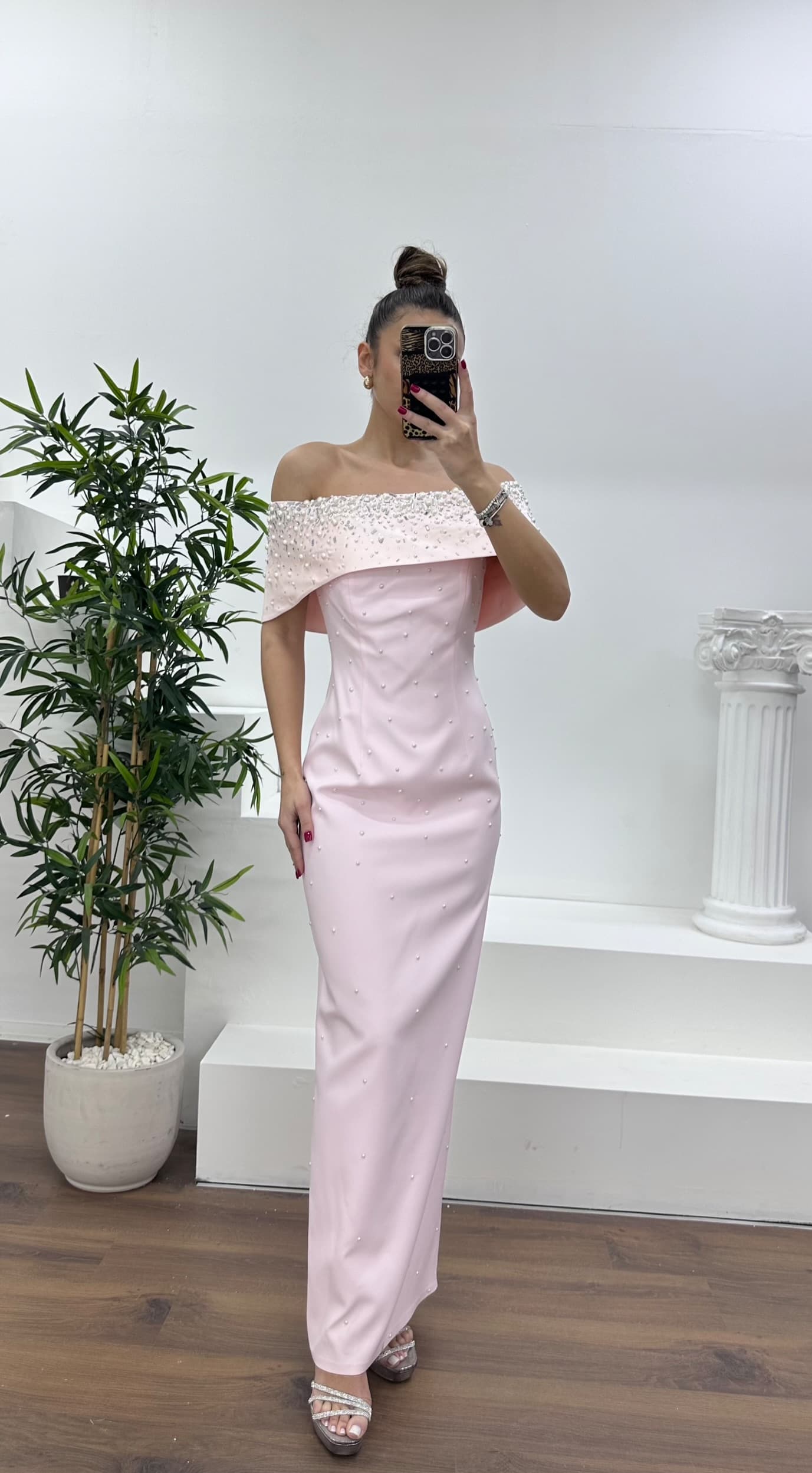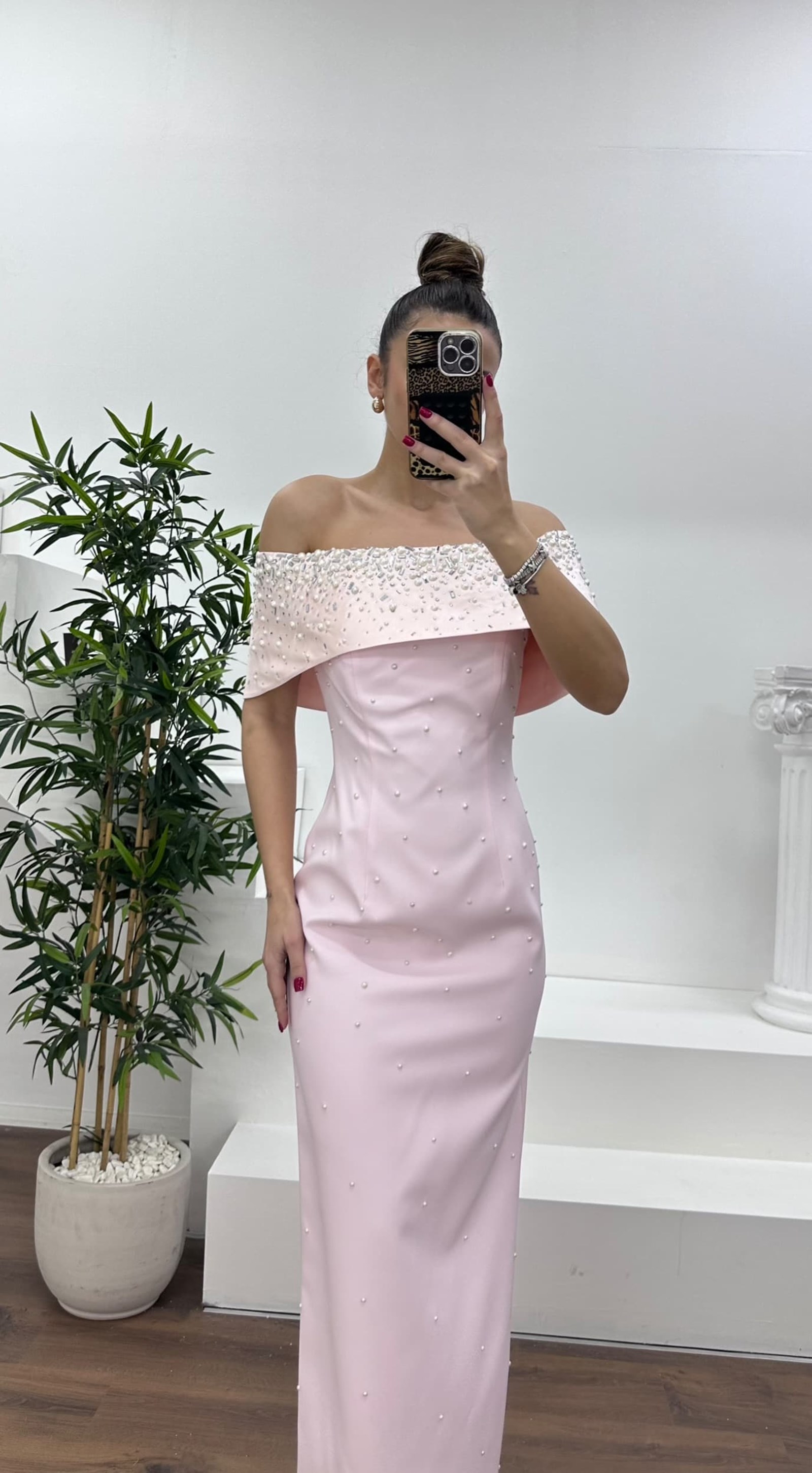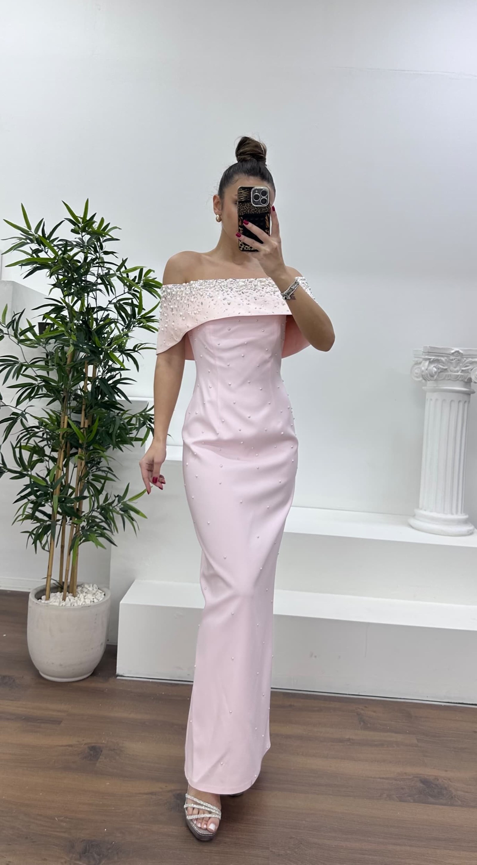 • Pudra Kayık Yaka İnci Detaylı Abiye Elbise