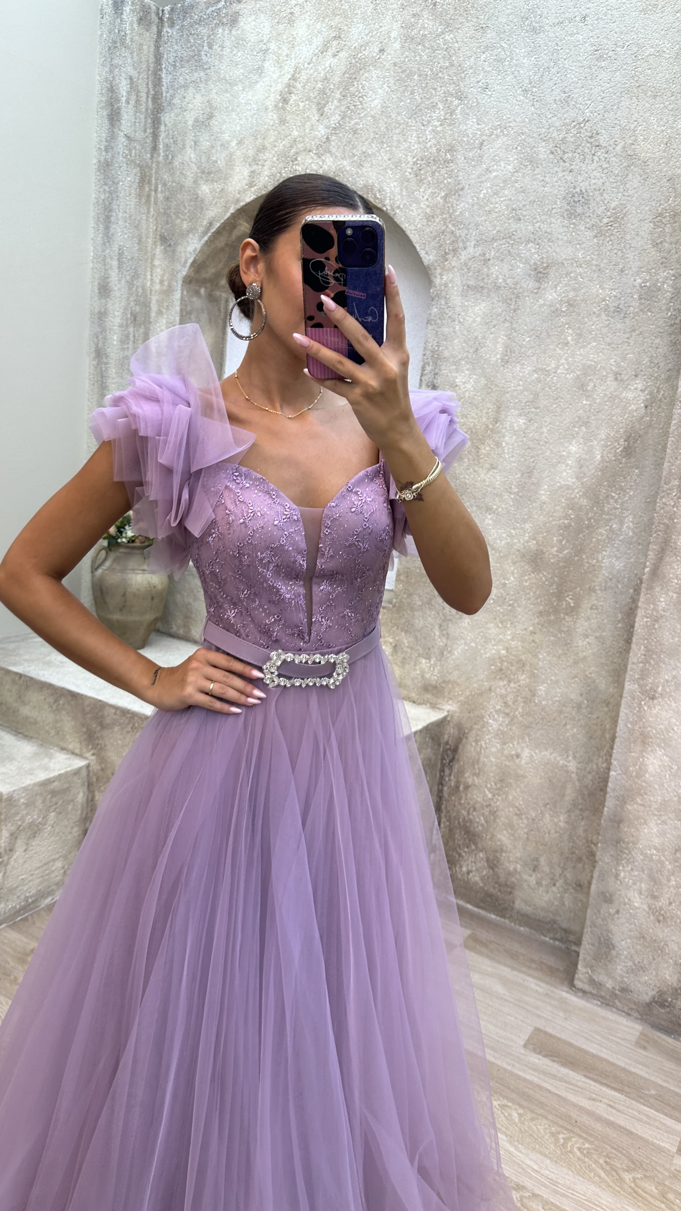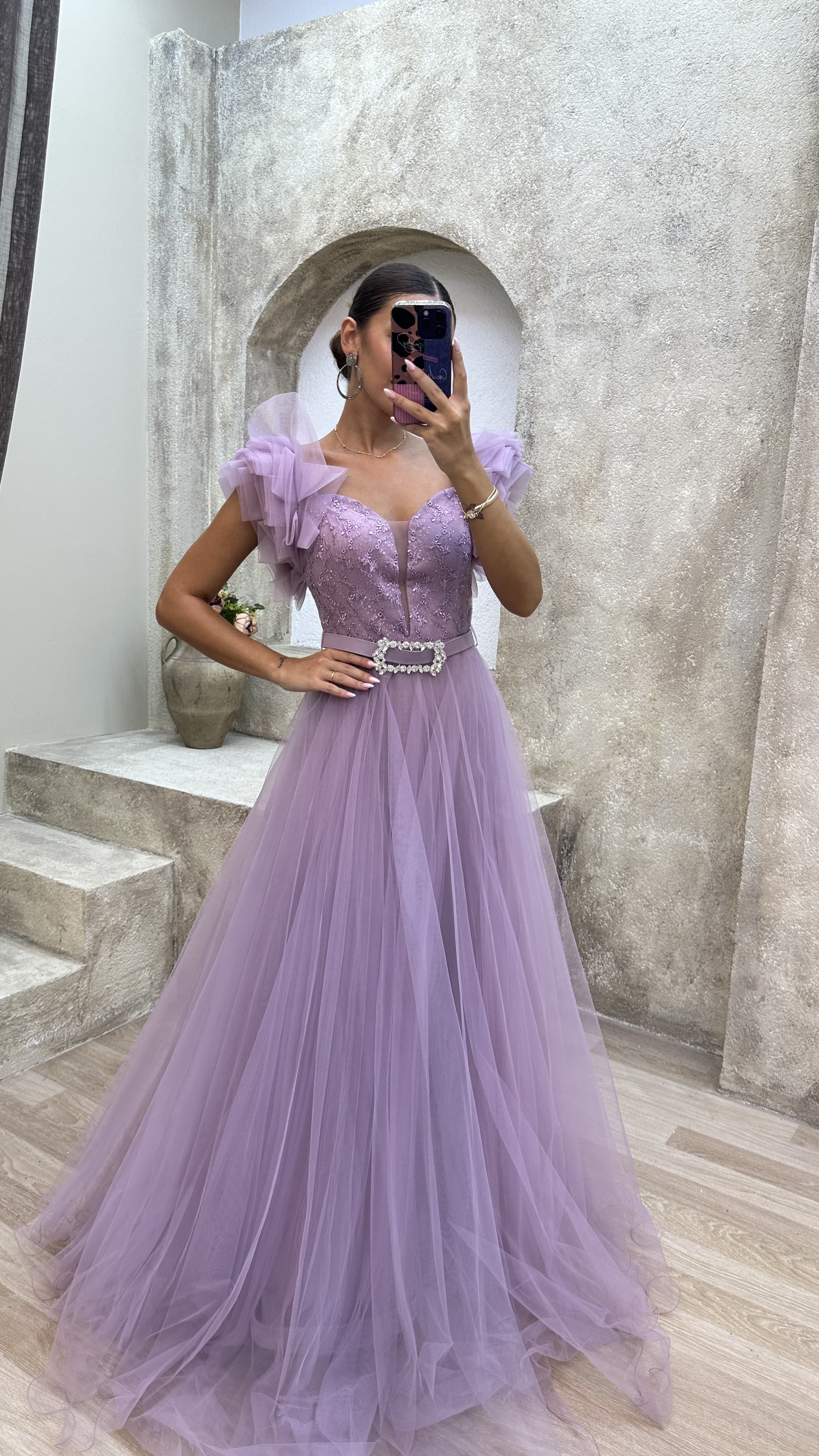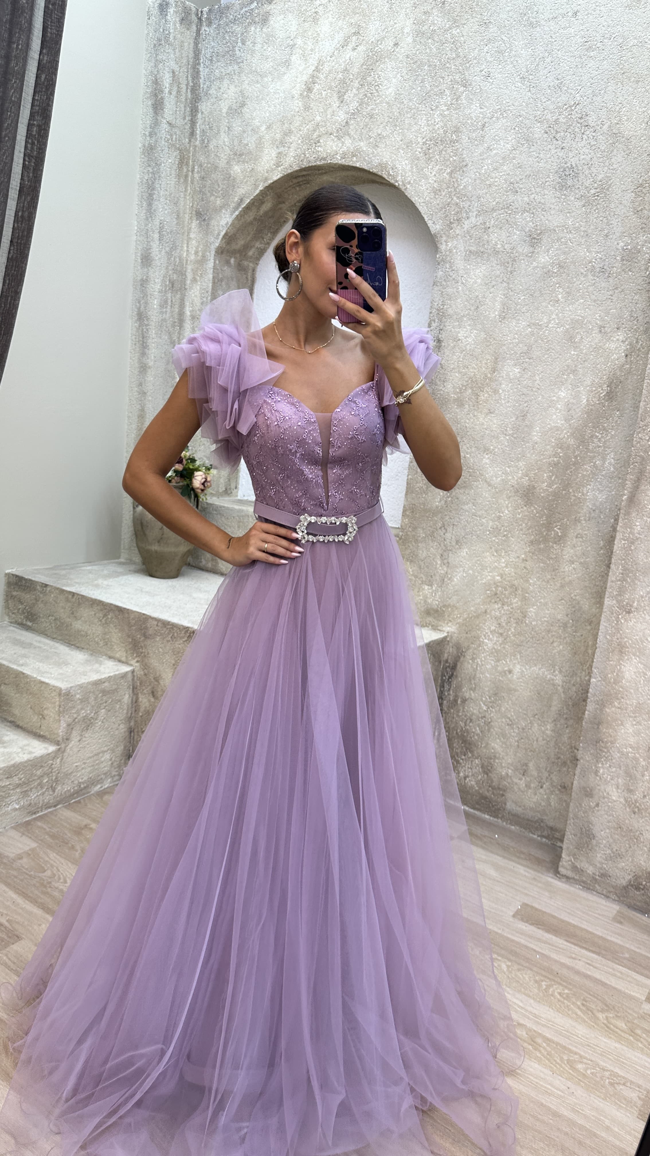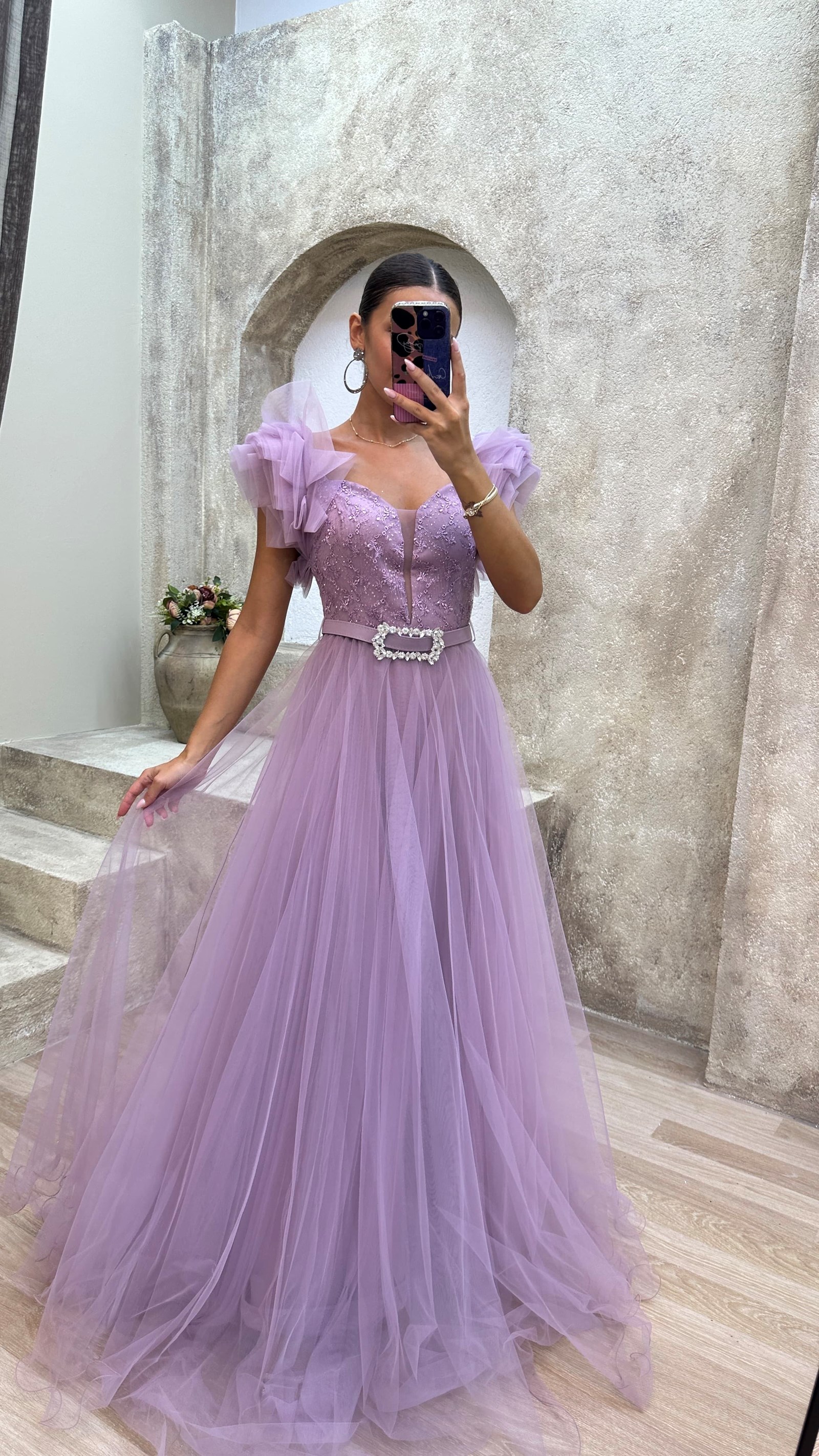 • Pudra Omuz Detay Göğsü İşlemeli Tül Abiye Elbise