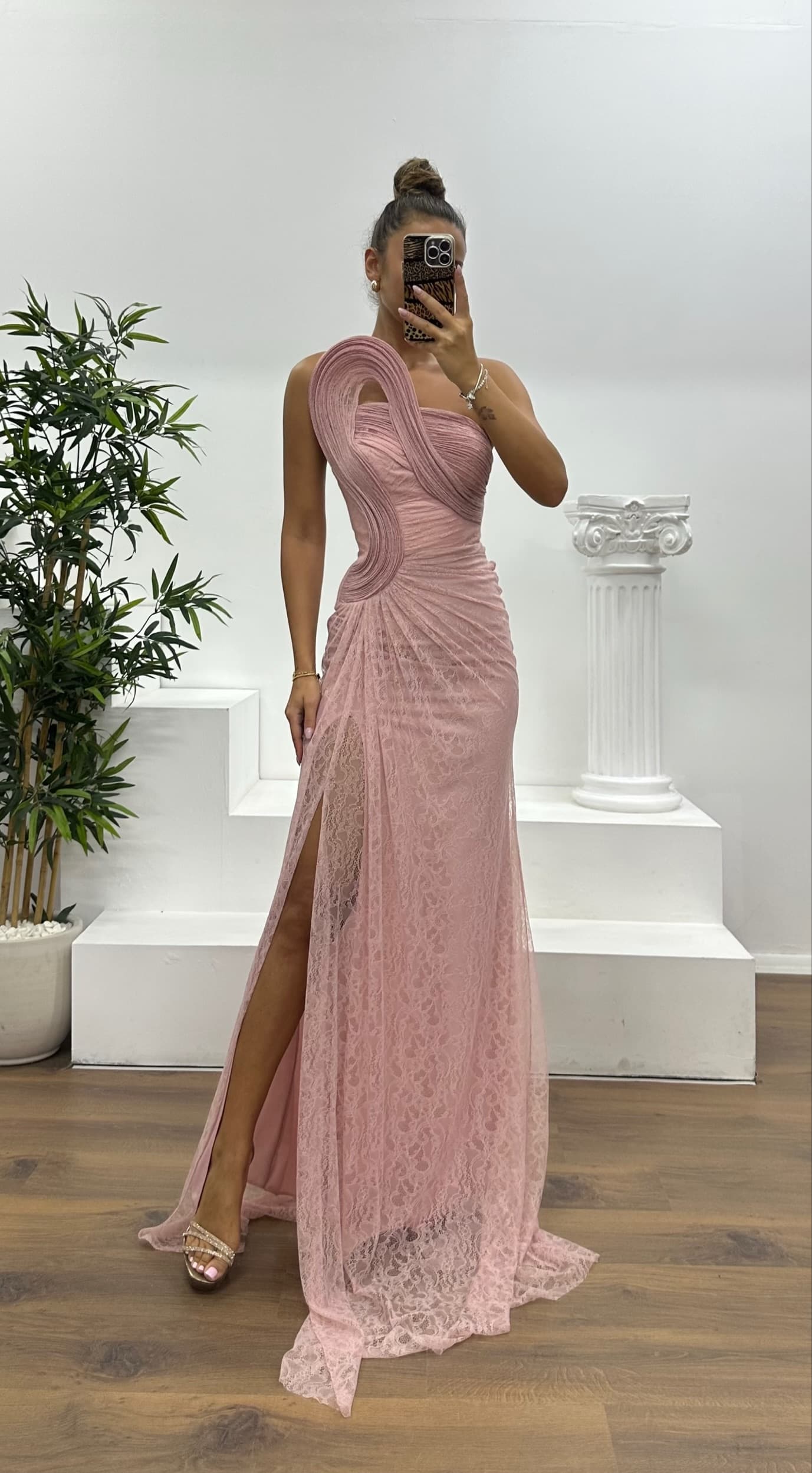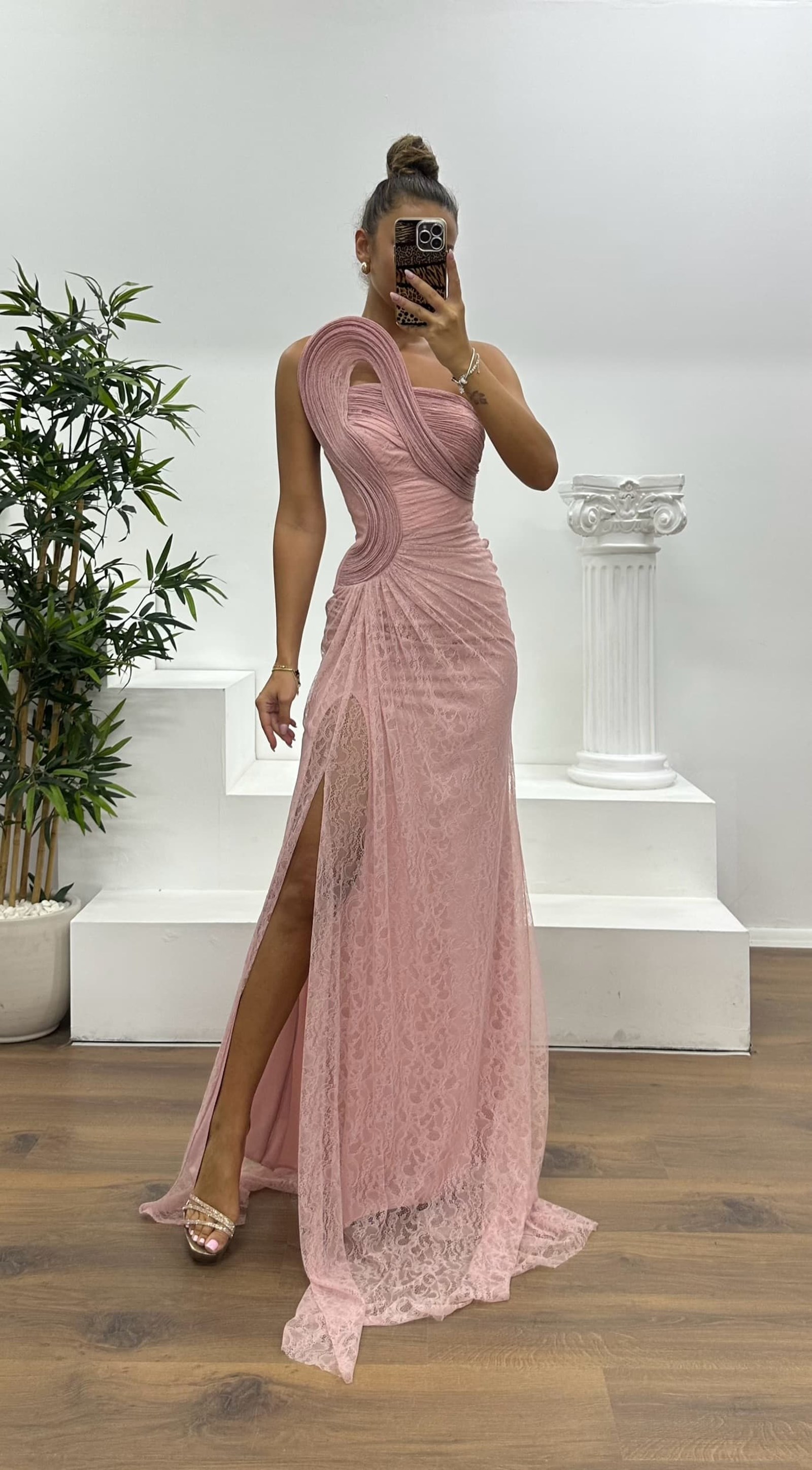 Ürün 36-44 bedene kadar uyumlu, göğüs pedli, astarlı, arka kapama fermuar, yırtmaçlı abiye olarak tasarlanmıştır.