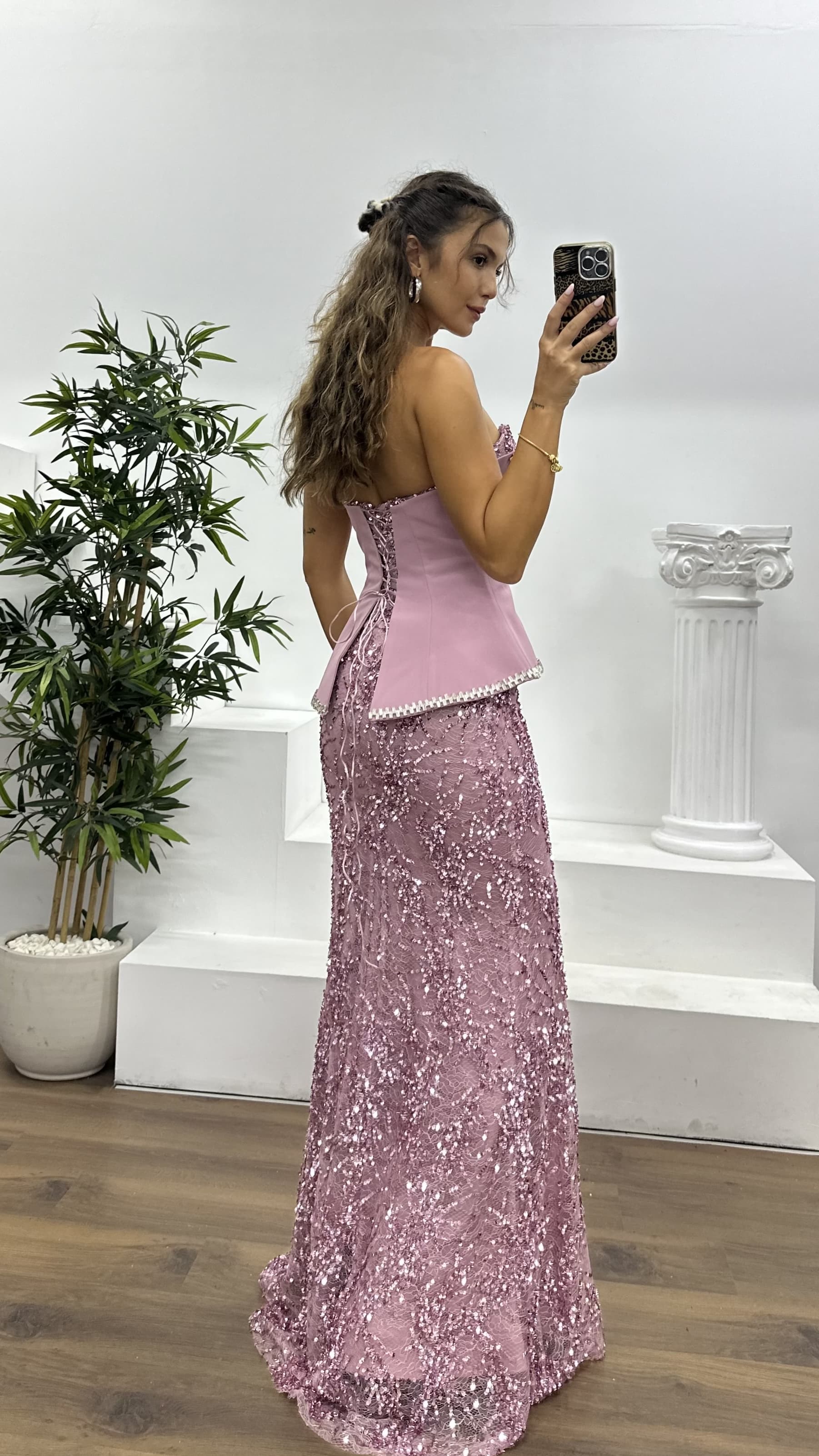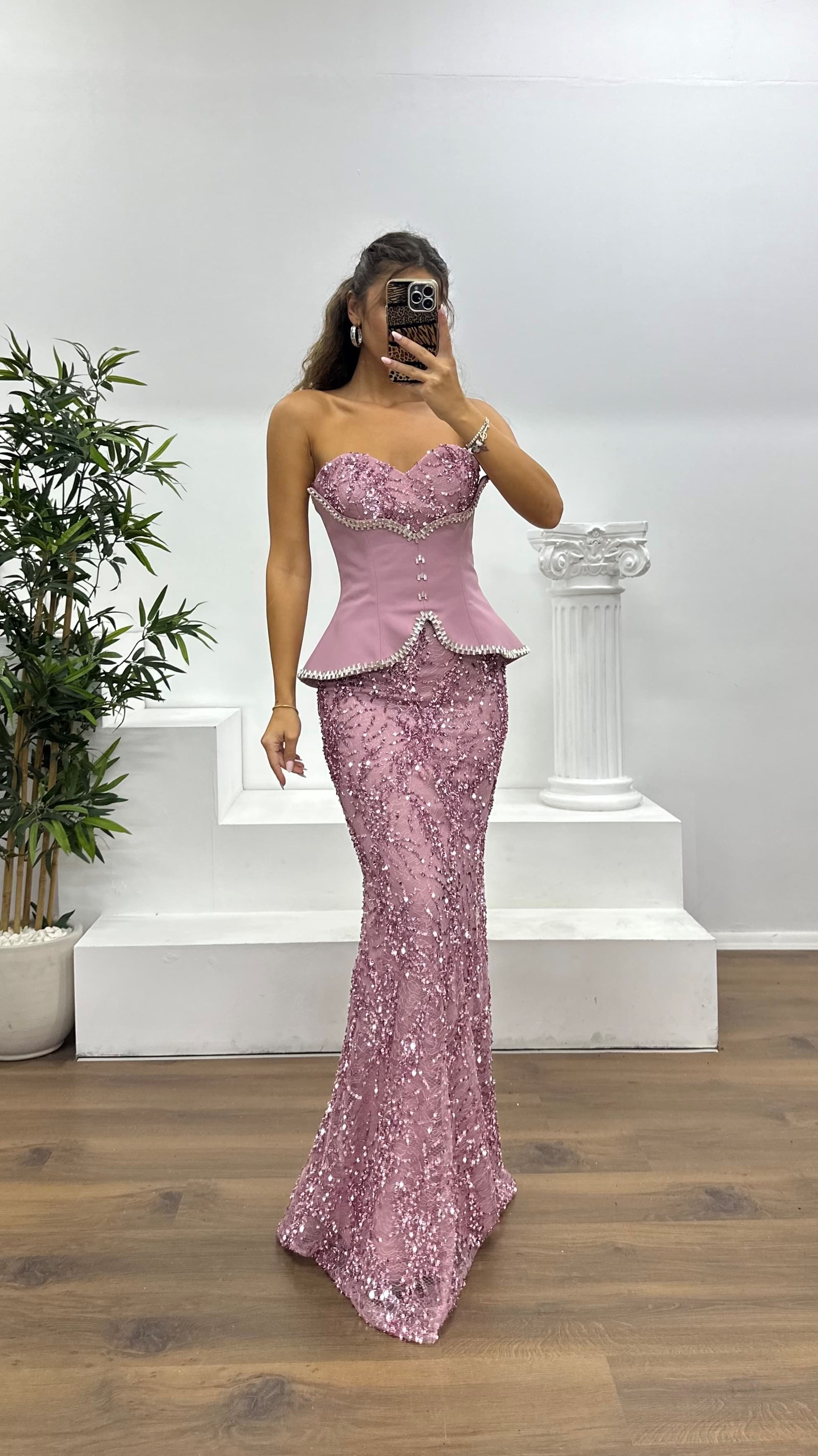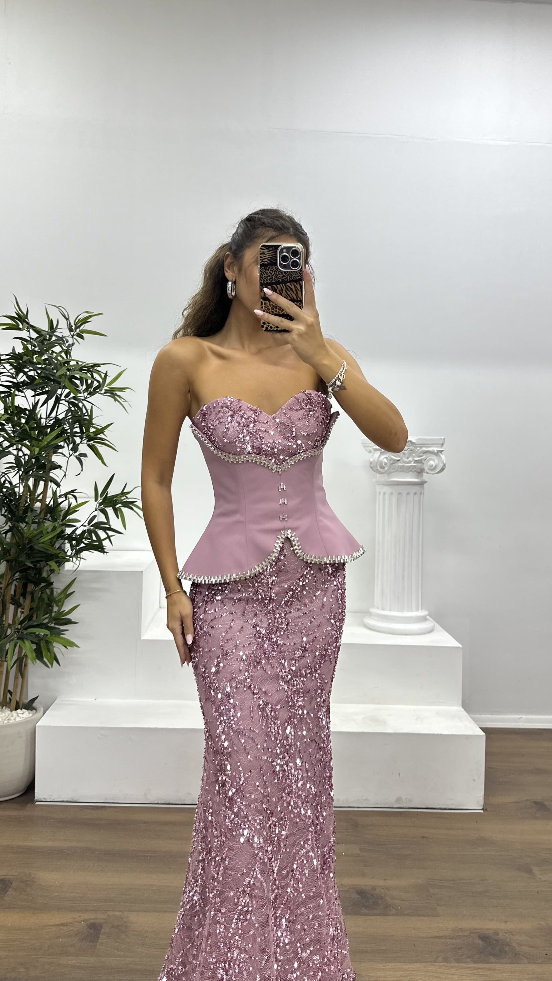 Ürün 36-44 bedene kadar uyumlu, göğüs pedli, astarlı, fermuarlı, sırt capraz ip bağlamalı korse, işlemeli abiye olarak tasarlanmıştır.
