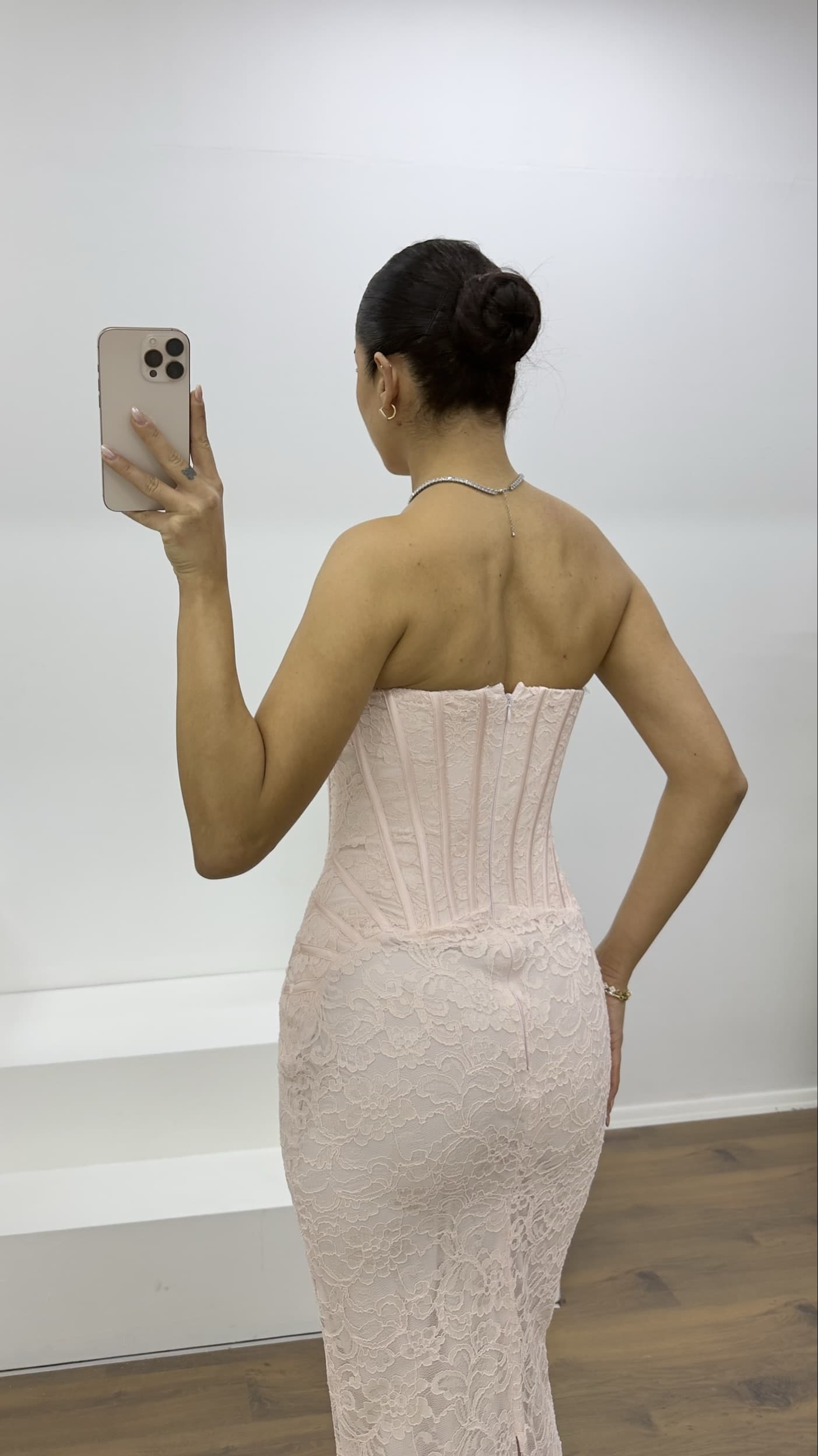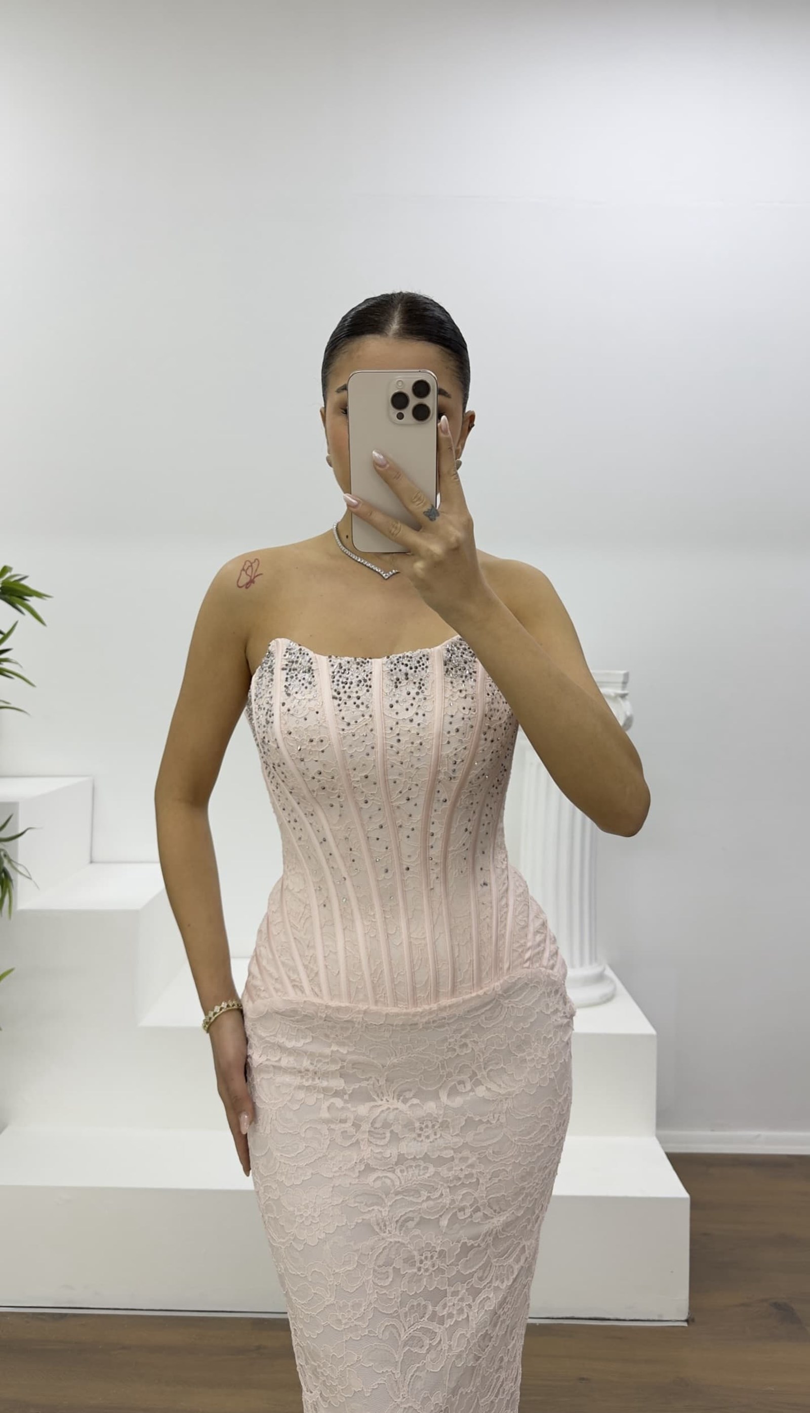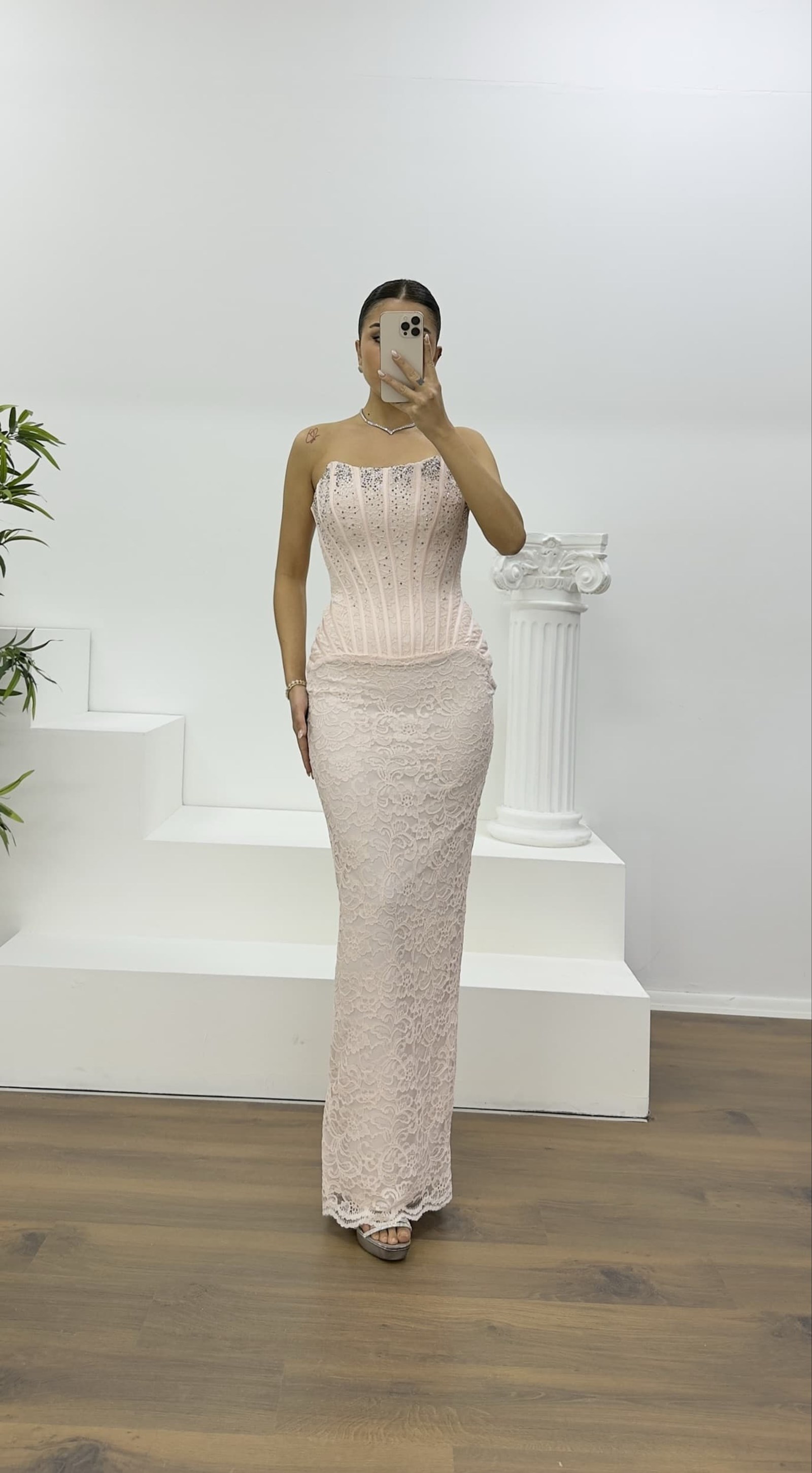 • Pudra Straplez Taş Detay Dantel Abiye Elbise