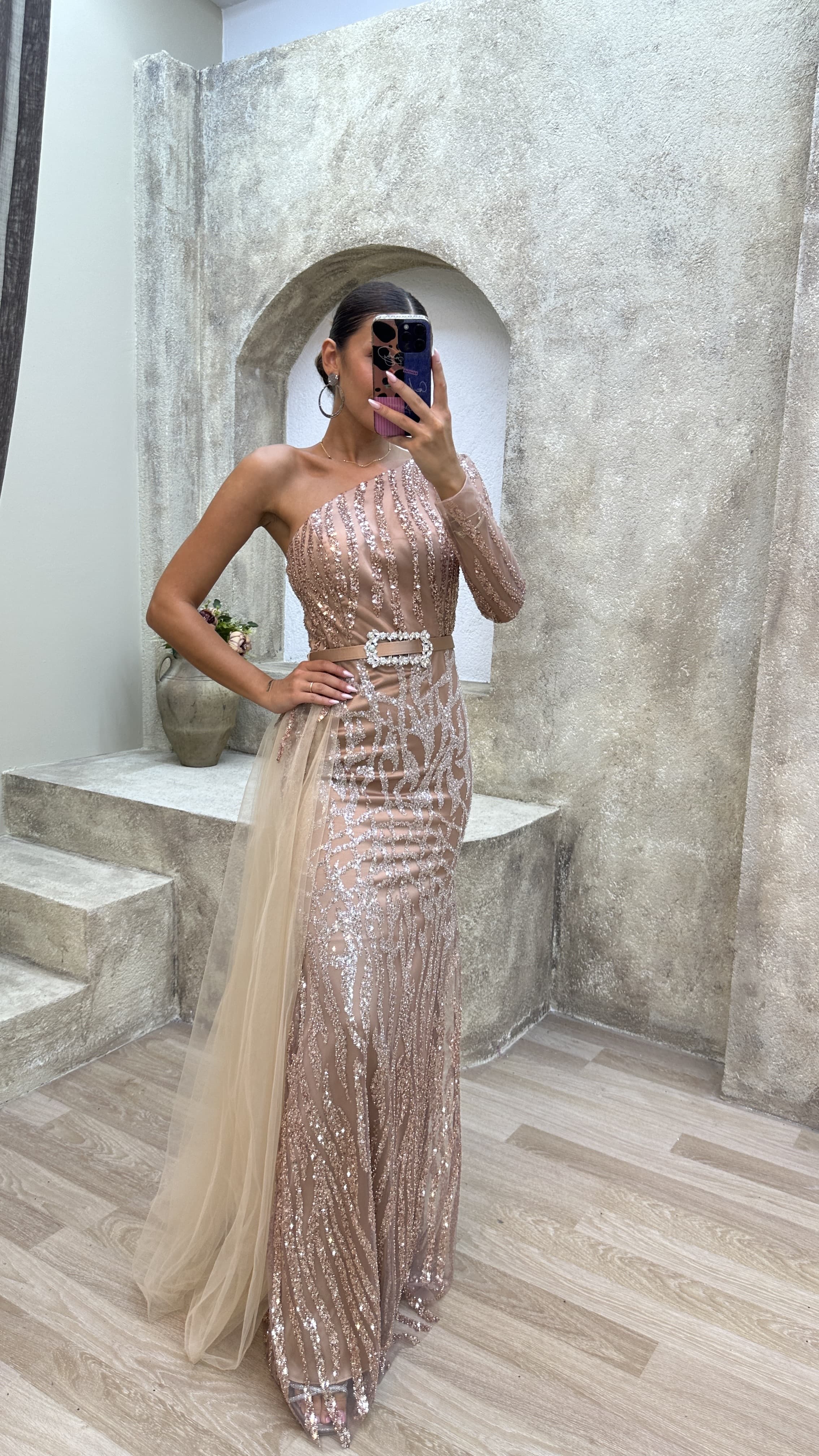 • Pudra Tek Kol İşlemeli Kemerli Abiye Elbise