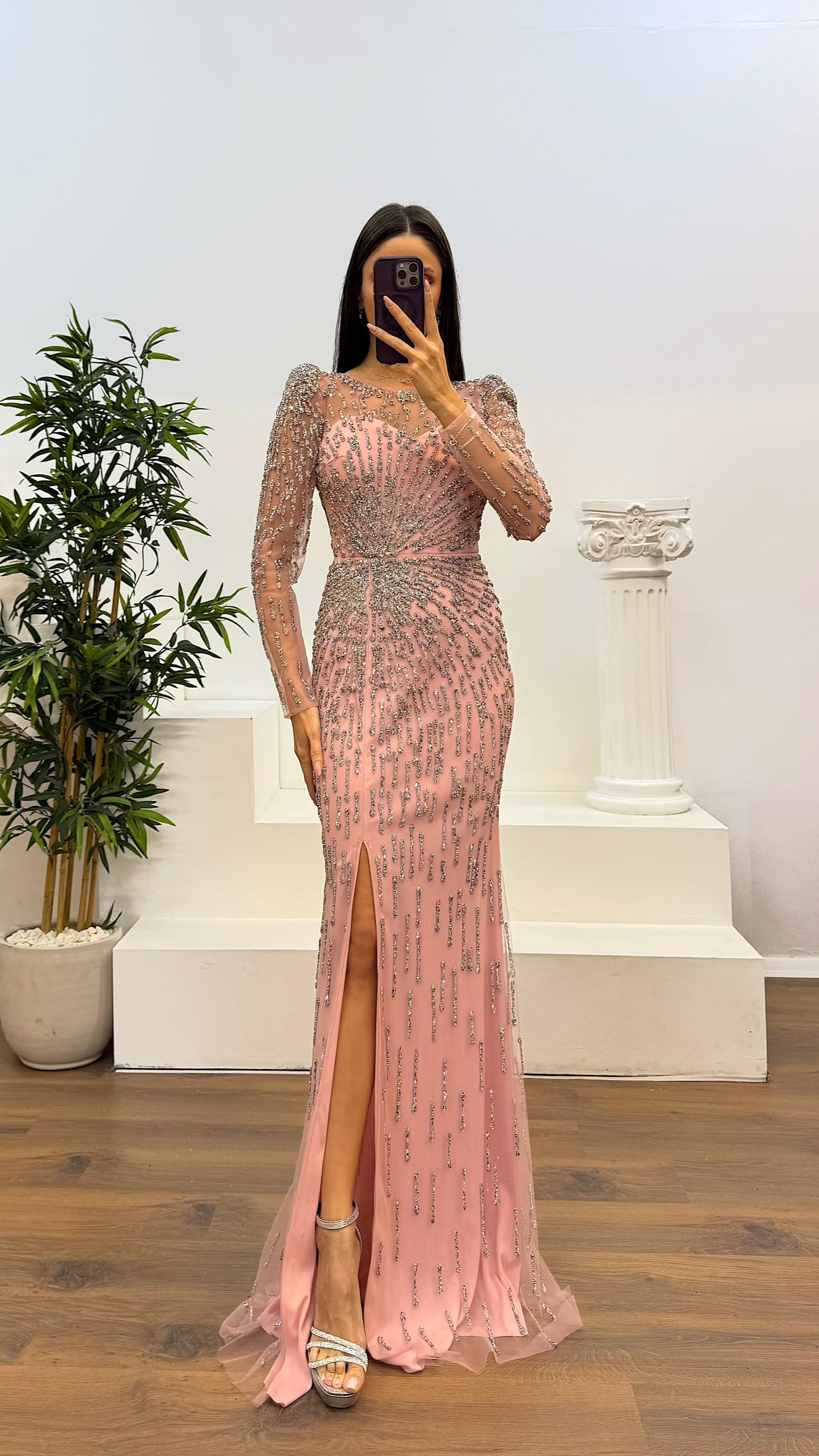 • Pudra Transparan Detay İşleme Detay Abiye Elbise