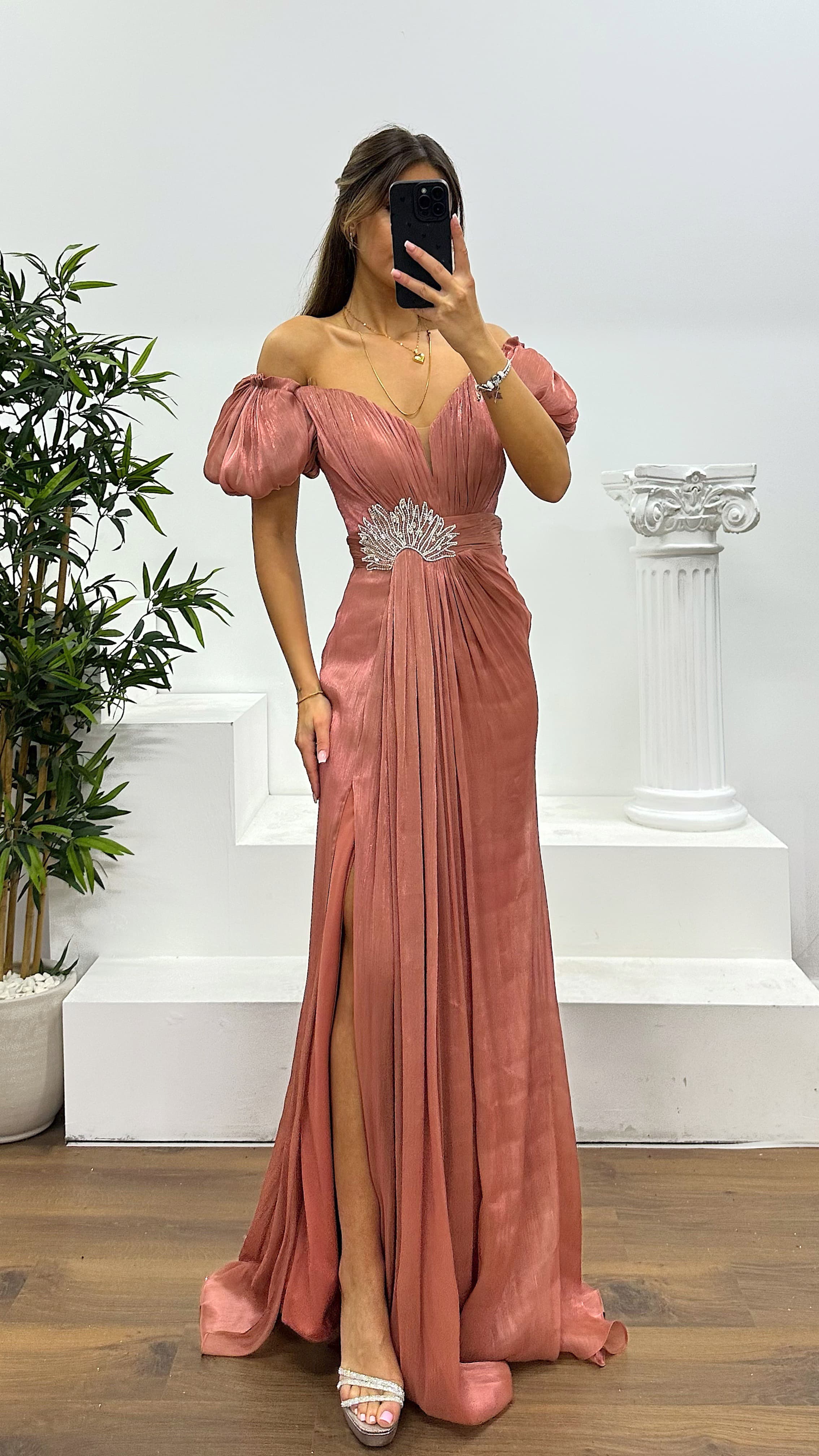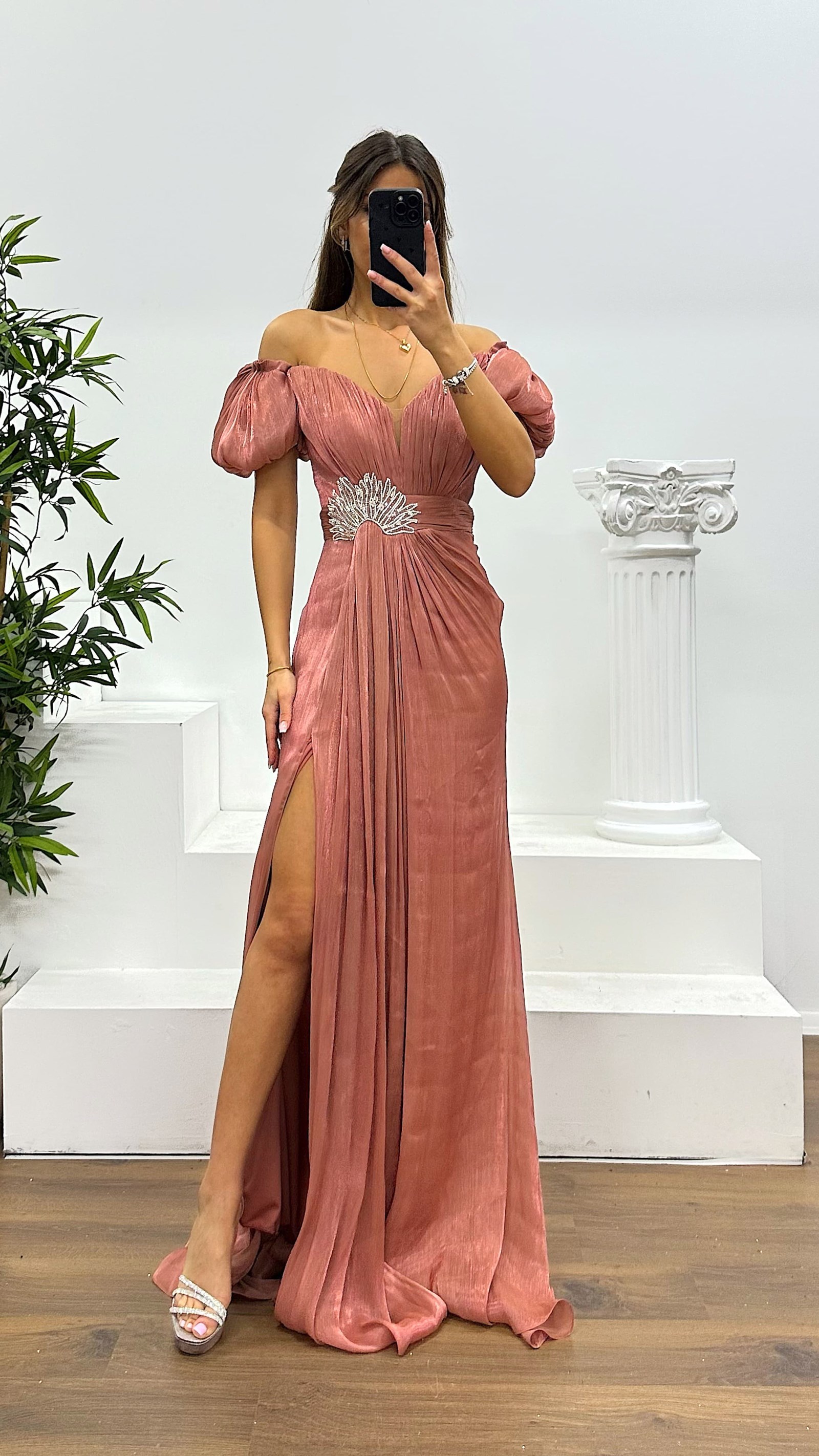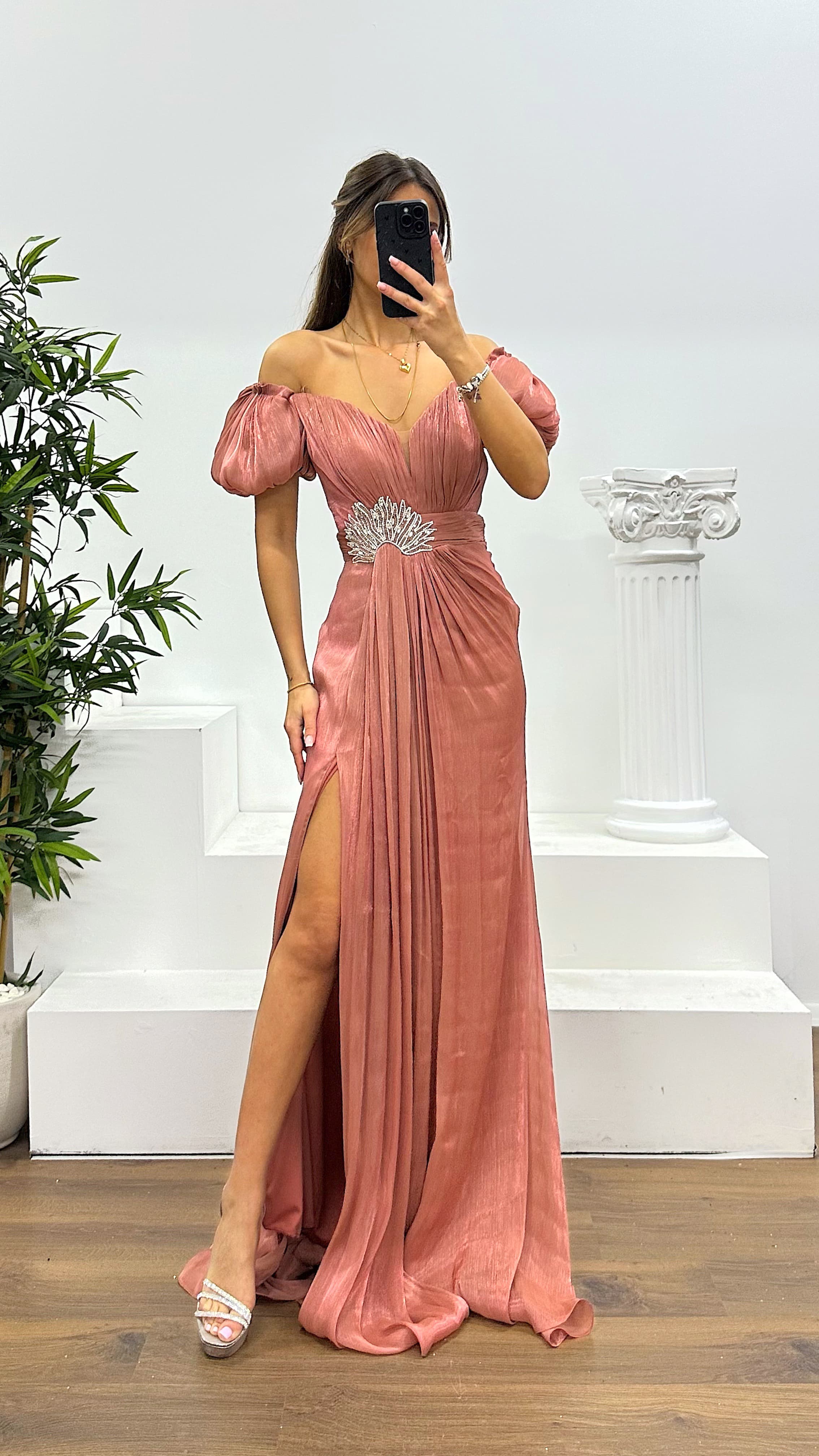 • Rose Balon Kol Taş Detay Abiye Elbise